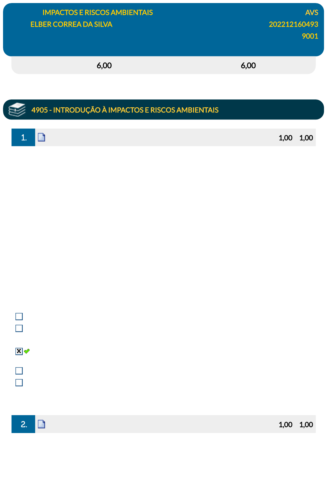 Disciplina: IMPACTOS E RISCOS AMBIENTAIS AVS Aluno: ELBER CORREA DA SILVA 202212160493 Turma: 9001 DGT0397_AVS_202212160493 (AG) 24/03/2024 12:17:20 (F) Avaliação: 6,00 pts Nota SIA: 6,00 pts 4905 - INTRODUÇÃO À IMPACTOS E RISCOS AMBIENTAIS 1. Ref.: 7800872 Pontos: 1,00 / 1,00 O desmatamento do Cerrado é um grave problema ambiental. Causado, principalmente pela expansão das atividades agrícolas e pela agropecuária. O desmatamento pode acarretar graves desequilíbrios ambientais. Um deles é a compactação dos solos que traz uma série de modi�cações nos solos como retenção de água e resistência à penetração de raízes. Analise as asserções I e II sobre a I. A compactação do solo pode ser vista como uma forma de poluição pois causa diversas modi�cações ao solo. Porque II. A modi�cação do solo através do esgotamento, destruição, poluição dos recursos naturais e dos ecossistemas é prejudicial à manutenção dos ciclos. A respeito dessas asserções, assinale a opção correta. A asserção I é uma proposição falsa, e a II é uma proposição verdadeira. As asserções I e II são proposições verdadeiras, e a II é uma justi�cativa correta da I. As asserções I e II são proposições verdadeiras, mas a II não é uma justi�cativa correta da I. As asserções I e II são proposições falsas. A asserção I é uma proposição verdadeira, e a II é uma proposição falsa. 2. Ref.: 7800813 Pontos: 1,00 / 1,00 O Mapa de Riscos é a representação grá�ca dos riscos de acidentes nos diversos locais de trabalho, inerentes ou não ao processo produtivo, que conforme Portaria nº 05/1992 é obrigatório para empresas com grau de risco e número de empregados que exijam a 21/05/24, 15:09 EPS https://simulado.estacio.br/alunos/ 1/6 javascript:alert('C%C3%B3digo da quest%C3%A3o: 7800872.'); javascript:alert('C%C3%B3digo da quest%C3%A3o: 7800872.'); javascript:alert('C%C3%B3digo da quest%C3%A3o: 7800813.'); javascript:alert('C%C3%B3digo da quest%C3%A3o: 7800813.'); constituição de uma CIPA. Para realizar o mapa de riscos é utilizado um código com cores para identi�car as categorias dos riscos. Diante da a�rmação acima, as cores utilizadas no mapa e risco são: Verde, Vermelha, Cinza, Preta e Amarela. Azul, Amarelo, Marrom, Verde e Vermelha. Azul, Amarelo, Preta, Verde e Vermelha. Verde, Vermelha, Cinza, Amarela e Azul. Azul, Amarelo, Preta, Laranja e Vermelha. 4906 - POLÍTICA E LEGISLAÇÃO PERTINENTE A IMPACTOS E RISCOS AMBIENTAIS 3. Ref.: 7710443 Pontos: 1,00 / 1,00 Sobre a relação entre Poder Público e o meio ambiente, analise as a�rmativas a seguir. I. Cabe ao Poder Público preservar e restaurar os processos ecológicos essenciais e prover o manejo ecológico das espécies e ecossistemas. II. Cabe ao Poder Público �scalizar as entidades dedicadas à pesquisa e manipulação de material genético. III. Cabe ao Poder Público solicitar o licenciamento ambiental das atividades e empreendimentos. Está correto o que se a�rma em: II e III I e II II, somente I, II e III I e III 4. Ref.: 7710956 Pontos: 1,00 / 1,00 Analise as a�rmativas a seguir. I. Para realizar o processo de licenciamento no âmbito federal o empreendedor deverá primeiramente preencher o Formulário de Caracterização de Atividade. 21/05/24, 15:09 EPS https://simulado.estacio.br/alunos/ 2/6 javascript:alert('C%C3%B3digo da quest%C3%A3o: 7710443.'); javascript:alert('C%C3%B3digo da quest%C3%A3o: 7710443.'); javascript:alert('C%C3%B3digo da quest%C3%A3o: 7710956.'); javascript:alert('C%C3%B3digo da quest%C3%A3o: 7710956.'); II. O segundo passo para solicitar o licenciamento será por parte do Ibama que identi�ca os impactos e aspectos dos empreendimentos ou atividades que precisam ser avaliados. III. A terceira etapa é a elaboração do estudo ambiental que deverá ser realizada pelo Ibama. Está correto o que se a�rma em: II, somente I, somente I, II e III III, somente I e III 4907 - AVALIAÇÃO DE IMPACTO AMBIENTAL 5. Ref.: 7785104 Pontos: 0,00 / 1,00 No âmbito da Avaliação de Impacto Ambiental, a ideia de risco tem dimensão central. Sobre o tema, observe as a�rmativas a seguir: I. Bacia de risco pode ser considerado como um espaço territorial onde existe a convergência de diversos tipos de riscos. II. Um sistema de risco pode ser caracterizado quando o risco está interligado a outros, no espaço e/ou no tempo. III. Riscos ambientais é o resultado da associação dos riscos naturais, atividade produtiva e crescimento demográ�co Está correto o que se a�rma em: I, II e III. I e II, apenas. II, apenas. II e III, apenas. I e III, apenas. 21/05/24, 15:09 EPS https://simulado.estacio.br/alunos/ 3/6 javascript:alert('C%C3%B3digo da quest%C3%A3o: 7785104.'); javascript:alert('C%C3%B3digo da quest%C3%A3o: 7785104.'); 6. Ref.: 7784720 Pontos: 1,00 / 1,00 O agronegócio, a cada dia recebe incremento de novas tecnologias como por exemplo o método Ambitec-agro que pode ser introduzido em aspectos ecológicos do agronegócio para reprodução de animais, como é o caso do Ambitec Produção Animal. Pode ser na agroindustrial, como Ambitec Agroindústria, é também e no campo da pecuária com a agropecuária, conhecido como Ambitec - Agro. Para sua implementação, quais aspectos de avaliação devem ser considerados? Uso de insumos e recursos, qualidade ambiental, lucro, renda, vendas, saúde e administração. Uso de recursos não renováveis, qualidade ambiental, venda, lucro, ganhos e perdas. Lucro, renda, venda, bem-estar, saúde, administração e gestão. Recursos naturais, degradação ambiental, respeito ao consumidor, renda, saúde, gestão. Uso de insumos e recursos, qualidade ambiental, respeito ao consumidor, emprego, renda, saúde, gestão e administração. 4908 - ESTUDOS DE IMPACTO AMBIENTAL 7. Ref.: 7795797 Pontos: 0,00 / 1,00 Com o objetivo de evoluir em aspectos relevantes do seu desempenho ambiental, empreendimento empresas/ind