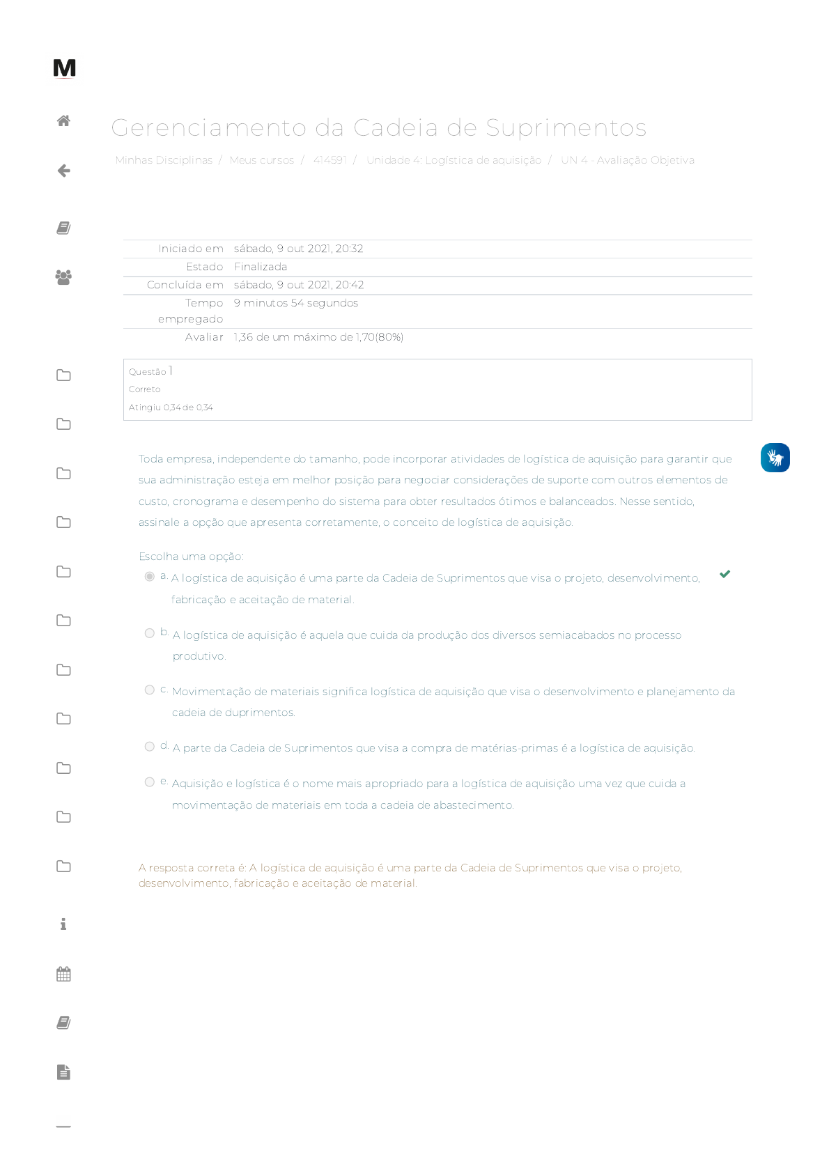 28/01/2022 08:45 UN 4 - Avaliação Objetiva: Revisão da tentativa https://avap.multivix.edu.br/mod/quiz/review.php?attempt=462508&cmid=644609 1/5 Minhas Disciplinas / Meus cursos / 414591 / Unidade 4: Logística de aquisição / UN 4 - Avaliação Objetiva Gerenciamento da Cadeia de Suprimentos Iniciado em sábado, 9 out 2021, 20:32 Estado Finalizada Concluída em sábado, 9 out 2021, 20:42 Tempo empregado 9 minutos 54 segundos Avaliar 1,36 de um máximo de 1,70(80%) Questão 1 Correto Atingiu 0,34 de 0,34 Toda empresa, independente do tamanho, pode incorporar atividades de logística de aquisição para garantir que sua administração esteja em melhor posição para negociar considerações de suporte com outros elementos de custo, cronograma e desempenho do sistema para obter resultados ótimos e balanceados. Nesse sentido, assinale a opção que apresenta corretamente, o conceito de logística de aquisição. Escolha uma opção: a. A logística de aquisição é uma parte da Cadeia de Suprimentos que visa o projeto, desenvolvimento, fabricação e aceitação de material. b. A logística de aquisição é aquela que cuida da produção dos diversos semiacabados no processo produtivo. c. Movimentação de materiais signi�ca logística de aquisição que visa o desenvolvimento e planejamento da cadeia de duprimentos. d. A parte da Cadeia de Suprimentos que visa a compra de matérias-primas é a logística de aquisição. e. Aquisição e logística é o nome mais apropriado para a logística de aquisição uma vez que cuida a movimentação de materiais em toda a cadeia de abastecimento. A resposta correta é: A logística de aquisição é uma parte da Cadeia de Suprimentos que visa o projeto, desenvolvimento, fabricação e aceitação de material. https://avap.multivix.edu.br/my/ https://avap.multivix.edu.br/course/view.php?id=9656 https://avap.multivix.edu.br/course/view.php?id=9656§ion=5 https://avap.multivix.edu.br/mod/quiz/view.php?id=644609 https://avap.multivix.edu.br/my/ https://avap.multivix.edu.br/course/view.php?id=9656 https://avap.multivix.edu.br/user/index.php?id=9656 https://avap.multivix.edu.br/course/view.php?id=9656§ion=1 https://avap.multivix.edu.br/course/view.php?id=9656§ion=2 https://avap.multivix.edu.br/course/view.php?id=9656§ion=3 https://avap.multivix.edu.br/course/view.php?id=9656§ion=4 https://avap.multivix.edu.br/course/view.php?id=9656§ion=5 https://avap.multivix.edu.br/course/view.php?id=9656§ion=6 https://avap.multivix.edu.br/course/view.php?id=9656§ion=7 https://avap.multivix.edu.br/course/view.php?id=9656§ion=8 https://avap.multivix.edu.br/course/view.php?id=9656§ion=9 https://avap.multivix.edu.br/course/view.php?id=9656§ion=10 https://avap.multivix.edu.br/course/view.php?id=9656§ion=11 https://avap.multivix.edu.br/mod/page/view.php?id=1252%2F%22%20target%3D%22_blank https://avap.multivix.edu.br/calendar/view.php/ https://avap.multivix.edu.br/local/staticpage/view.php?page=biblioteca https://portalweb.multivix.edu.br/gabaritos/login.aspx https://multivix.edu.br/office-365/ https://avap.multivix.edu.br/ 28/01/2022 08:45 UN 4 - Avaliação Objetiva: Revisão da tentativa https://avap.multivix.edu.br/mod/quiz/review.php?attempt=462508&cmid=644609 2/5 Questão 2 Correto Atingiu 0,34 de 0,34 Analise as a�rmativas a seguire que dizem repeito ao posicionamento da empresa, enquanto cliente, junto ao fornecedor. I – Pagar sempre a tempo signi�ca que a empresa pode negociar os termos de pagamento favoráveis antes de fazer um pedido, mas, depois que o pedido for feito, não deve renegar ou tentar alterar as regras contratuais. II – Tentar dar aos fornecedores o maior tempo possível em seus pedidos, a menos que exista uma razão convincente e competitiva para não compartilhá-las refere-se a fornecer tempos de espera adequados. III – Compartilhar informações signi�ca visitar os escritórios dos fornecedores, incluindo-os em algumas das reuniões estratégicas. Após a análise, assinale a opção correta. Escolha uma opção: a. As a�rmativas II e III estão certas. b. Apenas a a�rmativa III está certa. c. As a�rmativas I e II estão certas. d. Apenas a a�rmativa I está certa. e. As a�rmativas I e III estão certas. A resposta correta é: As a�rmativas I e II estão certas. https://avap.multivix.edu.br/my/ https://avap.multivix.edu.br/course/view.php?id=9656 https://avap.multivix.edu.br/user/index.php?id=9656 https://avap.multivix.edu.br/course/view.php?id=9656§ion=1 https://avap.multivix.edu.br/course/view.php?id=9656§ion=2 https://avap.multivix.edu.br/course/view.php?id=9656§ion=3 https://avap.multivix.edu.br/course/view.php?id=9656§ion=4 https://avap.multivix.edu.br/course/view.php?id=9656§ion=5 https://avap.multivix.edu.br/course/view.php?id=9656§ion=6 https://avap.multivix.edu.br/course/view.php?id=9656§ion=7 https://avap.multivix.edu.br/course/view.php?id=9656§ion=8 https://avap.multivix.edu.br/course/view.php?id=9656§ion=9 https://avap.multivix.edu.br/course/view.php?id=9656§ion=10 https://avap.multivix.edu.br/course/view.php?id=9656§ion=11 https://avap.multivix.edu.br/mod/page/view.php?id=1252%2F%22%20target%3D%22_blank https://avap.multivix.edu.br/calendar/view.php/ https://avap.multivix.edu.br/local/staticpage/view.php?page=biblioteca https://portalweb.multivix.edu.br/gabaritos/login.aspx https://multivix.edu.br/office-365/ https://avap.multivix.edu.br/ 28/01/2022 08:45 UN 4 - Avaliação Objetiva: Revisão da tentativa https://avap.multivix.edu.br/mod/quiz/review.php?attempt=462508&cmid=644609 3/5 Questão 3 Incorreto Atingiu 0,00 de 0,34 Analise as a�rmativas a seguir sobre o Gerenciamento de Relacionamento com Fornecedores, da sigla em inglês Supplier Relationship Management (SRM): I – Os relacionamentos precisam ser estratégicos, precisam ser focados no crescimento. Isso é algo que os gerentes e gerentes seniores nunca devem esquecer, quer estejam comprando materiais físicos ou soft