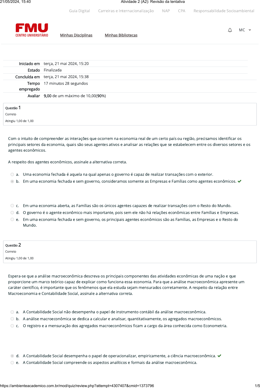 Iniciado em terça, 21 mai 2024, 15:20 Estado Finalizada Concluída em terça, 21 mai 2024, 15:38 Tempo empregado 17 minutos 28 segundos Avaliar 9,00 de um máximo de 10,00(90%) Questão 1 Correto Atingiu 1,00 de 1,00 Questão 2 Correto Atingiu 1,00 de 1,00 Com o intuito de compreender as interações que ocorrem na economia real de um certo país ou região, precisamos identi�car os principais setores da economia, quais são seus agentes ativos e analisar as relações que se estabelecem entre os diversos setores e os agentes econômicos. A respeito dos agentes econômicos, assinale a alternativa correta. a. Uma economia fechada é aquela na qual apenas o governo é capaz de realizar transações com o exterior. b. Em uma economia fechada e sem governo, consideramos somente as Empresas e Famílias como agentes econômicos. c. Em uma economia aberta, as Famílias são os únicos agentes capazes de realizar transações com o Resto do Mundo. d. O governo é o agente econômico mais importante, pois sem ele não há relações econômicas entre Famílias e Empresas. e. Em uma economia fechada e sem governo, os principais agentes econômicos são as Famílias, as Empresas e o Resto do Mundo. Espera-se que a análise macroeconômica descreva os principais componentes das atividades econômicas de uma nação e que proporcione um marco teórico capaz de explicar como funciona essa economia. Para que a análise macroeconômica apresente um caráter cientí�co, é importante que os fenômenos que ela estuda sejam mensurados corretamente. A respeito da relação entre Macroeconomia e Contabilidade Social, assinale a alternativa correta. a. A Contabilidade Social não desempenha o papel de instrumento contábil da análise macroeconômica. b. A análise macroeconômica se dedica a calcular e analisar, quantitativamente, os agregados macroeconômicos. c. O registro e a mensuração dos agregados macroeconômicos �cam a cargo da área conhecida como Econometria. d. A Contabilidade Social desempenha o papel de operacionalizar, empiricamente, a ciência macroeconômica. e. A Contabilidade Social compreende os aspectos analíticos e formais da análise macroeconômica. Guia Digital Carreiras e Internacionalização NAP CPA Responsabilidade Socioambiental Minhas Disciplinas Minhas Bibliotecas MC 21/05/2024, 15:40 Atividade 2 (A2): Revisão da tentativa https://ambienteacademico.com.br/mod/quiz/review.php?attempt=4307407&cmid=1373796 1/5 https://codely-fmu-content.s3.amazonaws.com/Moodle/GuiaDigital/Guia+digital/index.html https://carreiras.fmu.br/ https://codely-fmu-content.s3.amazonaws.com/Moodle/NAP/inicial/nap/fmu/index.html https://codely-fmu-content.s3.amazonaws.com/Moodle/CPA/landing_CPA/index.html https://portal.fmu.br/sustentabilidade https://ambienteacademico.com.br/ https://ambienteacademico.com.br/ https://ambienteacademico.com.br/course/view.php?id=236 Questão 3 Correto Atingiu 1,00 de 1,00 Questão 4 Correto Atingiu 1,00 de 1,00 Além das di�culdades de caráter técnico, operacional e conceitual enfrentadas pela Contabilidade Social, uma outra limitação importante consiste na disponibilidade de dados primários con�áveis para a elaboração das estimativas macroeconômicas, que nem sempre são de fácil acesso. A respeito das di�culdades empíricas enfrentadas pela Contabilidade Social, avalie as a�rmativas a seguir e assinale V para a(s) Verdadeira(s) e F para a(s) Falsa(s). I. ( ) Dados empíricos con�áveis e transparentes são sempre disponibilizados pelas agências governamentais. II. ( ) Nem sempre um determinado país conta com ferramentas adequadas para a coleta e o acompanhamento dos dados econômicos. III. ( ) A baixa qualidade ou mesmo ausência dos dados primários pode ser totalmente compensada por dados estimados. IV. ( ) A operacionalização empírica da análise macroeconômica requer o emprego de dados con�áveis. Assinale a alternativa que apresenta a sequência correta. a. V, V, F, V. b. V, V, F, F. c. V, V, V, F. d. F, V, F, V. e. F, F, F, F. Leia o excerto a seguir. "[...] na medida em que há atividades de compra e venda e de produção de bens e serviços que não se dão por meio de empresas o�cialmente constituídas, surge o problema de como mensurá-las, isto é, de como incorporar o valor por elas produzido ao valor do produto agregado. A di�culdade é operacional porque, na medida em que tais empresas não existem o�cialmente, e há, por isso mesmo, certo receio em prestar informações, �ca um tanto difícil identi�cá-las, localizá-las e levantar os dados necessários. As empresas não o�cialmente constituídas podem se dedicar a atividades legais, como ocorre normalmente quando as famílias tornam- se produtoras, e a atividades ilegais, como contrabando, trá�co de drogas e prostituição". PAULANI, Leda Maria; BRAGA, Márcio Bobik. A Nova Contabilidade Social: uma introdução à macroeconomia. São Paulo: Saraiva, 2012. p. 157. Considerando o excerto apresentado, sobre a di�culdade operacional para a Contabilidade Social representada por atividades informais ou ilegais, assinale a alternativa correta. a. É sempre possível estimar valores para os produtos de atividades informais ou ilegais. b. Atividades tais como o trá�co de drogas apresentam di�culdades técnicas para a Contabilidade Social. c. A produção agrícola de subsistência se enquadra no caso da atividade econômica informal. d. As externalidades negativas decorrentes da exploração ambiental representam di�culdades operacionais. e. A renda produzida por atividades de natureza ilegal costuma ser praticamente inacessível. Guia Digital Carreiras e Internacionalização NAP CPA Responsabilidade Socioambiental Minhas Disciplinas Minhas Bibliotecas MC 21/05/2024, 15:40 Atividade 2 (A2): Revisão da tentativa https://ambienteacademico.com.br/mod/quiz/review.php?attempt=4307407&cmid=1373796 2/5 https://codely-fmu-content.s3.amazonaws.com/Moodle/GuiaDi