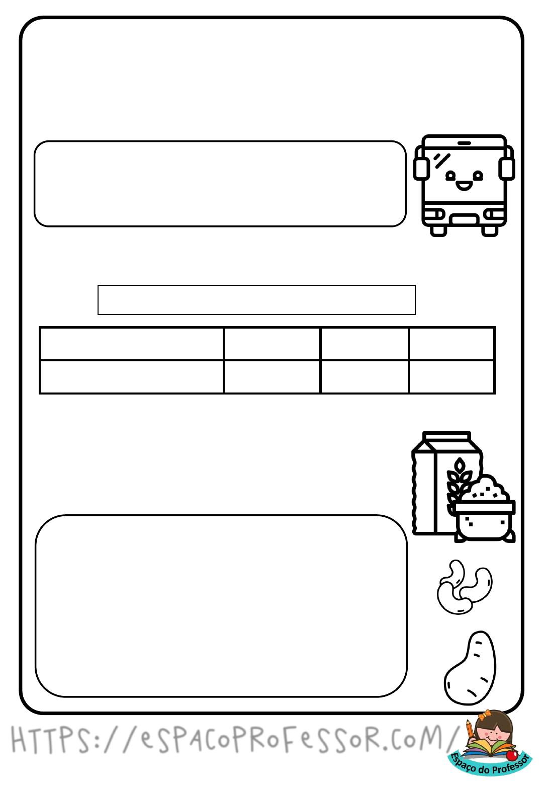 NOME:________________________ DATA:____/____/____ https://espacoprofessor.com/ 1. Em uma escola, há 192 alunos. Para um passeio foram divididos em 08 grupos iguais. Quantos alunos há em cada grupo. Resolvendo problemas 2. Na mercearia de Mauro chegaram várias mercadorias para serem empacotadas. Mercadorias da Mercearia de Mauro Mercadoria Arroz Feijão Batata Massa( em kg) 798 570 218 Mauro fará pacotes de 5 kg de arroz, pacotes de 2 kg de feijão e pacotes de 2 kg de batata. a) Quantos pacotes ele fará de: arroz?_______ feijão?________ batata?_______ NOME:________________________ DATA:____/____/____ https://espacoprofessor.com/ 1. Observe o preço de uma TV na loja Vende Tudo. Resolvendo problemas Preço total R$ 1200,00 Entrada: R$ 150,oo O restante em 3 prestações iguais Qual o valor da prestação dessa televisão? 2. Uma carrinho de lanches possui 04 sócios que ao final do dia divide os lucros das vendas. Hoje eles venderam um total de R$ 3472,00. Qual será o lucro de cada um? Lanche Bom André estava devendo o Miguel R$ 540,00. Quanto sobrou para ele? Todos os direitos reservados! Conteúdo produzido pelo site Espaço do Professor. Não é autorizado distribuir este arquivo em grupos de WhatsApp, Telegram, Facebook ou demais redes sociais. https://espacoprofessor.com/ Siga nossas redes sociais: Clique na imagem abaixo para baixar mais atividades de alfabetização: https://www.instagram.com/espacodoprofessor/?hl=pt-br https://www.facebook.com/espacoprofessor/? https://www.espacoprofessor.com/