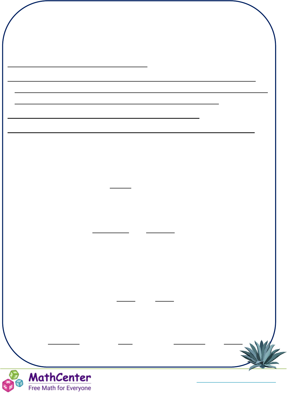 center.org-www.math Nos visite em Copyright © MathCenter 2020 CONVERTER DECIMAL EM FRAÇÃO PÁGINA DE SUPORTE Para converter um decimal em uma fração, siga estas etapas: Etapa 1) Conte o número de casas decimais. Etapa 2) Coloque um 1 mais o número de zeros que existem por casa decimal para o denominador da fração. Se você tiver 2 casas decimais, o denominador seria 100. Se você tiver 4 casas decimais, o denominador seria 10000. Etapa 3) Os dígitos decimais agora se tornam o numerador. Etapa 4) Opcional - você pode reduzir essa fração à sua forma mais simples. Exemplo: 0,815 O número de casas decimais é 3. O denominador será 1000. O numerador será 815. A fração será 815 1000 Para encontrar a forma mais simples, divida o numerador e o denominador por 5 815 ÷ 5 1000 ÷ 5 = 163 200 Exemplo: 2,36 O número de casas decimais é 2. O denominador será 100. O numerador será 36. A fração será 2 36 100 ou 236 100 Para encontrar a forma mais simples, divida o numerador e denominador por 4 2 36 ÷ 4 100 ÷ 4 = 2 9 25 ou 236 ÷ 4 100 ÷ 4 = 59 25 http://www.math-center.org/
