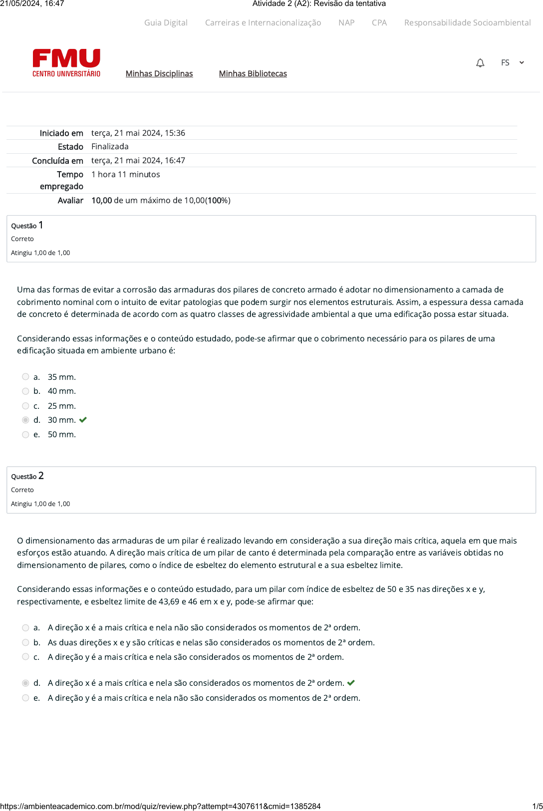 Iniciado em terça, 21 mai 2024, 15:36 Estado Finalizada Concluída em terça, 21 mai 2024, 16:47 Tempo empregado 1 hora 11 minutos Avaliar 10,00 de um máximo de 10,00(100%) Questão 1 Correto Atingiu 1,00 de 1,00 Questão 2 Correto Atingiu 1,00 de 1,00 Uma das formas de evitar a corrosão das armaduras dos pilares de concreto armado é adotar no dimensionamento a camada de cobrimento nominal com o intuito de evitar patologias que podem surgir nos elementos estruturais. Assim, a espessura dessa camada de concreto é determinada de acordo com as quatro classes de agressividade ambiental a que uma edi�cação possa estar situada. Considerando essas informações e o conteúdo estudado, pode-se a�rmar que o cobrimento necessário para os pilares de uma edi�cação situada em ambiente urbano é: a. 35 mm. b. 40 mm. c. 25 mm. d. 30 mm. e. 50 mm. O dimensionamento das armaduras de um pilar é realizado levando em consideração a sua direção mais crítica, aquela em que mais esforços estão atuando. A direção mais crítica de um pilar de canto é determinada pela comparação entre as variáveis obtidas no dimensionamento de pilares, como o índice de esbeltez do elemento estrutural e a sua esbeltez limite. Considerando essas informações e o conteúdo estudado, para um pilar com índice de esbeltez de 50 e 35 nas direções x e y, respectivamente, e esbeltez limite de 43,69 e 46 em x e y, pode-se a�rmar que: a. A direção x é a mais crítica e nela não são considerados os momentos de 2ª ordem. b. As duas direções x e y são críticas e nelas são considerados os momentos de 2ª ordem. c. A direção y é a mais crítica e nela são considerados os momentos de 2ª ordem. d. A direção x é a mais crítica e nela são considerados os momentos de 2ª ordem. e. A direção y é a mais crítica e nela não são considerados os momentos de 2ª ordem. Guia Digital Carreiras e Internacionalização NAP CPA Responsabilidade Socioambiental Minhas Disciplinas Minhas Bibliotecas FS Aces Recu 21/05/2024, 16:47 Atividade 2 (A2): Revisão da tentativa https://ambienteacademico.com.br/mod/quiz/review.php?attempt=4307611&cmid=1385284 1/5 https://codely-fmu-content.s3.amazonaws.com/Moodle/GuiaDigital/Guia+digital/index.html https://carreiras.fmu.br/ https://codely-fmu-content.s3.amazonaws.com/Moodle/NAP/inicial/nap/fmu/index.html https://codely-fmu-content.s3.amazonaws.com/Moodle/CPA/landing_CPA/index.html https://portal.fmu.br/sustentabilidade https://ambienteacademico.com.br/ https://ambienteacademico.com.br/ https://ambienteacademico.com.br/course/view.php?id=236 Questão 3 Correto Atingiu 1,00 de 1,00 Questão 4 Correto Atingiu 1,00 de 1,00 Uma das primeiras etapas do dimensionamento de pilares é a determinação das medidas da seção transversal. Um pilar não pode ter dimensão menor do que 19 cm desde que a área de seção transversal seja de, no mínimo, 360 cm². Quando são adotadas dimensões menores do que as recomendadas, deve ser adotado um coe�ciente adicional (γn) para majorar os esforços solicitantes e garantir a segurança do pilar. Considerando essas informações e o conteúdo estudado, para pilares de dimensão de 25x30 cm, 14x40 cm, 17x50 cm e 18x55 cm pode-se a�rmar que os coe�cientes adicionais adotados, respectivamente, são: a. 1,50; 1,35; 1,20; 1,05. b. 1,25; 1,10; 1,05; 1,30. c. 1,0; 1,05; 1,10; 1,25. d. 1,0; 1,25; 1,10; 1,05. e. 1,30; 1,15; 1,20; 1,35. Leia o trecho a seguir: “As seções transversais de um elemento estrutural estão submetidas a solicitações. Estas solicitações são classi�cadas como normais e tangenciais. As solicitações normais, como o esforço normal e o momento �etor, dão origem a tensões normais nas seções. Por outro lado, as solicitações tangenciais, como o esforço cortante e o momento de torção, causam o aparecimento de tensões tangenciais nas seções. Sempre que uma seção estiver submetida a um momento �etor se tem uma solicitação dita de �exão, uma �exão é chamada composta quando atuam simultaneamente em uma seção um momento �etor e uma força normal.” (Fonte: CAMPOS FILHO, A. Dimensionamento de seções retangulares de concreto armado à �exão composta normal. UFRGS: Porto Alegre, 2011. p. 3.) Considerando essas informações e o conteúdo estudado, pode-se a�rmar que a característica principal da �exão normal é a (o): a. Atuação de momentos de 2ª ordem e esforços normais de compressão. b. Atuação de momentos e excentricidades de 1ª ordem em eixo do pilar. c. Atuação de momentos de 1ª ordem e excentricidades de 2ª ordem. d. Atuação nula dos momentos de 1ª e 2ª ordens e excentricidades no pilar. e. Atuação de momentos de 2ª ordem e excentricidades em um eixo do pilar. Guia Digital Carreiras e Internacionalização NAP CPA Responsabilidade Socioambiental Minhas Disciplinas Minhas Bibliotecas FS Aces Recu 21/05/2024, 16:47 Atividade 2 (A2): Revisão da tentativa https://ambienteacademico.com.br/mod/quiz/review.php?attempt=4307611&cmid=1385284 2/5 https://codely-fmu-content.s3.amazonaws.com/Moodle/GuiaDigital/Guia+digital/index.html https://carreiras.fmu.br/ https://codely-fmu-content.s3.amazonaws.com/Moodle/NAP/inicial/nap/fmu/index.html https://codely-fmu-content.s3.amazonaws.com/Moodle/CPA/landing_CPA/index.html https://portal.fmu.br/sustentabilidade https://ambienteacademico.com.br/ https://ambienteacademico.com.br/ https://ambienteacademico.com.br/course/view.php?id=236 Questão 5 Correto Atingiu 1,00 de 1,00 Questão 6 Correto Atingiu 1,00 de 1,00 Os pilares são elementos dispostos na posição vertical cujo principal esforço solicitante é a força normal de compressão. Uma das primeiras etapas de um projeto estrutural é a disposição dos elementos na estrutura da edi�cação. De acordo com a disposição construtiva na edi�cação, os pilares possuem de�nições e comportamentos especí�cos, sendo classi�cados em pilares intermediá