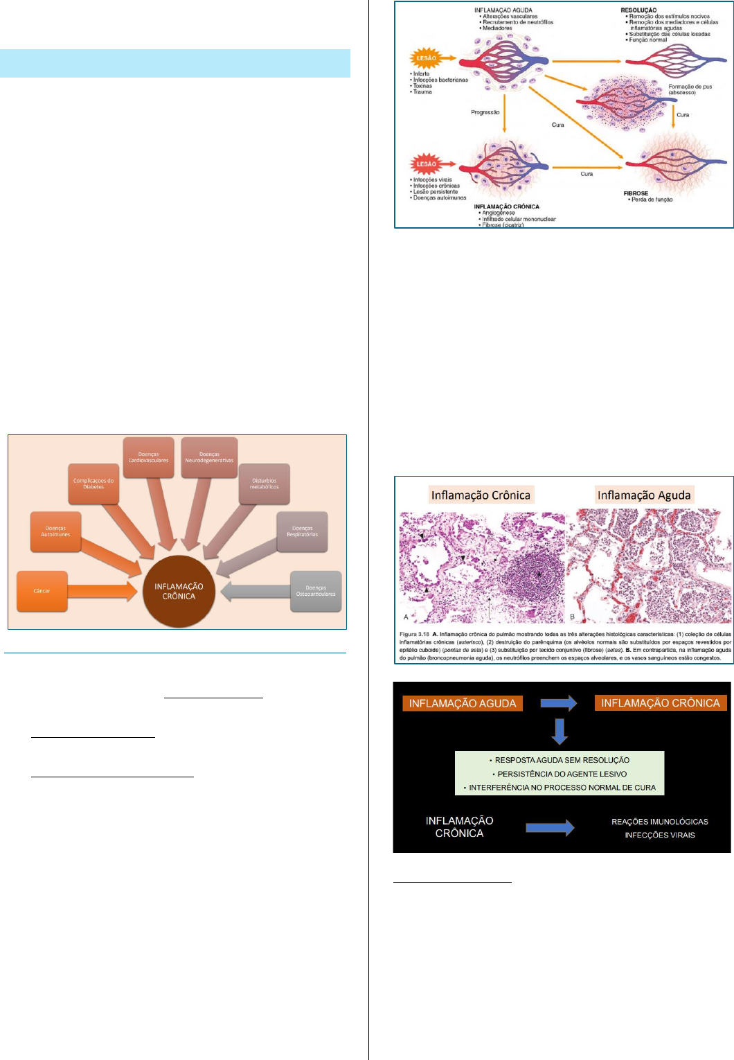 Inflamação crônica ASPECTOS GERAIS: • A inflamação crônica é um processo inflamatório que perpetuou, não tem um tempo exato, depende da microscopia -> teve 2 caminhos -> teve uma inflamação aguda que não foi curada (ex: hepatites c) ou pode ser insidiosa (depende do microrganismo) • Todo processo inflamatório crônico tem destruição tecidual/tissular e a célula mais marcante é o macrófago- depende do local e patógeno. Se tem destruição o tecido quer fazer reparo, tem sempre fibrose. • Resposta dos tecidos vascularizados a infecções e tecidos lesados. • Recrutar células e moléculas de defesa do hospedeiro da circulação para os locais onde são necessárias. • Eliminar os agentes agressores INFLAMAÇÃO CRÔNICA • Infiltração por células mononucleares, que incluem macrófagos, linfócitos e plasmócitos • Destruição tecidual, induzida pelo agente agressor persistente ou pelas células inflamatórias • Tentativas de cicatrização (reparo) por meio de substituição do tecido danificado por tecido conjuntivo, possibilitadas pela angiogênese e fibrose. A depender do que gera a destruição tem a tentativa de fazer um reparo. • Depende sempre do cenário e do tempo. Quanto mais macrófago tiver pior. • Todo processo agudo encaminha para cura e reparo, porém se não consegue curar vai para uma inflamação crônica. Não pode deixar o organismo persistir nessa inflamação crônica • Nos dos cenários tem células espalhadas. Na inflamação aguda tem mais sangue, é mais exsudativa. Na inflamação crônica sobre fibrina e fibroblasto. • Sempre: na aguda tem neutrófilos e na crônica tem macrófagos. Tudo depende da resposta sem resolução e da persistência do patógeno, além da interferência de cura e reparo, onde o corpo não responde da maneira que necessita. Na crônica obrigatoriamente tem destruição tecidual! Tem sempre TENTATIVA de cura e reparo. ETIOLOGIA/CAUSA • Infecções persistentes difíceis de erradicar (micobactérias-tuberculose, microrganismo da sífilis, alguns vírus e fungos- microrganismos oportunistas- persistentes) o 1-Resposta imune por linfócito T (hipersensibilidade tardia) • Doença inflamatórias imunomediadas (indivíduos alérgicos distúrbios de hipersensibilidade) e autoimunidade: Artrite Reumatóide, renite, asma, Lúpus. o 1-Padrões morfológicos mistos de inflamação aguda e crônica. ▪ Tem inflamação crônica, porém tem períodos de agudização. • Doenças de hipersensibilidade → causadas pela ativação excessiva ou inapropriada do sistema imunológico (doenças auto-imune). • Exposição prolongada a agentes potencialmente tóxicos o 1- Materiais exógenos não degradáveis: sílica o 2- Materiais endógenos: cristais de colesterol • Formas leves de inflamação crônica sem classificação de distúrbio inflamatório o 1- Distúrbios neurodegenerativos: Alzheimer o 2- Aterosclerose o 3- Sd. Metabólica associada à DM tipo II o 4- Câncer desenvolvido por doenças inflamatórias crônicas *se observa sempre um padrão difuso, onde vê macrófagos espalhados por todo o tecido. MORFOLOGIA DA INFLAMAÇÃO • INFLAMAÇÃO AGUDA→ alterações vasculares, edema e infiltrado neutrófilo. o Resposta Inata • INFLAMAÇÃO CRÔNICA→ caracterizada por: o Infiltração com células mononucleares (macrófagos, linfócitos e plasmócitos); o Destruição tecidual: induzida pelo agente agressor persistente ou pelas células inflamatórias. o Tentativas de reparo: substituição por tecido conjuntivo e fibrose. ▪ Resposta adaptativa: th1, th2, th17- depende da imunidade e patógeno que entra. ▪ Os exames complementários trazem pista para fechar o diagnostico CÉLULAS ENVOLVIDAS MACRÓFAGOS • Células dominantes da inflamação crônica- provenientes da medula óssea e lançado no sangue periférico como monócitos- se não ativar para virar um macrófago vai durar 1 dia e por isso a importância de ter macrófagos residentes no fígado, alvéolos- áreas que precisam o tempo inteiro de proteção- precisa de um contato com o agente agressor para serem ativados, um contato direto. A partir do momento que ativou em macrófago pode durar meses ou anos. • Derivadas dos monócitos do sangue circulante após emigração da corrente sanguínea • Dispersos difusamente em tecidos conjuntivos e órgãos • Filtros para materiais particulados, micróbios, células senescentes, células efetoras das respostas imune humoral e celular Como os macrófagos são ativados: • Respondem à ativação dos linfócitos T; portanto: o macrófago é ativado quando é exposto para o linfócito T, com resposta mediada que inicia processo de reparo. São ativados a depender da citocina, das células, das NK, interferons. • O macrófago é ativado por fatores quimiotaticos e pela apresentação ao linfócito. Aumenta enzima lisossômica, aumenta espécies reativas etc. se tem liberação de fator de crescimento, estimula angiogênese. • São os fagócitos mais importantes na resposta imune adaptativa mediada por célula ; • Iniciam o processo de reparo tecidual e estão envolvidos na formação da cicatriz e fibrose • Temos dois tipos de macrófagos: o M1: envolvido no processo inflamatório crônico -> QUANDO é ativado libera interleucina 1, 12 e 23 e perpetua o processo inflamatório, ao mesmo tempo faz espécies reativas e libera enzimas lisossômicas para fazer fagocitose. O processo se torna crônico porque o patógeno continua presente. Também libera interferon e interleucina 3 e 4 que fazem via alternativa com macrófagos anti- inflamatório e de cura e reparo (faz inflamação e defesa). Induzido por endotoxinas dos toll like receptor, para fazer processo de morte. o M2: induzido pela IL-4 e IL-13. • Sai do controle- tudo tem TENTATIVA de cura e reparo, porém não consegue fazer e gera cronicidade. Os macrófagos: • Secretam mediadores de inflamação à as citocinas (TN