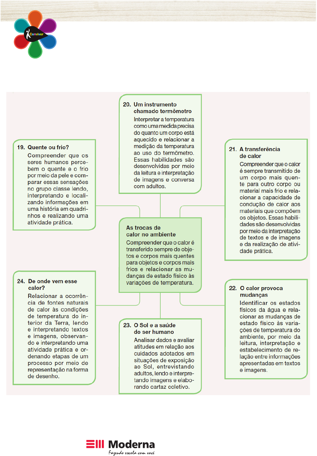 0800 13 0033 www.moderna.com.br/conviver Todos os direitos reservados Avaliação – Ciências 3º ano 0800 13 0033 www.moderna.com.br/conviver Todos os direitos reservados Avaliação – Ciências 3º ano 1. A imagem abaixo representa uma das etapas de um experimento realizado por você e seus co- legas. Observe-a. - Na situação representada na foto, que sentido foi utilizado para perceber as sensações? ______________________________________________________________________________ - Qual instrumento poderia ser usado para medir precisamente a temperatura da água das ba- cias? ______________________________________________________________________________ - O que aconteceu com a temperatura da água das bacias, após uma espera de cerca de 10 mi- nutos? ______________________________________________________________________________ ______________________________________________________________________________ ______________________________________________________________________________ 2. Compare as cenas e assinale com X a resposta correta. 0800 13 0033 www.moderna.com.br/conviver Todos os direitos reservados Avaliação – Ciências 3º ano - Em destaque, na lateral das imagens, aparece um instrumento chamado termômetro clínico. Ele mede tanto a temperatura do corpo humano como da água, do ar e do solo. ( ) - Com base nas temperaturas indicadas no termômetro é possível imaginar que o menino esteja reagindo a alguma infecção. ( ) - Colocando a mão na testa também seria possível ter uma ideia da temperatura do corpo dessa criança . ( ) 3. Leia o texto seguinte. Depois, identifique e grife os trechos que contêm informações incorretas. O calor é uma forma de energia que pode ser transferida de um corpo mais quente para outro corpo ou material mais frio; o contrário também acontece. Algumas vezes, quando colocamos dois corpos em contato, o que tem maior temperatura transfere calor para o corpo com menor temperatura. Depois de um tempo, o segundo corpo esta- rá mais aquecido que o primeiro. Chamamos essa situação de equilíbrio térmico. A capacidade de conduzir calor pode ser maior ou menor, dependendo do material de que são feitos os corpos. Alguns materiais, como o isopor, são bons condutores de calor; o mesmo não acontece com os metais. 4. Observe as imagens seguintes, e depois, com base no que você estudou sobre os estados físi- cos da água, escreva uma legenda para cada imagem. ______________________________________________________________________________ ______________________________________________________________________________ ______________________________________________________________________________ ______________________________________________________________________________ 0800 13 0033 www.moderna.com.br/conviver Todos os direitos reservados Avaliação – Ciências 3º ano ______________________________________________________________________________ ______________________________________________________________________________ ______________________________________________________________________________ ______________________________________________________________________________ 5. Na sequência de fotos representada a seguir você pode observar a água em dois estados físi- cos. 1 2 3 - Quais estados físicos você observou? ______________________________________________________________________________ ______________________________________________________________________________ - O que pode explicar a mudança que ocorreu com a água? ______________________________________________________________________________ ______________________________________________________________________________ ______________________________________________________________________________ 0800 13 0033 www.moderna.com.br/conviver Todos os direitos reservados Avaliação – Ciências 3º ano 6. Complete as lacunas com os termos adequados. Com o calor do ar, a água líquida pode passar para a forma de ___________ lentamente. Esse processo recebe o nome de ____________. A água líquida também pode passar para esse estado físico por meio da _____________. Esse tipo de mudança pode ser observado quando colocamos uma panela, cheia de água, sobre o calor da chama de um fogão. Caso a pa- nela esteja tampada, com o passar do tempo irá se acumular na superfície interna da tampa uma grande quantidade de __________ de água. Nesse caso, a mudança de estado físico recebe o nome de ______________. 7. Elabore um pequeno folheto para explicar às pessoas porque é preciso tomar determinados cuidados com a exposição excessiva do corpo humano ao Sol. Esse folheto deve conter informa- ções apresentadas por meio de frases curtas e por meio de um desenho. ______________________________________________________________________________ ______________________________________________________________________________ ______________________________________________________________________________ ______________________________________________________________________________ ______________________________________________________________________________ ______________________________________________________________________________ 0800 13 0033 www.moderna.com.br/conviver Todos os direitos reservados Avaliação – Ciências 3º ano 8. Ligue as colunas, formando frases sobre a transferência de calor em diferentes tipos de materi ais. A areia... ... é um exemplo de isolante térmico. A madeira ... ... aquece rapidamente. O ferro... . ... é um bom condutor de calor. Um isolante térmico... ... esfria mais rápido que a água. Um bom condutor de calor... ... esfria lentamente. 9. Elabore legendas para explicar o que está representado em cada uma das fotos a seguir. _________________________________________________ _________________________________________________ _________________________________________________ _________________________________________________ ___