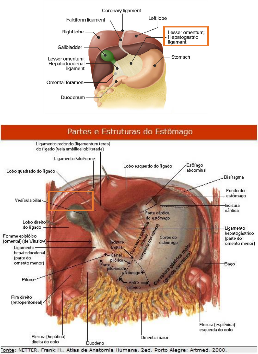 Ligamentos peritoniais: são duplas camadas de peritônio que une um órgão a outro ou à parede do abdome. O figado está conectado: 1. Ligamento hepatogástrico • O ligamento hepatogástrico é uma parte do omento menor, que se estende da curvatura menor do estômago até o fígado. • Ele forma a parte anterior do omento menor, conectando o fígado ao estômago. Este ligamento é fino e membranoso. 2. Ligamento Hepatoduodenal Localização e Estrutura: a. O ligamento hepatoduodenal é uma porção do omento menor que se estende do duodeno (a primeira parte do intestino delgado) até o fígado. b. Localiza-se na borda livre do omento menor, estendendo-se do piloro (a abertura do estômago para o duodeno) até a porta hepática (hilo hepático) do fígado. Conteúdo: O ligamento hepatoduodenal contém estruturas vitais que formam a tríade portal: o Veia Porta Hepática: Transporta sangue rico em nutrientes do trato gastrointestinal para o fígado. o Artéria Hepática Própria: Fornece sangue oxigenado ao fígado. o Ducto Biliar Comum (Colédoco): Transporta bile do fígado e da vesícula biliar para o duodeno. o Além dessas estruturas principais, o ligamento também contém vasos linfáticos e nervos. Anatomia Relacionada • Omento Menor: O ligamento hepatoduodenal é a parte mais espessa e livre do omento menor. Juntamente com o ligamento hepatogástrico, forma o omento menor que conecta o fígado ao estômago e ao duodeno. • Forame de Winslow (Forame Omental): O ligamento hepatoduodenal forma a borda anterior deste forame, que é uma abertura que conecta a cavidade peritoneal maior à bolsa omental (menos sac). 3. Recesso inferior da bolsa omental O recesso inferior da bolsa omental, também conhecido como recesso inferior do saco menor ou recesso inferior da cavidade omental, é uma extensão da bolsa omental (saco menor) na cavidade abdominal. A bolsa omental é uma cavidade do peritônio situada atrás do estômago e do omento menor. • O recesso inferior da bolsa omental é a parte mais baixa dessa cavidade. Ele se estende entre a parte posterior do estômago e a camada anterior do omento maior. • Em indivíduos adultos, o recesso inferior pode ser muito pequeno ou mesmo obliterado, mas está mais proeminente em crianças. Em anatomia, um "recesso" refere-se a uma pequena cavidade, bolsa ou espaço, geralmente uma extensão de uma cavidade maior. Esses recessos podem ser encontrados em várias partes do corpo e desempenham papéis importantes em diversos contextos anatômicos e fisiológicos 4. Recesso superior da bolsa omental O recesso superior da bolsa omental, também conhecido como recesso superior do saco menor, é uma parte da cavidade peritoneal que faz parte da bolsa omental. A bolsa omental (saco menor) é uma cavidade localizada atrás do estômago e do omento menor. • O recesso superior da bolsa omental é a parte superior dessa cavidade. • Localiza-se entre o lobo caudado do fígado e o diafragma superiormente, e a parte superior do estômago e omento menor inferiormente. 5. Forame omental (forame de winslow) O forame omental, também conhecido como forame epiploico ou forame de Winslow, é uma abertura significativa na cavidade abdominal que permite a comunicação entre a bolsa omental (saco menor) e a cavidade peritoneal maior. Localização: o O forame omental está localizado na parte superior direita da cavidade abdominal, posterior ao ligamento hepatoduodenal, que é a borda livre do omento menor. Limites: o Anterior: Ligamento hepatoduodenal, que contém a tríade portal (veia porta hepática, artéria hepática própria e ducto biliar comum). o Posterior: Veia cava inferior e a lâmina anterior do peritônio parietal que cobre essa veia. o Superior: Processo caudado do fígado. o Inferior: Parte superior do duodeno (primeira porção do duodeno). Função: Comunicação: o O forame omental permite a comunicação entre a bolsa omental (saco menor) e a cavidade peritoneal maior. Esta conexão é importante para o movimento de fluidos e estruturas entre essas duas partes da cavidade peritoneal. Acesso Cirúrgico: o O forame omental é uma estrutura crucial em várias abordagens cirúrgicas, especialmente em cirurgias que envolvem o fígado, estômago, pâncreas e outros órgãos retroperitoneais. o Conhecimento detalhado dessa abertura é essencial durante procedimentos como a manobra de Pringle, que é usada para controlar o sangramento hepático temporariamente ao ocluir o ligamento hepatoduodenal. Hérnias Internas: • O forame omental pode ser um local de herniação interna, onde alças intestinais podem ficar presas, resultando em obstrução intestinal. Propagação de Infecções e Abscessos: • Abscessos ou coleções de líquidos podem se espalhar através do forame omental, facilitando a comunicação entre a bolsa omental e a cavidade peritoneal maior. 6. Omento Maior O omento maior, também conhecido como grande epíploo, é uma estrutura anatômica significativa no corpo humano, composta por uma dobra dupla de peritônio, a membrana serosa que reveste a cavidade abdominal e cobre a maioria dos órgãos abdominais. Aqui estão os detalhes sobre o omento maior: Localização e Estrutura: 1. Origem e Extensão: o O omento maior se origina da curvatura maior do estômago e da parte proximal do duodeno. o Ele desce em direção ao abdômen, cobrindo a superfície anterior dos órgãos abdominais. 2. Constituição: o É composto por duas camadas de peritônio que se fundem juntas, formando uma dobra dupla. o As camadas peritoneais são ricas em vasos sanguíneos, gordura e células imunes. Funções: 1. Proteção e Isolamento: o O omento maior serve como uma camada protetora para os órgãos abdominais, ajudando a isolar e proteger contra infecções e lesões. 2. Armazenamento de Gordura: o Contém depósitos de gordura que servem como uma reserva de energia. 3. Respostas Imunes: o Contém células imunológicas que ajudam a combat