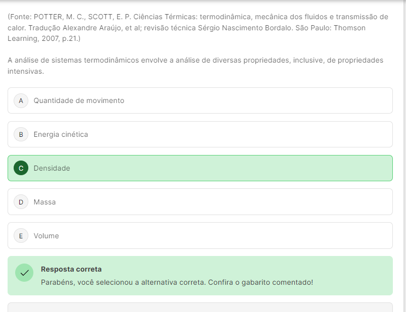 A análise de sistemas termodinâmicos envolve a analise de diversas propriedades, inclusive, de propriedades A Quantidade de movimento B Energia cinética C Densidade D Massa E Volume Resposta correta você selecionou a alternativa correta. Confira gabarito comentado! A - Quantidade de movimento B - Energia cinética C - Densidade D - Massa E - Volume