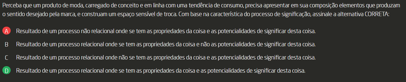 Perceba que um produto de moda, carregado de conceito e em linha com uma tendência de consumo, precisa apresentar em sua composição elementos que produzam sentido desejado pela marca, e construam um espaço sensível de troca. Com base na característica do processo de significação, assinale a alternativa CORRETA: A Resultado de um processo relacional onde não se tem as propriedades da coisa e as potencialidades de significar desta coisa. B Resultado de um processo relacional onde se tem as propriedades da coisa e não as potencialidades de significar desta coisa. C Resultado de um processo relacional onde se tem as propriedades da coisa e as potencialidades de significar desta coisa. D Resultado de um processo não relacional onde se tem as propriedades da coisa e as potencialidades de significar desta coisa.