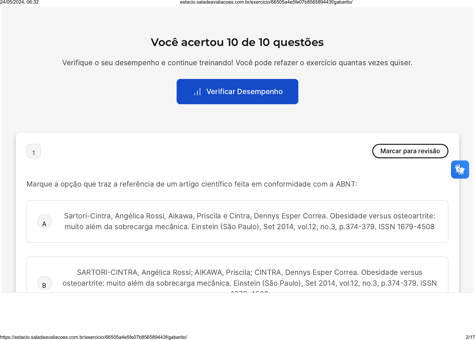 Você acertou 10 de 10 questões Verifique o seu desempenho e continue treinando! Você pode refazer o exercício quantas vezes quiser. Verificar Desempenho A B 1 Marcar para revisão Marque a opção que traz a referência de um artigo científico feita em conformidade com a ABNT� Sartori-Cintra, Angélica Rossi, Aikawa, Priscila e Cintra, Dennys Esper Correa. Obesidade versus osteoartrite: muito além da sobrecarga mecânica. Einstein �São Paulo), Set 2014, vol.12, no.3, p.374�379. ISSN 1679�4508 SARTORI�CINTRA, Angélica Rossi; AIKAWA, Priscila; CINTRA, Dennys Esper Correa. Obesidade versus osteoartrite: muito além da sobrecarga mecânica. Einstein �São Paulo), Set 2014, vol.12, no.3, p.374�379. ISSN 1679�4508 24/05/2024, 06:32 estacio.saladeavaliacoes.com.br/exercicio/66505a4e5fe07b856589443f/gabarito/ https://estacio.saladeavaliacoes.com.br/exercicio/66505a4e5fe07b856589443f/gabarito/ 2/17 C D E SARTORI�CINTRA, Angélica Rossi; AIKAWA, Priscila; CINTRA, Dennys Esper Correa. Obesidade versus osteoartrite: muito além da sobrecarga mecânica. Einstein �São Paulo), Set 2014, vol.12, no.3, p.374�379. SARTORI�CINTRA, Angélica Rossi; AIKAWA, Priscila; CINTRA, Dennys Esper Correa. Obesidade versus osteoartrite: muito além da sobrecarga mecânica. Einstein, São Paulo, Set 2014, v.12, n. 3, p.374�379. ISSN 1679�4508 SARTORI�CINTRA, Angélica Rossi; AIKAWA, Priscila; CINTRA, Dennys Esper Correa. Obesidade versus osteoartrite: muito além da sobrecarga mecânica. Einstein, São Paulo, v. 12, n. 3, p.374�379, set. 2014. ISSN 1679�4508. Resposta correta Parabéns, você selecionou a alternativa correta. Confira o gabarito comentado! Gabarito Comentado A alternativa correta é a E, pois apresenta a referência de um artigo científico em conformidade com a ABNT. A referência está estruturada corretamente, com os nomes dos autores em caixa alta, seguidos pelo título do artigo, o nome da revista, a cidade, o volume, o número, a página, a data e o ISSN. As demais alternativas apresentam erros como a falta do ISSN, a ordem incorreta dos elementos ou a formatação inadequada dos nomes dos autores. 24/05/2024, 06:32 estacio.saladeavaliacoes.com.br/exercicio/66505a4e5fe07b856589443f/gabarito/ https://estacio.saladeavaliacoes.com.br/exercicio/66505a4e5fe07b856589443f/gabarito/ 3/17 A B C D E 2 Marcar para revisão Que características devem ser priorizadas nas produções científicas que usamos em nossas pesquisas, que trarão credibilidade para ela e para nós como pesquisadores? A quantidade de produções estrangeiras que usamos. A quantidade de produções nacionais que usamos. A quantidade de autores e de produções estrangeiras que usamos. A qualidade e a quantidade das produções que usamos. A qualidade das produções e a relevância dos autores que usamos. 24/05/2024, 06:32 estacio.saladeavaliacoes.com.br/exercicio/66505a4e5fe07b856589443f/gabarito/ https://estacio.saladeavaliacoes.com.br/exercicio/66505a4e5fe07b856589443f/gabarito/ 4/17 A Resposta correta Parabéns, você selecionou a alternativa correta. Confira o gabarito comentado! Gabarito Comentado Para garantir a credibilidade de uma pesquisa, é fundamental priorizar a qualidade das produções científicas utilizadas e a relevância dos autores dessas produções. A quantidade de produções ou sua origem (nacional ou estrangeira) não são fatores determinantes para a credibilidade da pesquisa. O que realmente importa é a qualidade do material utilizado e a autoridade dos autores no campo de estudo. Portanto, a alternativa correta é a E� "A qualidade das produções e a relevância dos autores que usamos". 3 Marcar para revisão Sobre a produção científica no Brasil, são feitas as afirmativas a seguir. I. A iniciativa privada, em todos os setores produtivos, tem investido de forma pesada na produção e desenvolvimento de pesquisas científicas no Brasil. II. Apenas a indústria cosmética faz investimentos pesados em pesquisa e desenvolvimento no Brasil III. O Brasil tem órgãos públicos federais e estaduais que têm promovido a pesquisa e desenvolvimento, especialmente em universidades públicas. Apenas I está correta. 24/05/2024, 06:32 estacio.saladeavaliacoes.com.br/exercicio/66505a4e5fe07b856589443f/gabarito/ https://estacio.saladeavaliacoes.com.br/exercicio/66505a4e5fe07b856589443f/gabarito/ 5/17 B C D E Apenas II está correta. Apenas III está correta. Apenas I e II estão corretas. Apenas II e III estão corretas. Resposta correta Parabéns, você selecionou a alternativa correta. Confira o gabarito comentado! Gabarito Comentado A alternativa correta é a III, que afirma que o Brasil possui órgãos públicos federais e estaduais que promovem a pesquisa e desenvolvimento, especialmente em universidades públicas. Isso é verdadeiro, pois o Brasil conta com diversas instituições, como o CNPq e a CAPES, que fomentam a pesquisa científica no país. As afirmativas I e II não estão corretas. A iniciativa privada não investe de forma pesada em todos os setores produtivos e não é apenas a indústria cosmética que faz investimentos significativos em pesquisa e desenvolvimento no Brasil. 24/05/2024, 06:32 estacio.saladeavaliacoes.com.br/exercicio/66505a4e5fe07b856589443f/gabarito/ https://estacio.saladeavaliacoes.com.br/exercicio/66505a4e5fe07b856589443f/gabarito/ 6/17 A B 4 Marcar para revisão A produção científica é o resultado do processo de criação do conhecimento por meio da pesquisa, que são divulgadas através de eventos científicos, notas e revistas. É de suma importância que o trabalho seja publicado em uma rede científica com ampla divulgação. Essas redes científicas são essenciais como banco de pesquisas para se recorrer quando iniciamos uma pesquisa. De acordo com a busca em redes científicas, analise as alternativas abaixo: I� Buscarmos trabalhos científicos no início � Para que se conheça bem sobre o objeto de estudo e tudo o que