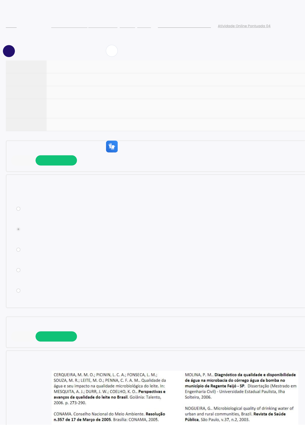- Meus cursos - - - Painel Textos científicos: aspectos metodológicos e linguísticos Atividades Pontuadas e Notas Atividade Online Pontuada 04 Iniciado em segunda, 13 mai 2024, 18:35 Estado Finalizada Concluída em segunda, 13 mai 2024, 18:40 Tempo empregado 5 minutos 53 segundos Avaliar 2,00 de um máximo de 2,00(100%) Questão 1 Completo Atingiu 0,20 de 0,20 Marque a opção abaixo que corresponda ao uso adequado da expressão et al. Escolha uma opção: a. Quando for citar uma obra escrita por Freire (1986). b. Quando for citar uma obra escrita por Pereira, Souza, Ortega e Alves (2010). c. Quando for citar uma obra escrita por Júnio, Gaudio e Marques (2001). d. Quando for citar uma obra escrita por Silva (1999). e. Quando for citar uma obra escrita por Libâneo, Avelar e Stela-Maris (2010). Questão 2 Completo Atingiu 0,20 de 0,20 Veja a figura seguinte: 13/05/2024 18:40 Página 1 de 6 O objetivo desse elemento textual dos trabalhos acadêmicos é: Escolha uma opção: a. Mostrar os objetivos da pesquisa científica. b. Organizar as fontes de pesquisa empregadas no trabalho científico. c. Listar as palavras não muito conhecidas, ou de sentido técnico acompanhadas do respectivo significado. d. Organizar os capítulos e seções do trabalho. e. Complementar a sua argumentação feita no trabalho. Questão 3 Completo Atingiu 0,20 de 0,20 Observe o texto a seguir: METODOLOGIA do Índice Nacional de Preços ao Consumidor. In: Revista Brasileira de Estatística, Rio de Janeiro, v. 41, n. 162, p. 323-230, abr./jun. 1990. A partir da referência anterior, pode-se dizer que o nome do periódico em questão é “METODOLOGIA do Índice Nacional de Preços ao Consumidor”. Escolha uma opção: Verdadeiro Falso Questão 4 Completo Atingiu 0,20 de 0,20 Leia o texto abaixo: Morin (2000) atesta que todo conhecimento sobre o mundo é decorrente da interpretação de nosso cérebro acerca do universo percebido pelos sentidos, multiplicando assim os riscos de erro. Considerando-o, pode-se afirmar que ele é uma Escolha uma opção: a. 13/05/2024 18:40 Página 2 de 6 a. Citação Direta com Omissões de Palavras. b. Citação Direta Longa. c. Citação Indireta. d. Citação Direta Curta. e. Citação Direta com Destaque de Palavras. Questão 5 Completo Atingiu 0,20 de 0,20 O sumário, além de ser um elemento pré-textual, cuja finalidade é oferecer uma visão geral do trabalho, evidenciando seus capítulos e seções, é um elemento obrigatório. Considerando as informações anteriores sobre o sumário, marque F, de falso, ou V, de verdadeiro. Escolha uma opção: Verdadeiro Falso Questão 6 Completo Atingiu 0,20 de 0,20 Veja a referência abaixo: Conselho Nacional de Educação. Resolução CNE/CES nº 5, de 7 de novembro de 2001. Institui Diretrizes Curriculares Nacionais do Curso de Graduação em Nutrição. Diário Oficial da União [internet]. 9 nov 2001; Seção 1:39. Disponível em: Pode-se afirmar que o(os, a, as) autor(es) Escolha uma opção: a. Trata-se de uma pessoa b. Tratam-se de três pessoas c. São duas autoras d. É uma entidade http://portal.mec.gov.br/cne/arquivos/pdf/CES05.pdf 13/05/2024 18:40 Página 3 de 6 d. É uma entidade e. São mais de três autores Questão 7 Completo Atingiu 0,20 de 0,20 “significa cometer furto literário, apresentando como sua uma ideia ou obra, literária ou científica, de outrem. 2 Usar obra de outrem como fonte sem mencioná-la. 3 Imitar, servil ou fraudulentamente” Essa definição diz respeito: Escolha uma opção: a. à ABNT. b. à inspiração de alguma fonte. c. à citação da citação. d. ao texto científico. e. ao plágio. Questão 8 Completo Atingiu 0,20 de 0,20 Observe o trecho abaixo: Assis (1996, p. 41) afirma que "A informação está nas mãos de poucos, porque estes tem medo de perder suas tarefas, ou tornar- se substituíveis.” Marque a opção que nomeia corretamente a citação anterior: Escolha uma opção: a. Citação Direta com Destaque de Palavras b. Citação Direta Curta c. Citação Direta Longa 13/05/2024 18:40 Página 4 de 6 d. Citação de Citação e. Citação Indireta Questão 9 Completo Atingiu 0,20 de 0,20 Observe a referência abaixo: RODRIGUES, M. V. Qualidade de vida no trabalho. 1989. 180 f. Dissertação (Mestrado em Administração) - Faculdade de Ciências Econômicas, Universidade Federal de Minas Gerais, Belo Horizonte, 1989. Com base nela, julgue as asserções abaixo: I – O sobrenome do autor principal é Rodrigues; II – O grau de titulação é graduação em Administração; III – A quantidade de páginas é 189. : Escolha uma opção: a. I e II são falsas. b. I, II e III são verdadeiras c. I e II são verdadeiras d. II é verdadeira e. I é verdadeiras. Questão 10 Completo Atingiu 0,20 de 0,20 Leia a referência abaixo: KOVÁCZ, Ilona. Reestruturação empresarial e emprego. Perspectiva, Florianópolis, v. 21, n. 2, p. 467-494, jul./dez. 2003. Pode-se afirmar que: Escolha uma opção: a. O nome do título da revista é “Reestruturação empresarial e emprego”. b. O nome da revista é Perspectiva. c. O nome do periódico é Kovácz. 13/05/2024 18:40 Página 5 de 6 c. O nome do periódico é Kovácz. d. O sobrenome da autora é Ilona. e. A autora principal é a Perspectiva. Terminar revisão Atividade Online Pontuada 03 Seguir para... Manual: Como acessar a Aula Online 13/05/2024 18:40 Página 6 de 6