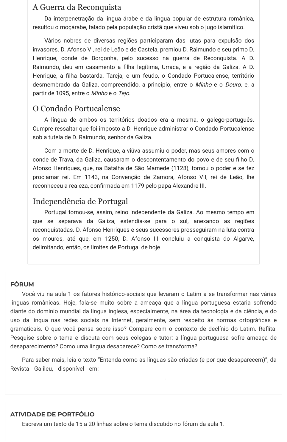 A Guerra da Reconquista Da interpenetração da língua árabe e da língua popular de estrutura românica, resultou o moçárabe, falado pela população cristã que viveu sob o jugo islamítico. Vários nobres de diversas regiões participaram das lutas para expulsão dos invasores. D. Afonso VI, rei de Leão e de Castela, premiou D. Raimundo e seu primo D. Henrique, conde de Borgonha, pelo sucesso na guerra de Reconquista. A D. Raimundo, deu em casamento a �lha legítima, Urraca, e a região da Galiza. A D. Henrique, a �lha bastarda, Tareja, e um feudo, o Condado Portucalense, território desmembrado da Galiza, compreendido, a princípio, entre o Minho e o Douro, e, a partir de 1095, entre o Minho e o Tejo. O Condado Portucalense A língua de ambos os territórios doados era a mesma, o galego-português. Cumpre ressaltar que foi imposto a D. Henrique administrar o Condado Portucalense sob a tutela de D. Raimundo, senhor da Galiza. Com a morte de D. Henrique, a viúva assumiu o poder, mas seus amores com o conde de Trava, da Galiza, causaram o descontentamento do povo e de seu �lho D. Afonso Henriques, que, na Batalha de São Mamede (1128), tomou o poder e se fez proclamar rei. Em 1143, na Convenção de Zamora, Afonso VII, rei de Leão, lhe reconheceu a realeza, con�rmada em 1179 pelo papa Alexandre III. Independência de Portugal Portugal tornou-se, assim, reino independente da Galiza. Ao mesmo tempo em que se separava da Galiza, estendia-se para o sul, anexando as regiões reconquistadas. D. Afonso Henriques e seus sucessores prosseguiram na luta contra os mouros, até que, em 1250, D. Afonso III concluiu a conquista do Algarve, delimitando, então, os limites de Portugal de hoje. FÓRUM Você viu na aula 1 os fatores histórico-sociais que levaram o Latim a se transformar nas várias línguas românicas. Hoje, fala-se muito sobre a ameaça que a língua portuguesa estaria sofrendo diante do domínio mundial da língua inglesa, especialmente, na área da tecnologia e da ciência, e do uso da língua nas redes sociais na Internet, geralmente, sem respeito às normas ortográ�cas e gramaticais. O que você pensa sobre isso? Compare com o contexto de declínio do Latim. Re�ita. Pesquise sobre o tema e discuta com seus colegas e tutor: a língua portuguesa sofre ameaça de desaparecimento? Como uma língua desaparece? Como se transforma? Para saber mais, leia o texto “Entenda como as línguas são criadas (e por que desaparecem)”, da Revista Galileu, disponível em: https://revistagalileu.globo.com/Revista/noticia/2018/03/entenda- como-linguas-sao-criadas-e-por-que-desaparecem.html [15]. ATIVIDADE DE PORTFÓLIO Escreva um texto de 15 a 20 linhas sobre o tema discutido no fórum da aula 1. 7 http://revistagalileu.globo.com/Revista/noticia/2018/03/entenda-como-linguas-sao-criadas-e-por-que-desaparecem.html