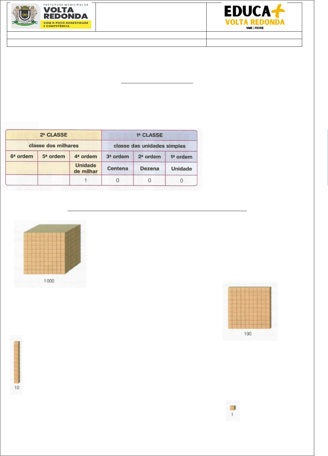 Estado do Rio de Janeiro Prefeitura de Volta Redonda Secretaria Municipal de Educação Escola Municipal Damião Medeiros MATEMÁTICA – 3º ANO DATA: NOME: TURMA: Habilidades: (EF03MA01) Ler, escrever e comparar números naturais de até a ordem de unidade de milhar, estabelecendo relações entre os registros numéricos e em língua materna. (EF03MA02) Identificar características do sistema de numeração decimal, utilizando a composição e a decomposição de número natural de até quatro ordens. (EF03MA10) Identificar regularidades em sequências ordenadas de números naturais, resultantes da realização de adições ou subtrações sucessivas, por um mesmo número, descrever uma regra de formação da sequência e determinar elementos faltantes ou seguintes. A UNIDADE DE MILHAR AS UNIDADES, DEZENAS E CENTENAS FORMAM A CLASSE DAS UNIDADES SIMPLES. VAMOS CONHECER AGORA UMA NOVA CLASSE, A CLASSE DOS MILHARES. ELA TAMBÉM É FORMADA POR TRÊS ORDENS. A PRIMEIRA DELA É A 4° ORDEM, REPRESENTADA PELAS UNIDADES DE MILHAR. Quadro Valor de Lugar. Q.V.L PARA SABERMOS O VALOR POSICIONAL DE UM ALGARISMO, UTILIZAMOS AS ORDENS E CLASSES, QUE SE ENCONTRAM NO QUADRO DE ORDENS, QUE É TAMBÉM CHAMADO DE QVL. REPRESENTANDO O NUMERAL NO MATERIAL DOURADO: O MILHAR É REPRESENTADO PELO CUBO; A CENTENA É REPRESENTADA PELA PLACA; A DEZENA É REPRESENTADA PELA BARRA; A UNIDADE É REPRESENTADA PELO CUBINHO. VALOR POSICIONAL OU RELATIVO DO ALGARISMO: VEJA A LOCALIZAÇÃO DO ALGARISMO 8, NOS NÚMEROS 178, 1.283 E 8.647, REPRESENTADOS NOS ÁBACOS ABAIXO. PODEMOS OBSERVAR QUE O ALGARISMO 8 ASSUME VALORES DIFERENTES EM CADA UM DOS NÚMEROS ANTERIORES. ISSO ACONTECE PORQUE O NOSSO SISTEMA DE NUMERAÇÃO É POSICIONAL, OU SEJA, UM ALGARISMO PODE ASSUMIR VALORES DIFERENTES, DE ACORDO COM A POSIÇÃO QUE ELE OCUPA NA REPRESENTAÇÃO DE UM NÚMERO. O número 8.647, o algarismo 8 representa 8 unidades de milhar, ou seja, o seu valor posicional ou relativo é 8000. O número 1.283, o algarismo 8 representa 8 dezenas, ou seja, o seu valor posicional ou relativo é 80. O número 178, o algarismo 8 representa 8 unidades, ou seja, o seu valor posicional ou relativo é 8. PODEMOS OBSERVAR QUE O ALGARISMO 8 ASSUME VALORES DIFERENTES EM CADA UM DOS NÚMEROS ANTERIORES. ISSO ACONTECE PORQUE O NOSSO SISTEMA DE NUMERAÇÃO POSICIONAL, OU SEJA, UM ALGARISMO PODE ASSUMIR VALORES DIFERENTES, DE ACORDO COM A POSIÇÃO QUE ELE OCUPA NA REPRESENTAÇÃO DE UM NÚMERO. DECOMPOSIÇÃO DE NÚMEROS BASEIA-SE NA REPRESENTAÇÃO DO MESMO NÚMERO DE FORMA DIFERENTE. 1) DECOMPONHA OS NUMERAIS EM UNIDADES, CONFORME O MODELO: 1.560= 1.000+500+60 1.232=_______________________________________________________________________________ 1.003=_______________________________________________________________________________ 1.484=_______________________________________________________________________________ 1.503=_______________________________________________________________________________ 1.784=_______________________________________________________________________________ 2) DECOMPONHA OS NUMERAIS EM CLASSES E ORDENS, CONFORME O MODELO: 1.203=1 UNIDADE DE MILHAR+2 CENTENAS+3 UNIDADES. 1.349=_______________________________________________________________________________ 1.450=_______________________________________________________________________________ 1.100=_______________________________________________________________________________ 1.201=_______________________________________________________________________________ 1.478=_______________________________________________________________________________ 1.007=_______________________________________________________________________________ 3) OBSERVE OS ÁBACOS E REGISTRE OS NUMERAIS REPRESENTADOS: 4) OBSERVE O MATERIAL DOURADO E REGISTRE OS NUMERAIS REPRESENTADOS: O número 178, o algarismo 8 representa 8 unidades, ou seja, o seu valor posicional ou relativo é 8 O número 1283, o algarismo 8 representa 8 dezenas, ou seja, o seu valor posicional ou relativo é 80 ______________________________ ______________________________ ______________________________ ______________________________ ______________________________ O NÚMERO REPRESENTADO NO QUADRO ACIMA É: ____________. A DECOMPOSIÇÃO DESSE NÚMERO EM UNIDADES É: _______ + ______ + ______+_______ 5) PRIMEIRO DESCUBRA SE VOCÊ DEVE ADICIONAR OU SUBTRAIR PARA DAR CONTINUIDADE À SEQUÊNCIA, DEPOIS O VALOR A SER ADICIONADO OU SUBTRAÍDO. ENTÃO, COMPLETE AS SEQUÊNCIAS NUMÉRICAS: EXEMPLO: REGRA: DEVO __SOMAR 15______ PARA CONTINUAR. 15 30 45 60 75 90 105 120 135 150 REGRA: DEVO _______________________ PARA CONTINUAR. 200 180 160 REGRA: DEVO _______________________ PARA CONTINUAR. 230 260 290 REGRA: DEVO _______________________ PARA CONTINUAR. 550 500 450 Você é nota 10! ATIVIDADE DE MATEMÁTICA – 3º ANO DE ESCOLARIDADE – SEMANA 3 – ANO: 2024 image4.png image5.png image6.jpeg image7.png image8.png image9.png image10.png image11.png image12.png image1.png image2.png image3.png