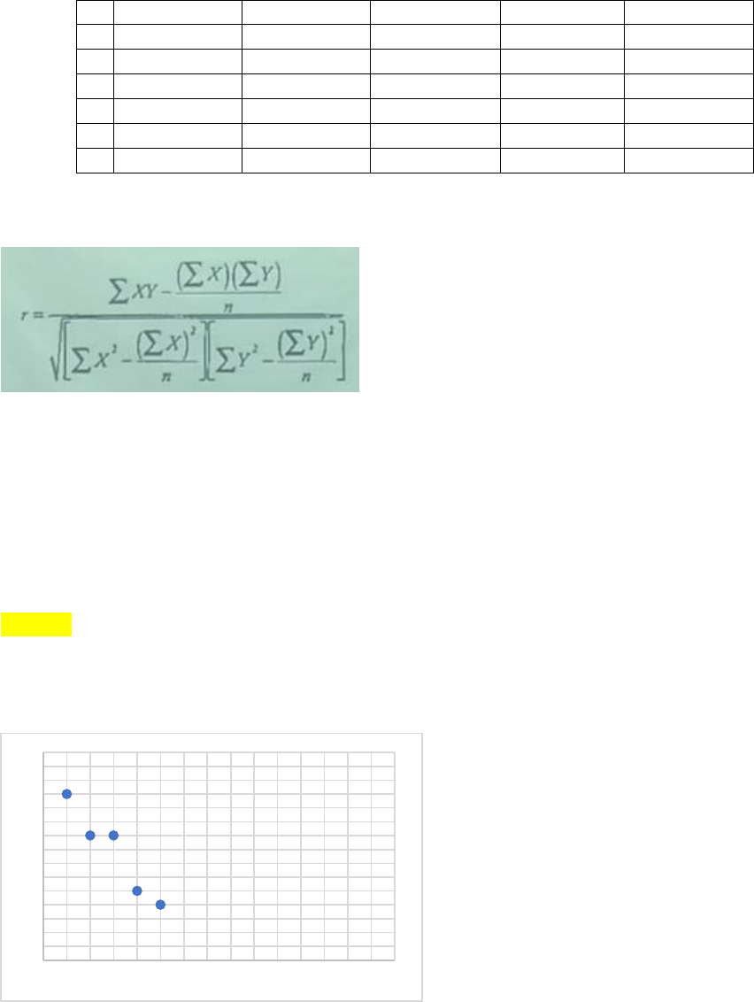 Nome: Alexia Cerquinho RA: 5206251 (Med. Vet. C2 Not.) Tarefa V – Correlação 1. Faça um diagrama de dispersão e calcule o coeficiente de correlação para os dados apresentados na tabela a seguir. Interprete os resultados. Variável X Variável Y X*Y X² Y² 1 12 12 1 144 2 9 18 4 81 3 9 27 9 81 4 5 20 16 25 5 4 20 25 16 Σ 15 39 97 55 347 r = (97 – 15*39/5) / √ (55 – 15²/5) * (347 – 39²/5) r = (97 – 117) / √ (55 – 45) * (347 – 304,2) r = -20 / 20,688 r = - 0,96 A partir do resultado obtido, podemos inferir que as duas variáveis possuem forte correlação, uma vez que r < - 0,75. 0 1 2 3 4 5 6 7 8 9 10 11 12 13 14 15 0 1 2 3 4 5 6 7 8 9 10 11 12 13 14 15