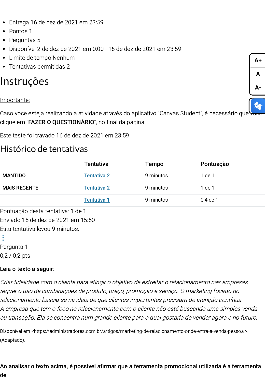 Atividade Objetiva 2 Entrega 16 de dez de 2021 em 23:59 Pontos 1 Perguntas 5 Disponível 2 de dez de 2021 em 0:00 - 16 de dez de 2021 em 23:59 Limite de tempo Nenhum Tentativas permitidas 2 Instruções Este teste foi travado 16 de dez de 2021 em 23:59. Histórico de tentativas Tentativa Tempo Pontuação MANTIDO Tentativa 2 9 minutos 1 de 1 MAIS RECENTE Tentativa 2 9 minutos 1 de 1 Tentativa 1 9 minutos 0,4 de 1 Pontuação desta tentativa: 1 de 1 Enviado 15 de dez de 2021 em 15:50 Esta tentativa levou 9 minutos. Pergunta 1 0,2 / 0,2 pts Importante: Caso você esteja realizando a atividade através do aplicativo "Canvas Student", é necessário que você clique em "FAZER O QUESTIONÁRIO", no final da página. Leia o texto a seguir: Criar fidelidade com o cliente para atingir o objetivo de estreitar o relacionamento nas empresas requer o uso de combinações de produto, preço, promoção e serviço. O marketing focado no relacionamento baseia-se na ideia de que clientes importantes precisam de atenção contínua. A empresa que tem o foco no relacionamento com o cliente não está buscando uma simples venda ou transação. Ela se concentra num grande cliente para o qual gostaria de vender agora e no futuro. Disponível em <https://administradores.com.br/artigos/marketing-de-relacionamento-onde-entra-a-venda-pessoal>. (Adaptado). Ao analisar o texto acima, é possível afirmar que a ferramenta promocional utilizada é a ferramenta de A+ A A- https://famonline.instructure.com/courses/16422/quizzes/82716/history?version=2 https://famonline.instructure.com/courses/16422/quizzes/82716/history?version=2 https://famonline.instructure.com/courses/16422/quizzes/82716/history?version=1 Relações públicas. Promoção de vendas. Segmentação. Merchandising. Correto! Venda pessoal. A alternativa está correta. A ferramenta de venda pessoal tem como foco estreitar o relacionamento com o cliente, além de avaliar a sua satisfação. Pergunta 2 0,2 / 0,2 pts II e III, apenas III, apenas I e II, apenas II, apenas Correto! I, apenas Alternativa correta: Em empresas e estabelecimentos onde os serviços são executados pelas pessoas, ao ampliar o mix com pessoas, melhora a percepção. Pergunta 3 0,2 / 0,2 pts Um dos componentes do marketing Produto ou Serviço, possuem características distintas, como por exemplo: intangibilidade, inseparabilidade, variabilidade e perecibilidade. Essas características implicam na ampliação do mix de marketing em 3 “P”: pessoas, processo e prova física. Leia as afirmações a seguir: I. Quanto à inseparabilidade em uma clínica de estética, a ampliação do mix com pessoas é o diferencial, pois são as pessoas que executam diretamente o serviço. II. Quanto à variabilidade em uma empresa de telefonia, a ampliação do mix com prova física é o que determina a qualidade ou não do serviço. III. Quanto à perecibilidade em uma empresa de cuidados pessoais, a ampliação do mix com foco no processo de armazenagem é o que viabiliza a entrega no tempo esperado. É correto o que se afirma em: A+ A A- Merchandising Segmentação Relações públicas Promoção de vendas Correto! Venda pessoal Alternativa correta A venda pessoal permite estreitar relacionamento com os clientes além de conseguir esclarecer as possíveis dúvidas dos clientes e avaliar a satisfação do consumidor. Pergunta 4 0,2 / 0,2 pts O macroambiente possui algumas variáveis incontroláveis, mas o governo pode gerir todas as mudanças de forma satisfatória. Tanto as forças econômicas, demográficas, políticas e os recursos humanos e financeiros fazem parte do microambiente de marketing. Correto! O macroambiente de marketing pode ser entendido como um cenário externo que possui variáveis não controláveis. Existem diversas estratégias e abordagens utilizadas pelas empresas para atingir seus clientes, uma delas é a interação direta e pessoal com clientes atuais e potenciais, criando dessa forma, um relacionamento mais estreito com o cliente. Tal interação permite acesso a avaliação do consumidor em relação aos produtos e serviços além de esclarecimento de possíveis dúvidas no momento da compra. O texto corresponde às características de qual ferramenta promocional? Leia o texto a seguir: Para Kotler e Keller (2006, p. 76) “as empresas e seus fornecedores, intermediários de marketing, clientes, concorrentes e públicos operam em um macro ambiente de forças e tendências que dão forma a oportunidades e impõem ameaças”. KOTLER, P.; KELLER, K. A Bíblia do Marketing. 12 ed. São Paulo: Prentice Hall, 2006. Com relação ao ambiente de marketing, é correto o que se afirma em qual das alternativas? A+ A A- Alternativa correta. O macroambiente de marketing é o cenário externo que apresenta variáveis não controláveis, composto por questões demográficas, tecnológicas, políticas, econômicas, culturais e naturais. As variáveis mercadológicas estão condicionadas somente aos recursos internos da empresa. O microambiente de marketing possui forças naturais, tecnológicas, culturais e recursos humanos de forma exclusiva. Pergunta 5 0,2 / 0,2 pts I, II e III Correto! I e III Estamos corretas apenas as afirmativas I e III. Para evitar a canibalização da nova linha de produtos, a empresa pode realizar a comunicação e a distribuição para públicos e mercados distintos dos que compram a linha já existente. II, III e IV II e IV I e IV Pontuação do teste: 1 de 1 A empresa “Docinhos da Infância” é uma pequena empresa nacional que vende doces, bolos e tortas doces. Devido ao imenso sucesso que tem obtido com a venda de seus produtos, os proprietários pensam em ampliar o portfólio de produtos, comercializando misturas pré-preparadas para os doces, bolos e tortas, porém, estão apreensivos com o risco dos novos produtos canibalizarem a linha atual. Analise as afirmativas a seguir sobre como a empresa pode agir a fim de se preparar e se proteger de uma pos