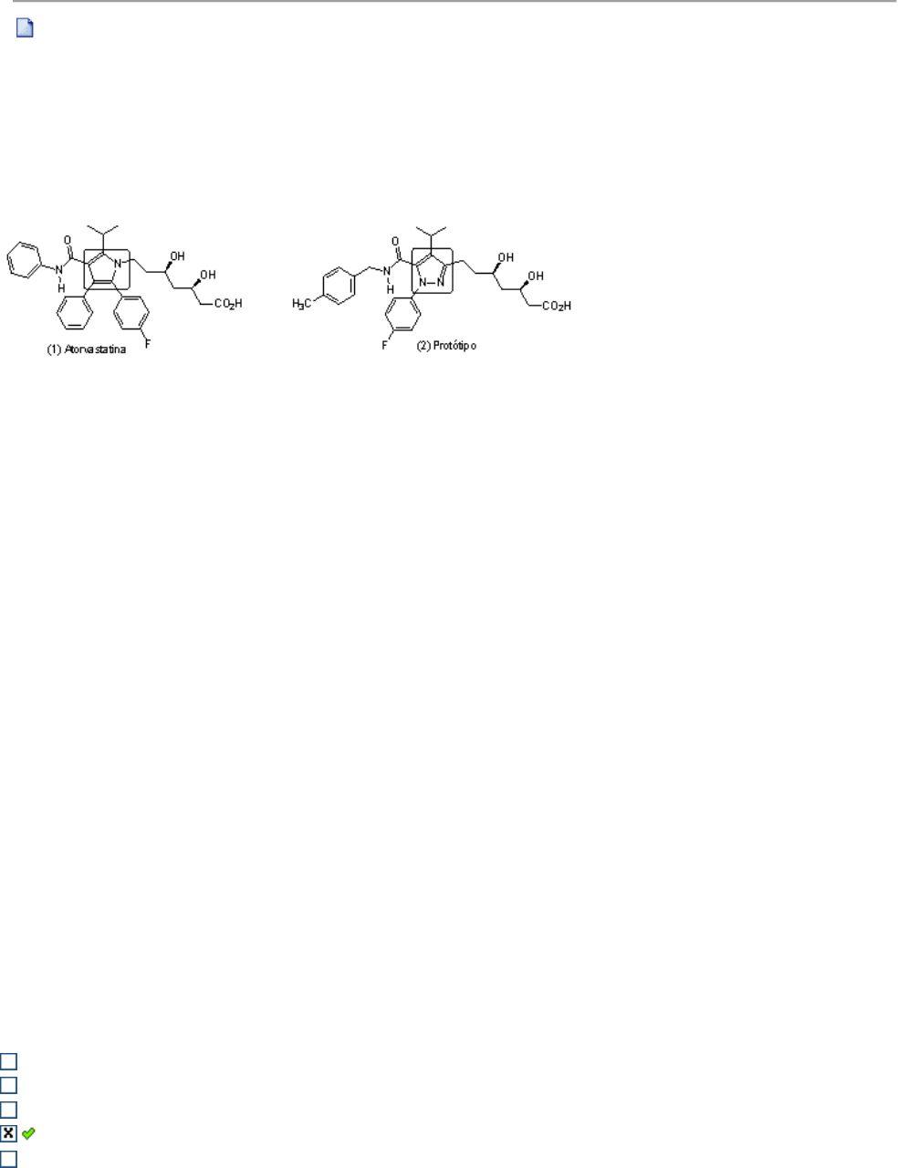 5a Questão (Ref.: 201401398754) Pontos: 0,1 / 0,1 A atorvastatna (1) é um fármaco inibidor da biossínetese de colesterol, atua na inibição da enzima HMG-CoA redutase, apresentando como vantagem suplementar aos outros membros da classe disponíveis no mercado, a propriedade de reduzir também a concentração plasmática de lipoproteínas de baixa densidade, em menor dose e mais rapidamente, permitindo um melhor ajuste à posologia. Em 2008, pesquisadores da Pfizer, em Ann Arbor, EUA, identificaram propriedades antilipêmicas superiores àquelas da atorvastatina nos sais sódicos de isósteros pirazólicos como o protótipo (2). A partir dos anéis assinalados nas figuras podemos identificar o bioisosterismo: Clássico Divalente Clássico Trivalente De simplificação molecular De anéis Clássico Monovalente QUÍMICA MEDICINAL Simulado: SDE0170_SM_201401064019 V.1 Aluno(a): MAYARA GOMES DA SILVA Matrícula: 201401064019 Desempenho: 0,3 de 0,5 Data: 19/04/2017 12:10:21 (Finalizada) 1a Questão (Ref.: 201401265270) Pontos: 0,1 / 0,1 O grande arsenal terapêutico atual produzido pela indústria farmoquímica é provido por sínteses orgânicas baseadas na descoberta de fármacos cuja matéria-prima pode ser do tipo vegetal (V), não vegetal (N) e marinha (M). Além disso, muitos fármacos foram descobertos de maneira inusitada, o que denominamos de ¿descobertos ao acaso¿(A). Assinale qual fármaco apresenta origem marinha. Sildenafil Metsergida Zidovudina Penicilina Morfina 2a Questão (Ref.: 201401265269) Pontos: 0,0 / 0,1 O processo de desenvolvimento de um novo fármaco envolve diversas etapas que não requer somente seu desenho e síntese, mas também o desenvolvimento de testes e procedimentos que são necessários para estabelecer como uma substância age e a sua adequação para uso. Desta forma, o estudo clínico de um novo fármaco pode ser definido como ¿qualquer investigação em seres humanos, objetivando descobrir ou verificar os efeitos farmacodinâmicos, farmacológicos, clínicos e/ou outros efeitos de produto(s) e/ou identificar reações adversas ao produto(s) em investigação, com o objetivo de averiguar sua segurança e/ou eficácia.¿ (EMEA, 1997). Com base nesta informação, assinale quais a alternativas são verdadeiras (V) e quais são falsas (F). Os estudos de fase clínica podem ser divididos em fase I e II, onde na fase II estudos internacionais, de larga escala, em múltiplos centros, com diferentes populações de pacientes (população mínima aprox. 800) são efetuados para demonstrar eficácia e segurança Mais de 90% das substâncias estudadas nesta fase, são eliminadas devido a limitações biofarmacêuticas. Esta etapa ainda é efetuada na fase pré-clínica Os estudos clínicos abrangem a aplicação de uma nova molécula em animais depois de identificada como potencialmente terapêutica em diferentes experimentações in vitro Nos estudos de Fase I, a avaliação é feita em humanos saudáveis (20 a 100). É o primeiro estudo de um novo fármaco ou nova formulação em seres humanos e pequenos grupos de pessoas voluntárias. Todos os fármacos e medicamentos para que possam ser comercializados precisam ser registrados junto a órgãos regulamentadores como, por exemplo, a ANVISA e o FDA. Portanto, fármacos que são utilizados na cultura popular não carecem de serem registrados desde que sua eficácia atrelada ao uso já tenha sido provada ao longo dos anos 3a Questão (Ref.: 201401263657) Pontos: 0,0 / 0,1 O processo de desenvolvimento de um novo fármaco envolve diversas etapas que não requer somente seu desenho e síntese, mas também o desenvolvimento de testes e procedimentos que são necessários para estabelecer como uma substância age e a sua adequação para uso. Desta forma, o estudo clínico de um novo fármaco pode ser definido como ¿qualquer investigação em seres humanos, objetivando descobrir ou verificar os efeitos farmacodinâmicos, farmacológicos, clínicos e/ou outros efeitos de produto(s) e/ou identificar reações