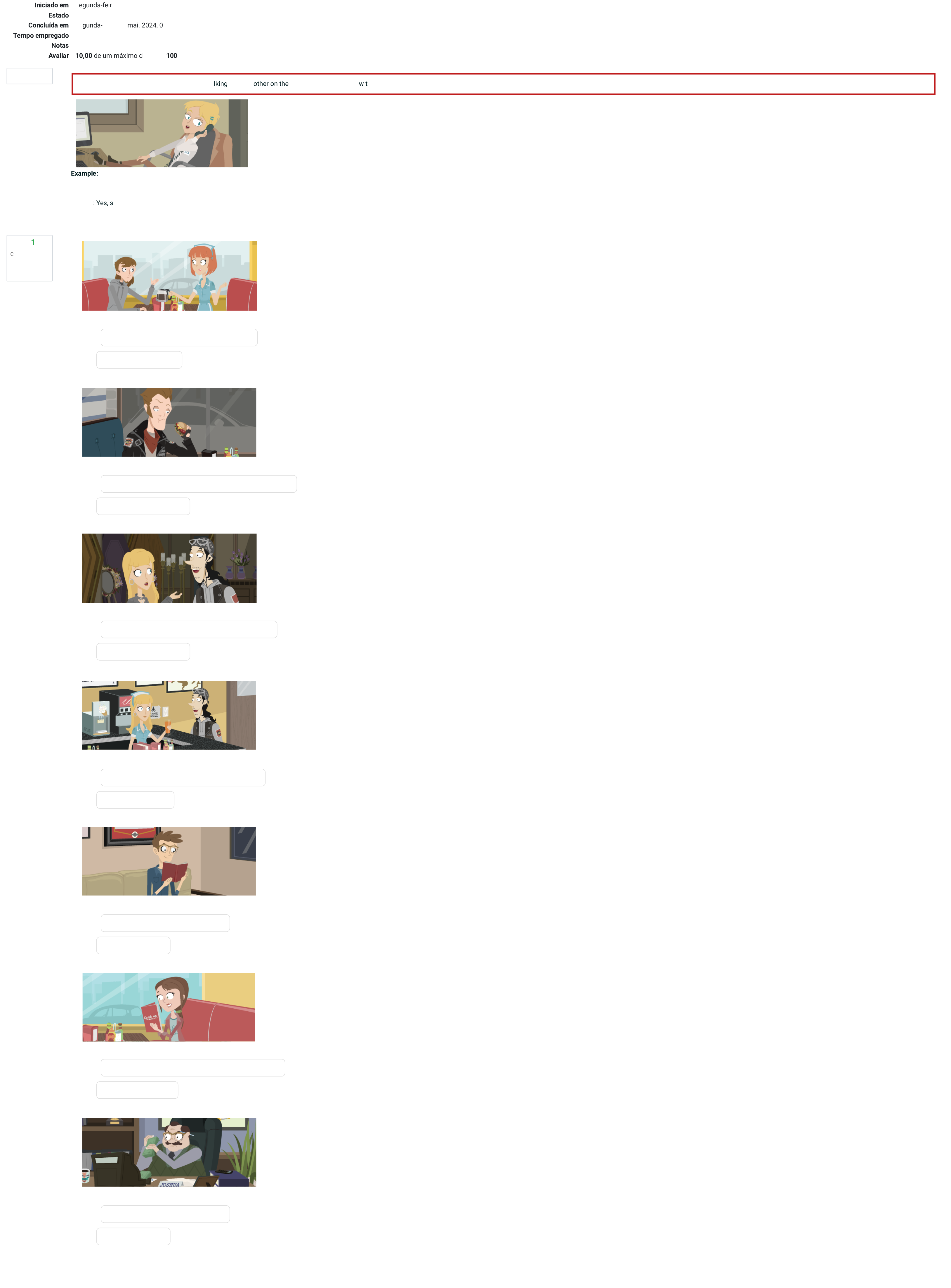 Informação Questão 1 Correto Atingiu 1,00 de 1,00 Iniciado em segunda-feira, 27 mai. 2024, 06:18 Estado Finalizada Concluída em segunda-feira, 27 mai. 2024, 06:21 Tempo empregado 3 minutos 17 segundos Notas 1,00/1,00 Avaliar 10,00 de um máximo de 10,00(100%) Regan is talking to her mother on the phone, who asks her how things are going at the diner. Based on the phone, write questions with the Present Continuous using the words given. Then, write an appropriate short answer. Example: Regan / call / mother Question: Is Regan calling her mother? Answer: Yes, she is. 1. Carlton / talk / Sarah Question: Is Carlton talking to Sarah? Answer: No, he isn't. 2. Jason and Chuck / eat / hamburger Question: Are Jason and Chuck eating a hamburger? Answer: No, they aren't. 3. Chuck and Sarah / dance / together Question: Are Chuck and Sarah dancing together? Answer: no, they aren't. 4. Sarah / work / diner Question: Is Sarah working at the diner? Answer: Yes, she is. 5. Bruno / read / book Question: Is bruno reading a book? Answer: Yes, he is. 6. Penny / look for / something to eat. Question: Is Penny looking for something to eat? Answer: Yes, she is. 7. Joshua / count / money Question: Is joshua counting money? Answer: Yes, he is.