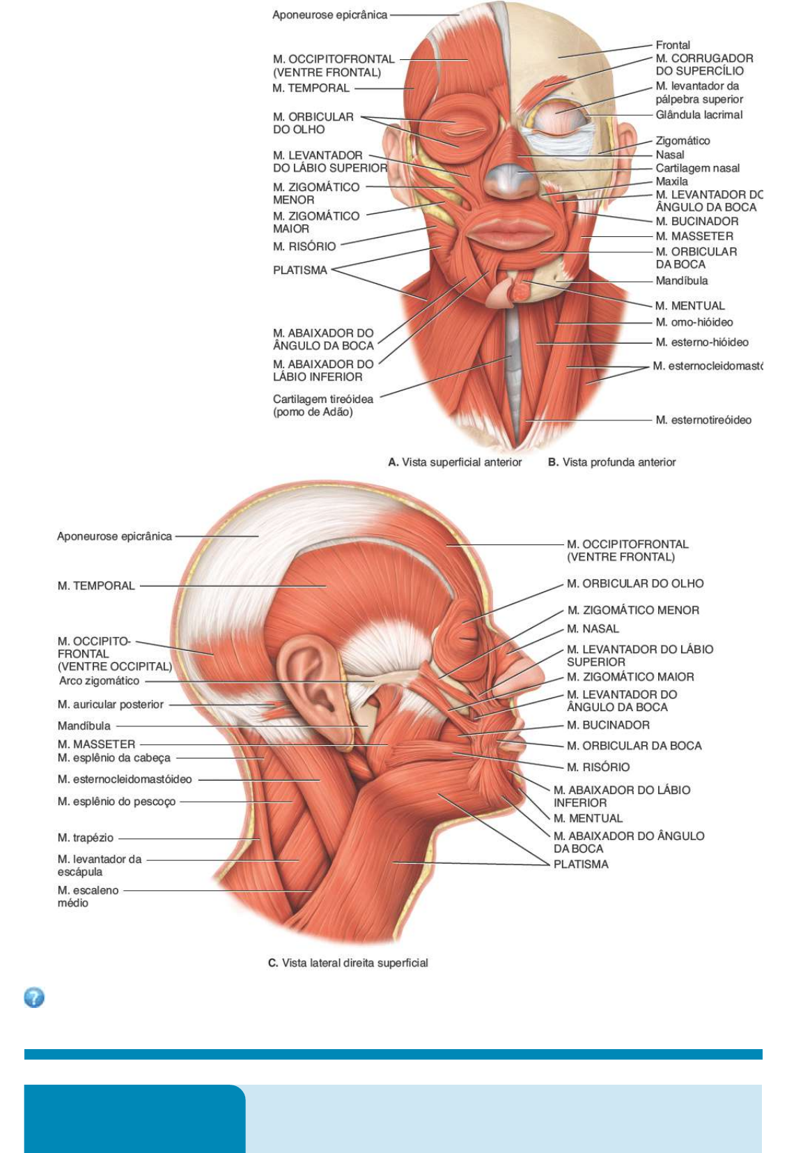 Que músculos da expressão facial fazem as expressões de desaprovação, sorriso, beicinho e olhar semicerrado? Músculos da cabeça que movimentam os bulbos dos olhos (músculos extrínsecos dos olhos) e as pálpebras • EXPO 11.B superiores (Figura 11.5) OBJETIVO Descrever a origem, a inserção, a ação e a inervação dos músculos extrínsecos dos olhos que movimentam os bulbos dos olhos e as pálpebras superiores. Os músculos que movimentam os bulbos dos olhos são chamados de músculos extrínsecos dos olhos porque se originam fora dos bulbos dos olhos (na órbita) e se inserem na face externa da esclera (Figura 11.5). Os músculos extrínsecos dos olhos estão entre os músculos esqueléticos de contração mais rápida e controle mais preciso do corpo. Três pares de músculos extrínsecos controlam os movimentos dos bulbos dos olhos: (1) Mm. retos superior e inferior, (2) Mm. retos lateral e medial e (3) Mm. oblíquos superior e inferior. Os quatro músculos retos (superior, inferior, lateral e medial) se originam de um anel tendíneo na órbita e se inserem na esclera do olho. Como o próprio nome quer dizer, os músculos reto superior e reto inferior movimentam os bulbos dos olhos para cima e para baixo; os músculos retos lateral e medial movimentam os bulbos dos olhos lateral e medialmente, respectivamente. As ações dos músculos oblíquos não podem ser deduzidas a partir de sua nomenclatura. O músculo oblíquo superior se origina posteriormente, perto do anel tendíneo, passa anterossuperiormente ao músculo reto medial e termina em um tendão redondo. O tendão se estende por uma alça em forma de polia de tecido fibrocartilaginoso chamado tróclea na parte anterior e medial da raiz da órbita. Por fim, o tendão vira e se insere na face posterolateral do bulbo do olho. Assim, o músculo oblíquo superior movimenta os bulbos dos olhos para baixo e lateralmente. O músculo oblíquo inferior se origina na maxila, na face anteromedial do assoalho da órbita. Depois, estendese posterolateralmente e se insere na face posterolateral do bulbo do olho. Desse modo, o músculo oblíquo inferior movimenta os bulbos dos olhos superior e lateralmente. Diferentemente dos músculos retos e oblíquos, o músculo levantador da pálpebra superior não movimenta os bulbos dos olhos, uma vez que seus tendões passam pelo bulbo do olho e se inserem na pálpebra superior. Em lugar disso, efetua a elevação das pálpebras superiores, isto é, abre os olhos. Portanto, é um antagonista do músculo orbicular do olho, que fecha o olho. CORRELAÇÃO CLÍNICA | Estrabismo Estrabismo é uma condição na qual os bulbos dos olhos não estão alinhados de maneira apropriada. Pode ser hereditário ou decorrente de tocotraumatismo, má inserção dos músculos, problemas com o centro de controle cerebral ou doença localizada. O estrabismo pode ser constante ou intermitente. No estrabismo, cada olho envia uma imagem para uma área diferente do encéfalo e, como na maioria das vezes o encéfalo ignora as mensagens enviadas por um dos olhos, o olho ignorado “enfraquece”. Daí o desenvolvimento de ambliopia. O estrabismo externo ocorre quando uma lesão no nervo oculomotor (NC III) faz com que o bulbo do olho se movimente lateralmente quando em repouso e resulta em incapacidade de movimentar o bulbo do olho medial e inferiormente. Uma lesão no nervo abducente (NC VI) ocasiona o estrabismo interno, uma condição na qual o bulbo do olho se movimenta medialmente quando em repouso e não consegue se mover lateralmente. As opções de tratamento para o estrabismo dependem do tipo especí co de problema e incluem cirurgia, terapia visual (retreinamento dos centros de controle cerebrais) e ortóptica (treinamento dos músculos para reti car os olhos). MÚSCULO ORIGEM INSERÇÃO AÇÃO INERVAÇÃO Reto superior (reto = fascículos paralelos à linha média) Anel tendíneo comum ( xado à órbita ao redor do forame óptico) Parte superior e central dos bulbos dos olhos Movimenta os bulbos dos olhos para cima (elevação) e medialmente (adução) e os roda medialmente Nervo oculomotor (NC III) Reto inferior Igual à do anterior Parte inferior e central dos bulbos dos olhos Movimenta os bulbos dos olhos para baixo (depressão) e medialmente (adução) e os roda lateralmente Nervo oculomotor (NC III) 8. Reto lateral Igual à do anterior Face lateral dos bulbos dos olhos Movimenta os bulbos dos olhos lateralmente (abdução) Nervo abducente (NC VI) Reto medial Igual à do anterior Face medial dos bulbos dos olhos Movimenta os bulbos dos olhos medialmente (adução) Nervo oculomotor (NC III) Oblíquo superior (oblíquo = fascículos diagonais à linha média) Esfenoide, superior e medial ao anel tendíneo comum na órbita Bulbos dos olhos entre os Mm. retos superior e lateral. O músculo se insere nas faces superior e lateral dos bulbos dos olhos via tendão que passa pela tróclea Movimenta os bulbos dos olhos para baixo (depressão) e lateralmente (abdução) e os roda medialmente Nervo troclear (NC IV) Oblíquo inferior Maxila no assoalho da órbita Bulbos dos olhos entre os Mm. retos inferior e lateral Movimenta os bulbos dos olhos para cima (elevação) e lateralmente (abdução) e os gira lateralmente Nervo oculomotor (NC III) Levantador da pálpebra superior Teto da órbita (asa menor do esfenoide) Pele e tarso da pálpebra superior Elevação da pálpebra superior (abre os olhos) Nervo oculomotor (NC III) RELAÇÃO DOS MÚSCULOS COM OS MOVIMENTOS Organize os músculos desta Expo de acordo com suas ações sobre os bulbos dos olhos: (1) elevação, (2) abaixamento, (3) abdução, (4) adução, (5) rotação medial e (6) rotação lateral. O mesmo músculo pode ser mencionado mais de uma vez. TESTE RÁPIDO Que músculos que movimentam os bulbos dos olhos se contraem e relaxam quando olhamos para a esquerda sem mexer a cabeça? Figura 11.5 Músculos da cabeça que movimentam os bulbos dos olhos (mús