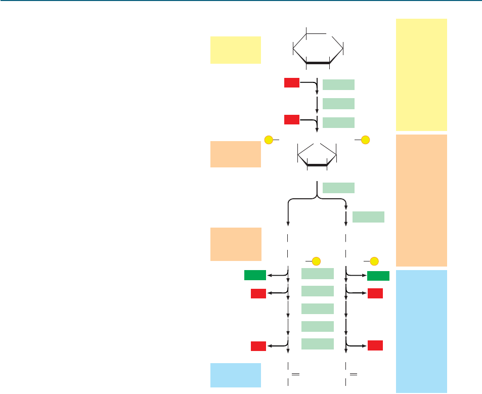 424 Fundamentos da Biologia Celular Grande parte da energia liberada pela quebra da glicose é usada para impul- sionar a síntese de moléculas de ATP a partir de ADP e Pi. Essa forma de síntese de ATP, que acontece nas etapas 7 e 10 da glicólise, é conhecida com fosforilação em nível de substrato porque ocorre por meio da transferência de um grupo fos- fato diretamente de uma molécula do substrato – um dos intermediários de açú- cares – para o ADP. Em contraste, a maioria das fosforilações nas células ocorre pela transferência do fosfato do ATP para uma molécula de substrato. O restante da energia liberada durante a glicólise é armazenado nos elétrons na molécula de NADH produzida na etapa 6 por uma reação de oxidação. Como discutido no Capítulo 3, a oxidação nem sempre envolve oxigênio; ela ocorre em qualquer reação na qual elétrons são perdidos de um átomo e transferidos para outro. Desse modo, ainda que nenhum oxigênio molecular esteja envolvido na glicólise, a oxidação ocorre na etapa 6, pois um átomo de hidrogênio mais um elétron são removidos do intermediário de açúcar gliceraldeído-3-fosfato e trans- feridos ao NAD+, produzindo NADH (ver Painel 13-1, p. 428). Ao longo da glicólise, duas moléculas de NADH são formadas por molécula de glicose. Em organismos aeróbicos, essas moléculas de NADH doam seus elé- trons para a cadeia transportadora de elétrons localizada na membrana mitocon- drial interna, como descrito em detalhes no Capítulo 14. Tais transferências de elétrons liberam energia à medida que os elétrons caem de um estado de energia mais alto para um estado mais baixo. Os elétrons transferidos ao longo da cadeia transportadora de elétrons são por fim transferidos para o O2, formando água. OH OH OH HO CH2OH CH2O CH2O OH2C O O ETAPA 1 ETAPA 2 ETAPA 3 ETAPA 4 ETAPA 5 ETAPA 6 ETAPA 7 ETAPA 8 ETAPA 9 ETAPA 10 OH CHO COO– C CH3 CHOH CH2O CHO CHOH OH HO O COO– C CH3 O Investimento de energia a ser recuperado posteriormente Clivagem do açúcar de seis carbonos em dois açúcares de três carbonos Geração de energia Uma molécula de glicose Frutose-1,6- -bifosfato Duas moléculas de gliceraldeído- -3-fosfato Duas moléculas de piruvato ATP ATP ATP ATP ATP ATP NADH NADH P P P P Figura 13-5 A quebra em etapas dos açúcares inicia-se com a glicólise. Cada uma das 10 etapas da glicólise é catalisada por uma enzima diferente. Observe que a etapa 4 cliva um açúcar de seis carbonos em dois açúcares de três carbonos, de modo que o número de moléculas em cada etapa posterior se duplica. Observe tam- bém que um dos produtos da etapa 4 deve ser modificado (isomerizado) na etapa 5 antes de prosseguir para a etapa 6 (ver Pai- nel 13-1). Como indicado, a etapa 6 inicia a fase geradora de energia da glicólise, que resulta na síntese líquida de ATP e NADH (ver também Figura 13-4). A glicólise é tam- bém algumas vezes referida como a via de Embden-Meyerhof, assim denominada em referência aos químicos que a descreveram. Todas as etapas da glicólise estão revisadas na Animação 13.1. Alberts_13.indd 424Alberts_13.indd 424 16/01/2017 10:38:2916/01/2017 10:38:29 Capítulo 13 • Como as células obtêm energia do alimento 425 Ao doar seus elétrons, NADH é convertido novamente em NAD+, que fica então disponível para ser usado mais uma vez para a glicólise. Na ausência de oxigênio, NAD+ pode ser regenerado por um tipo alternativo de reação produtora de energia, denominada fermentação, como discutimos a seguir. As fermentações podem produzir ATP na ausência de oxigênio Para a maioria das células animais e vegetais, a glicólise é apenas um prelú- dio para a terceira e última etapa de quebra das moléculas do alimento, na qual grandes quantidades de ATP são geradas nas mitocôndrias pela fosforilação oxi- dativa, um processo que requer o consumo de oxigênio. Entretanto, para muitos microrganismos anaeróbicos, que podem crescer e se dividir na ausência de oxi- gênio, a glicólise é a principal fonte de ATP. O mesmo é verdadeiro para certas células animais, como as células musculoesqueléticas, que podem continuar a funcionar em baixos níveis de oxigênio. Nessas condições anaeróbicas, o piruvato e o NADH produzidos na glicólise permanecem no citosol. O piruvato é convertido em produtos que são excreta- dos da célula: lactato nas células musculares, por exemplo, ou etanol e CO2 nas células de levedura usadas na preparação de cervejas e pães. O NADH doa seus elétrons no citosol, e é reconvertido ao NAD+ requerido para manter as reações de glicólise (Figura 13-6). Tais vias geradoras de energia que degradam o açúcar na ausência de oxigênio são denominadas fermentações. Estudos científicos de fermentações comercialmente importantes realizadas por leveduras levaram aos fundamentos da bioquímica inicial. Glicose Piruvato Lactato (A) FERMENTAÇÃO EM UMA CÉLULA MUSCULAR ATIVA (B) FERMENTAÇÃO EM LEVEDURA G lic ó lis e + H+ Regeneração de NAD+ Regeneração de NAD+ O O– C C CH3 O O O– C C CH3 OHH Piruvato Etanol G lic ó lis e + H+ H+O O– C C CH3 O CH3 H2C OH CO2 Glicose ATP ADP NADH NAD+ NAD+ ATP ADP NADH NAD+ NAD+ Figura 13-6 O piruvato é degradado na ausência de oxigênio por meio da fer- mentação. (A) Quando quantidades insu- ficientes de oxigênio estiverem presentes, por exemplo, em uma célula muscular so- frendo contração vigorosa, o piruvato pro- duzido pela glicólise é convertido a lactato no citosol. Essa reação restabelece o NAD+ consumido na etapa 6 da glicólise, mas a via como um todo produz muito menos energia do que a que seria produzida caso o piruvato fosse oxidado na mitocôndria. (B) Em microrganismos que podem crescer anaerobicamente, o piruvato é convertido em dióxido de carbono e etanol. Mais uma vez, essa via regenera NAD+ a partir de NADH, como requerido para permitir que a glicólise prossiga. Tanto (A) quanto (B