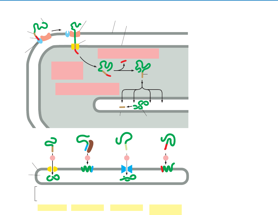CAPÍTULO 12 Compartimentos intracelulares e endereçamento de proteínas 665 nais podem, portanto, ser resultado de evolução convergente, refletindo as necessidades comuns para a translocação pelo sistema de membrana dupla. Embora as sequências-sinal para a importação em cloroplastos assemelhem-se su- perficialmente àquelas para a importação em mitocôndrias, tanto as mitocôndrias como os cloroplastos estão presentes nas mesmas células vegetais e, assim, as proteínas devem escolher entre as duas organelas de maneira apropriada. Em plantas, por exemplo, uma enzima bacteriana pode ser direcionada especificamente para mitocôndrias se ela for ligada, de forma experimental, a uma sequência-sinal N-terminal de uma proteína mito- condrial; a mesma enzima, unida a uma sequência-sinal N-terminal de uma proteína de cloroplasto, acumula-se em cloroplastos. As diferentes sequências-sinal podem, portan- to, ser distinguidas pelos receptores de importação em cada organela. Os cloroplastos apresentam um compartimento extra envolto por membranas, o tilacoide. Muitas proteínas de cloroplastos, incluindo as subunidades proteicas do sistema fotossintético e da ATP-sintase (discutido no Capítulo 14), são localizadas na membrana tilacoide. Assim como os precursores de algumas proteínas mitocondriais, os precursores dessas proteínas são translocados do citosol para o seu destino final em duas etapas. Primeiro, eles atravessam a dupla membrana para o espaço da matriz (cha- mado de estroma nos cloroplastos), e então eles ou integram a membrana tilacoide ou translocam-se para o espaço tilacoide (Figura 12-26A). Os precursores dessas proteínas possuem uma sequência-sinal tilacoide hidrofóbica seguindo a sequência-sinal N-ter- minal do cloroplasto. Após a sequência-sinal N-terminal ter sido utilizada para importar a proteína no estroma, ela é removida por uma peptidase-sinal do estroma, expondo a sequência-sinal tilacoide que inicia, então, o transporte através da membrana tilacoide. Existem pelo menos quatro vias por meio das quais as proteínas atravessam ou tornam- Figura 12-26 Translocação de uma proteína precursora no espaço tila- coide de cloroplastos. (A) A proteína precursora contém uma sequência-sinal do cloroplasto N-terminal (vermelho) imedia- tamente seguida de uma sequência-sinal tilacoide (marrom). A sequência-sinal do cloroplasto inicia a translocação no estro- ma por um mecanismo semelhante àquele usado por proteínas precursoras mitocon- driais de translocação no espaço da ma- triz, embora os complexos translocadores, TOC e TIC, sejam diferentes. A sequência- -sinal é clivada, expondo a sequência-sinal tilacoide, que inicia a translocação através da membrana tilacoide. (B) A translocação para o espaço tilacoide, ou membrana tilacoide, pode ocorrer por uma de pelo menos quatro vias: (1) uma via Sec, assim chamada porque utiliza componentes que são homólogos de proteínas Sec, que me- deiam a translocação de proteínas através da membrana plasmática bacteriana (dis- cutido adiante), (2) uma via tipo SRP, assim denominada porque usa uma partícula de reconhecimento de sinal homóloga de cloroplasto, ou SRP (discutido adiante), (3) uma via TAT (translocação de duas argininas, de twin arginine translocation), assim chamada porque duas argininas são cruciais nas sequências-sinal que dirigem proteínas nessa via, a qual depende de um gradiente de H+ através da membrana tilacoide, e (4) uma via de inserção es- pontânea, que parece não necessitar de translocador de proteínas. CITOSOL ESTROMA TRANSLOCAÇÃO GTP- OU ATP- -DEPENDENTE NO ESTROMA Sequência-sinal tilacoide exposta QUATRO VIAS PARA TRANSLOCAR PROTEÍNAS NO ESPAÇO TILACOIDE Membrana tilacoide Proteína madura no espaço tilacoide Membrana externa do cloroplastoComplexo TOC Complexo TIC Membrana interna do cloroplasto Proteína tilacoide precursora Sequência- -sinal tilacoide Sequência- -sinal do cloroplasto Proteína receptora no complexo TOC (A) (B) 1 2 43Membrana tilacoide Espaço tilacoide Necessidade energética ATP + gradiente eletroquímico de H+ ATP + gradiente eletroquímico de H+ Gradiente eletroquímico de H+ Nenhuma Via Sec Via tipo SRP Via TAT Inserção espontânea CLIVAGEM DA SEQUÊNCIA- -SINAL DO CLOROPLASTO TILACOIDE TILACOIDE ESTROMA 666 PARTE IV Organização interna da célula -se integradas na membrana tilacoide, diferenciadas pelas suas necessidades por dife- rentes chaperonas do estroma ou pela fonte de energia usada (Figura 12-26B). Resumo Embora as mitocôndrias e os cloroplastos tenham seus próprios sistemas genéticos, eles pro- duzem apenas uma pequena porção de suas proteínas. As duas organelas importam do ci- tosol a maioria das suas proteínas utilizando mecanismos semelhantes. Em ambos os casos, as proteínas são importadas no estado desenovelado tanto através da membrana externa quanto da membrana interna simultaneamente para o espaço da matriz ou estroma. A hi- drólise de ATP e um potencial de membrana através da membrana interna dirigem a trans- locação para a mitocôndria, enquanto a translocação em cloroplastos é dirigida somente pela hidrólise de GTP e de ATP. As proteínas chaperonas da família hsp70 citosólica mantêm as proteínas precursoras em um estado desenovelado, e um segundo conjunto de proteínas hsp70 no espaço da matriz ou no estroma puxa a cadeia polipeptídica importada para a organela. Apenas as proteínas que contêm uma sequência-sinal específica são translocadas. A sequência-sinal em geral está localizada na região N-terminal e é clivada depois de ser importada ou internalizada e retida. Os transportes para a membrana interna algumas vezes usam uma segunda sequência-sinal hidrofóbica que é exposta quando a primeira se- quência-sinal é removida. Em cloroplastos, a importação do estroma para o tilacoide pode ocorrer por várias vias, que diferem pelas chaperonas e pela fonte d