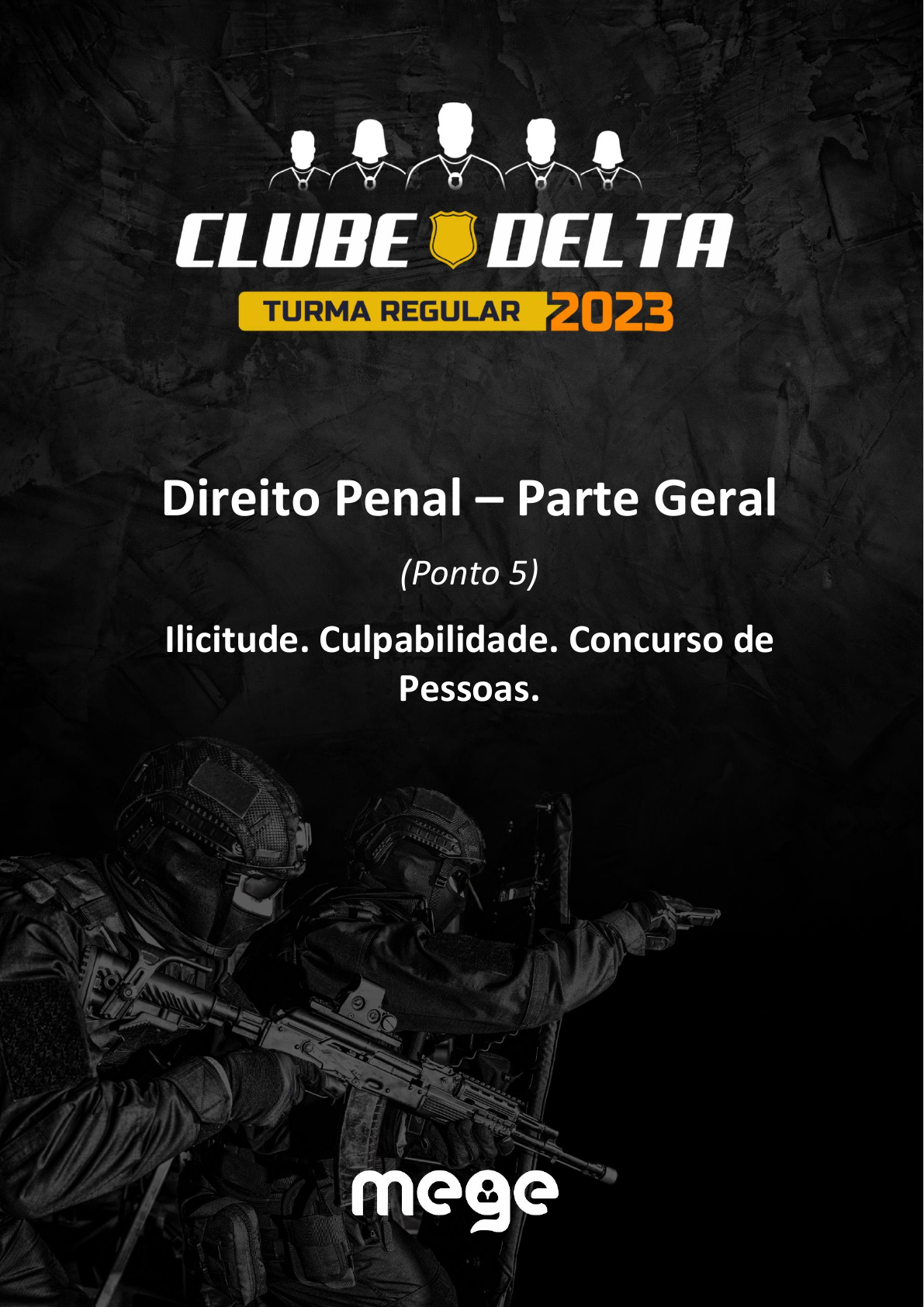 CPF: 860.542.154-18 PACHEGO GONÇALVES | 9999999999 | alesantosf2020@gmail.com | CPF: 860.542.154-18 É proibida a reprodução deste material sem a devida autorização, sob pena da adoção das medidas cabíveis na esfera cível e penal. 1 Direito Penal – Parte Geral (Ponto 5) Ilicitude. Culpabilidade. Concurso de Pessoas. CPF: 860.542.154-18 PACHEGO GONÇALVES | 9999999999 | alesantosf2020@gmail.com | CPF: 860.542.154-18 É proibida a reprodução deste material sem a devida autorização, sob pena da adoção das medidas cabíveis na esfera cível e penal. 2 CURSO MEGE Site para cadastro: www.mege.com.br Celular / Whatsapp: (99) 982622200 (Tim) Fanpage: /cursomege Instagram: @cursomege Material: Direito Penal – Parte Geral (Ponto 5) Direito Penal – Parte Geral (Ponto 5) Ilicitude. Culpabilidade. Concurso de Pessoas. CPF: 860.542.154-18 PACHEGO GONÇALVES | 9999999999 | alesantosf2020@gmail.com | CPF: 860.542.154-18 É proibida a reprodução deste material sem a devida autorização, sob pena da adoção das medidas cabíveis na esfera cível e penal. 3 SUMÁRIO 1. DOUTRINA (RESUMO) ................................................................................................... 4 1.1. ILICITUDE (OU ANTIJURIDICIDADE) ........................................................................... 4 1.2. CULPABILIDADE ....................................................................................................... 19 1.3. ERRO DE TIPO .......................................................................................................... 38 1.4. ERRO DE PROIBIÇÃO ................................................................................................ 41 1.5. DESCRIMINANTES PUTATIVAS ................................................................................. 42 1.6. CONCURSO DE PESSOAS .......................................................................................... 43 2. JURISPRUDÊNCIA ........................................................................................................ 58 3. QUESTÕES ................................................................................................................... 60 4. GABARITO COMENTADO ............................................................................................ 73 CPF: 860.542.154-18 PACHEGO GONÇALVES | 9999999999 | alesantosf2020@gmail.com | CPF: 860.542.154-18 É proibida a reprodução deste material sem a devida autorização, sob pena da adoção das medidas cabíveis na esfera cível e penal. 4 1. DOUTRINA (RESUMO) 1.1. ILICITUDE (OU ANTIJURIDICIDADE) CRIME Fato típico Antijurídico Culpável 1.1.1. CONCEITO DE ILICITUDE Contrariedade da conduta com o ordenamento jurídico. Observação: Quer se adote a teoria causalista, quer se adote a teoria finalista (tripartite ou bipartite), a ilicitude é o segundo substrato do crime. Para que o crime exista é necessário que a conduta tenha gerado um resultado com ajuste, formal e material, a um tipo penal. Ex.: se “A” mata “B”, pratica um fato típico, pois a conduta se encaixa no tipo penal previsto no art. 121 do CP. Em seguida, é necessário verificar se esta violação típica é ou não permitida pelo ordenamento jurídico. Se não houver permissão, haverá ilicitude; se, porém, o fato não for contrário ao ordenamento, não haverá ilicitude do comportamento, desaparecendo, portanto, o próprio crime. É o que ocorre, por exemplo, se “A” tiver matado “B” em legítima defesa, atitude contemplada pela lei. Logo, embora o fato seja típico, não será ilícito. E, não sendo ilícito, não configura crime. O que é ilicitude formal e ilicitude material? • Ilicitude formal - contrariedade da conduta com o direito. • Ilicitude material - contrariedade da conduta com todo o ordenamento jurídico, causando lesão a um bem jurídico tutelado. Na análise da relação entre a tipicidade e a ilicitude, no Brasil, predomina o entendimento de que a tipicidade é indício da ilicitude (ratio cognoscendi). Se ocorrer um fato típico, ele se presume ilícito (presunção relativa). Portanto, o ônus da prova sobre a existência de uma causa de exclusão da ilicitude é da defesa. 1.1.2. CAUSAS EXCLUDENTES DE ILICITUDE (DESCRIMINANTES/ JUSTIFICANTES/ EXIMENTES) O CP traz quatro causas (genéricas) de exclusão de ilicitude no art. 23: CPF: 860.542.154-18 PACHEGO GONÇALVES | 9999999999 | alesantosf2020@gmail.com | CPF: 860.542.154-18 É proibida a reprodução deste material sem a devida autorização, sob pena da adoção das medidas cabíveis na esfera cível e penal. 5 Exclusão da ilicitude Art. 23 Não há crime quando o agente pratica o fato: I - estado de necessidade. II - legítima defesa. III - estrito cumprimento do dever legal ou exercício regular de direito. Temos ainda causas específicas, como o aborto necessário (art. 128, I, CP): Art. 128 - Não se pune o aborto praticado por médico: Aborto necessário I - se não há outro meio de salvar a vida da gestante; Aponta-se, também, a existência de uma causa supralegal de exclusão da ilicitude (não prevista expressamente em lei): o consentimento do ofendido. Para que afaste a ilicitude, deve ser prévio ou ao menos concomitante à conduta. Para valer a excludente, é preciso que o agente tenha conhecimento de que age sob o seu amparo? Se considera o elemento subjetivo? Ex.: sujeito invade residência alheia. Ao fazê-lo, mesmo sem saber, acabou se salvando de ser atacado por um animal feroz que estava solto naquele local. Existem duas teorias a respeito: Teoria objetiva Não é necessário. As excludentes são objetivas. É uma teoria adotada, em regra, pelos causalistas, que veem a tipicidade de modo objetivo (sem dolo e culpa) e também a ilicitude. No exemplo anterior, o agente não responderia por invasão de domicílio (Magalhães Noronha). Teoria subjetiva (amplamente majoritária) O elemento subjetivo deve ser considerado. É a teoria ma