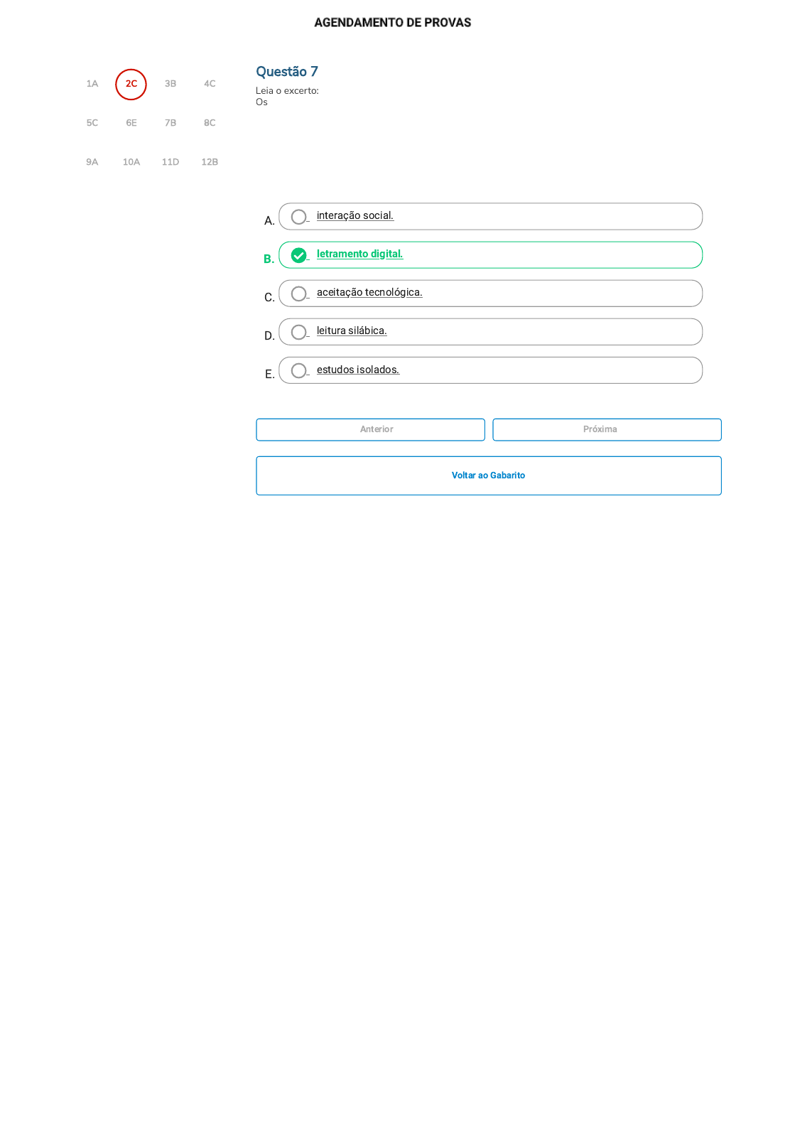 1A 2C 3B 4C 5C 6E 7B 8C 9A 10A 11D 12B Voltar ao Gabarito Questão 7 Leia o excerto: Os avanços tecnológicos e digitais e a facilidade de acesso aos recursos digitais tornaram a leitura e a escrita presentes em e-mails, fóruns, chats, blogs, páginas de internet, sites de busca, entre outros, que seguem uma lógica diferente dos livros e das cartas, como ocorria até meados da década de 1990 no Brasil. (DALBEN, Adilson. Inovação educacional. Editora Educacional: Londrina, 2020, p. 134.) Diante desse contexto, os desa�os educacionais se limitavam a alfabetizar e a melhorar o nível de letramento, porém, agora, é necessário também melhorar o nível de: A. interação social. B. letramento digital. C. aceitação tecnológica. D. leitura silábica. E. estudos isolados. Anterior Próxima