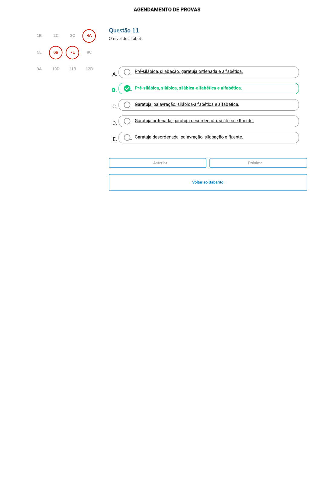 1B 2C 3C 4A 5E 6B 7E 8C 9A 10D 11B 12B Voltar ao Gabarito Questão 11 O nível de alfabetização de uma criança pode ser classi�cado de acordo com a relação que ela consegue estabelecer entre os sons e seus registros escritos. Considerando a psicogênese da língua escrita, assinale a alternativa que apresenta corretamente as etapas/níveis do processo de alfabetização: A. Pré-silábica, silabação, garatuja ordenada e alfabética. B. Pré-silábica, silábica, silábica-alfabética e alfabética. C. Garatuja, palavração, silábica-alfabética e alfabética. D. Garatuja ordenada, garatuja desordenada, silábica e fluente. E. Garatuja desordenada, palavração, silabação e fluente. Anterior Próxima