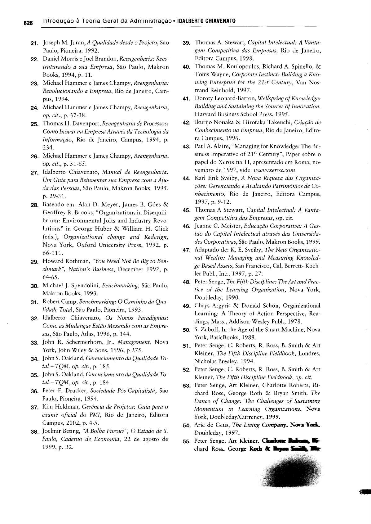 626 Introdução à Teoria Geral da Administração· IDALBERTO CHIAVENATO 21. Joseph M. Juran, A Qualidade desde o Projeto, São Paulo, Pioneira, 1992. 22. Daniel Morris e Joel Brandon, Reengenharia: Rees truturando a sua Empresa, São Paulo, Makron Books, 1994, p. 11. 23. Michael Hammer e James Champy, Reengenharia: Revolucionando a Empresa, Rio de Janeiro, Cam pus, 1994. 24. Michael Hammer e James Champy, Reengenharia, op. cit., p. 37-38. 25. Thomas H. Davenport, Reengenharia de Processos: Como Inovar na Empresa Através da Tecnologia da Informação, Rio de Janeiro, Campus, 1994, p. 234. 26. Michael Hammer e James Champy, Reengenharia, op. cit., p. 51-65. 27. Idalberto Chiavenato, Manual de Reengenharia: Um Guia para Reinventar sua Empresa com a Aju da das Pessoas, São Paulo, Makron Books, 1995, p.29-31. 28. Baseado em: Alan D. Meyer, James B. Góes & Geoffrey R. Brooks, "Organizations in Disequili brium: Environmental Jolts and Industry Revo lutions" in George Huber & Wil1iam H. Glick (eds.), Organizational change and Redesign, Nova York, Oxford Unicersity Press, 1992, p. 66-111. 29. Howard Rothman, "You Need Not Be Big to Ben chmark", Nation's Business, December 1992, p. 64-65. 30. Michael J. Spendolini, Benchmarking, São Paulo, Makron Books, 1993. 31. Robert Camp, Benchmarking: O Caminho da Qua lidade Total, São Paulo, Pioneira, 1993. 32. Idalberto Chiavenato, Os Novos Paradigmas: Como as Mudanças Estão Mexendo com as Empre sas, São Paulo, Atlas, 1996, p. 144. 33. John R. Schermerhorn, Jr., Management, Nova York, John Wiley & Sons, 1996, p 275. 34. John S. Oakland, Gerenciamento da Qualidade To tal- TQM, op. cit., p. 185. 35. John S. Oakland, Gerenciamento da Qualidade To tal - TQM, op. cit., p. 184. 36. Peter F. Drucker, Sociedade Pós-Capitalista, São Paulo, Pioneira, 1994. 37. Kim Heldman, Gerência de Projetos: Guia para o exame oficial do PMI, Rio de Janeiro, Editora Campus, 2002, p. 4-5. 38. Joelmir Beting, "A Bolha Furou?", O Estado de S. Paulo, Caderno de Economia, 22 de agosto de 1999, p. B2. 39. Thomas A. Stewart, Capital Intelectual: A Vanta gem Competitiva das Empresas, Rio de Janeiro, Editora Campus, 1998. 40. Thomas M. Koulopoulos, Richard A. Spinel1o, & Toms Wayne, Corporate Instinct: Building a Kno wing Enterprise for the 21st Century, Van Nos trand Reinhold, 1997. 41. Doroty Leonard-Barton, Wellspring ofKnowledge: Building and Sustaining the Sources of Innovation, Harvard Business School Press, 1995. 42. Ikurijo Nonaka & Hirotaka Takeuchi, Criação de Conhecimento na Empresa, Rio de Janeiro, Edito ra Campus, 1996. 43. Paul A. Alaire, "Managing for Knowledge: The Bu siness Imperative of 21 sI Century", Paper sobre o papel do Xerox na TI, apresentado em Roma, no vembro de 1997, vide: www:xerox.com. 44. Karl Erik Sveiby, A Nova Riqueza das Organiza ções: Gerenciando e Avaliando Patrimônios de Co nhecimento, Rio de Janeiro, Editora Campus, 1997, p. 9-12. 45. Thomas A Stewart, Capital Intelectual: A Vanta gem Competitiva das Empresas, op. cito 46. Jeanne C. Meister, Educação Corporativa: A Ges tão do Capital Intelectual através das Universida des Corporativas, São Paulo, Makron Books, 1999. 47. Adaptado de: K. E. Sveiby, The New Organizatio nal Wealth: Managing and Measuring Knowled ge-Based Assets, San Francisco, Cal, Berrett- Koeh ler Publ., Inc., 1997, p. 27. 48. Peter Senge, The Fifth Discipline: The Art and Prac tice of the Learning Organization, Nova York, Doubleday, 1990. 49. Chrys Argyris & Donald Schõn, Organizational Learning: A Theory of Action Perspective, Rea dings, Mass., Addison-Wesley Publ., 1978. 50. S. Zuboff, In the Age of the Smart Machine, Nova York, BasicBooks, 1988. 51. Peter Senge, C. Roberts, R. Ross, B. Smith & Art Kleiner, The Fifth Discipline Fieldbook, Londres, Nicholas Brealey, 1994. 52. Peter Senge, C. Roberts, R. Ross, B. Smith & Art Kleiner, The Fifth Discipline Fieldbook, op. cito 53. Peter Senge, Art Kleiner, Charlotte Roberts, Ri chard Ross, George Roth & Bryan Smith. The Dance of Change: The Challenges of Sust.úning Momentum in Learning Organi::Jtiolls. ~~.2 York, Doubleday/Currency. 1999. 54. Arie de Geus, The Living Comp.lIf}·. ~.a l--' Doubleday. 1997. 55. Peter Senge. An KIeiner. Chw'J__ • , --Ji li chard Ross., George Roda .I[ .... SíIiiII., .., ------- --------~~==........-=;;;;;;;;;;;;;;;;;;;;;O;~--- 74. Michael A. Mische, Strategic Renewal: Becoming a High Performance Organization, op. cito 75. Alfred A. Chandler, Strategy and Structure: Chap ters in the History of the Industrial Enterprise, Cambridge, Mass., MIT Press, 1962. 76. R.E. Miles e c.c. Snow, Organizational Strategy: Structure, and Process, Nova York, McGraw-Hill, 1978. 77. Idalberto Chiavenato, Administração: Teoria, Pro cesso e Prática, São Paulo, Makron/Pioneira, 2000. 78. C. Baden-Fuller & J.M. Rejuvenating the Mature Business: The Competitive Challenge, Boston, Harvard Business School Press, 1992 79. Y.L.Doz & H. Thanheiser, "Embedding Transfor mational Capability", ICEDR, October 1996. Fo rum Embedding Transformational Capability, Fountainebleau, France, INSEAD, 1996 80. Henry Mintzberg, Bruce Ahlstrand & Joseph Lam pel, Safári de Estratégia, op. cit., p. 165. 81. Harry A Lipson, "Do Corporate Executives Plan for Social Responsability?", Business and Society Review, Winter 1974-75, p. 80-81 82. Keith Davis & Robert L. Blomstrom, Business and Society: Environment and Responsibility, Nova York, McGraw-Hill, 1975 83. Keith Davis, "Five Propositions for Social Respon sibility", Business Horizons, June 975, p. 19-24 84. Samuel C. Certo, Modern Management: Diversity, Quality, Ethics, and the Global Environment, Nedham Heights, MA, Allyn & Bacon, 1994, p. 58 85. Keith Davis & Robert L. Blomstrom, Business and Society, op. cito 86. Idalberto Chiavenato, Comportamento Organiza cional: A Dinâmica do Sucesso das Organizações, São Paulo, Thomson Learning, 2003, p. 49 87. Veja os sites: www.voluntarios.com.br www.uol.com.br/voluntarios www