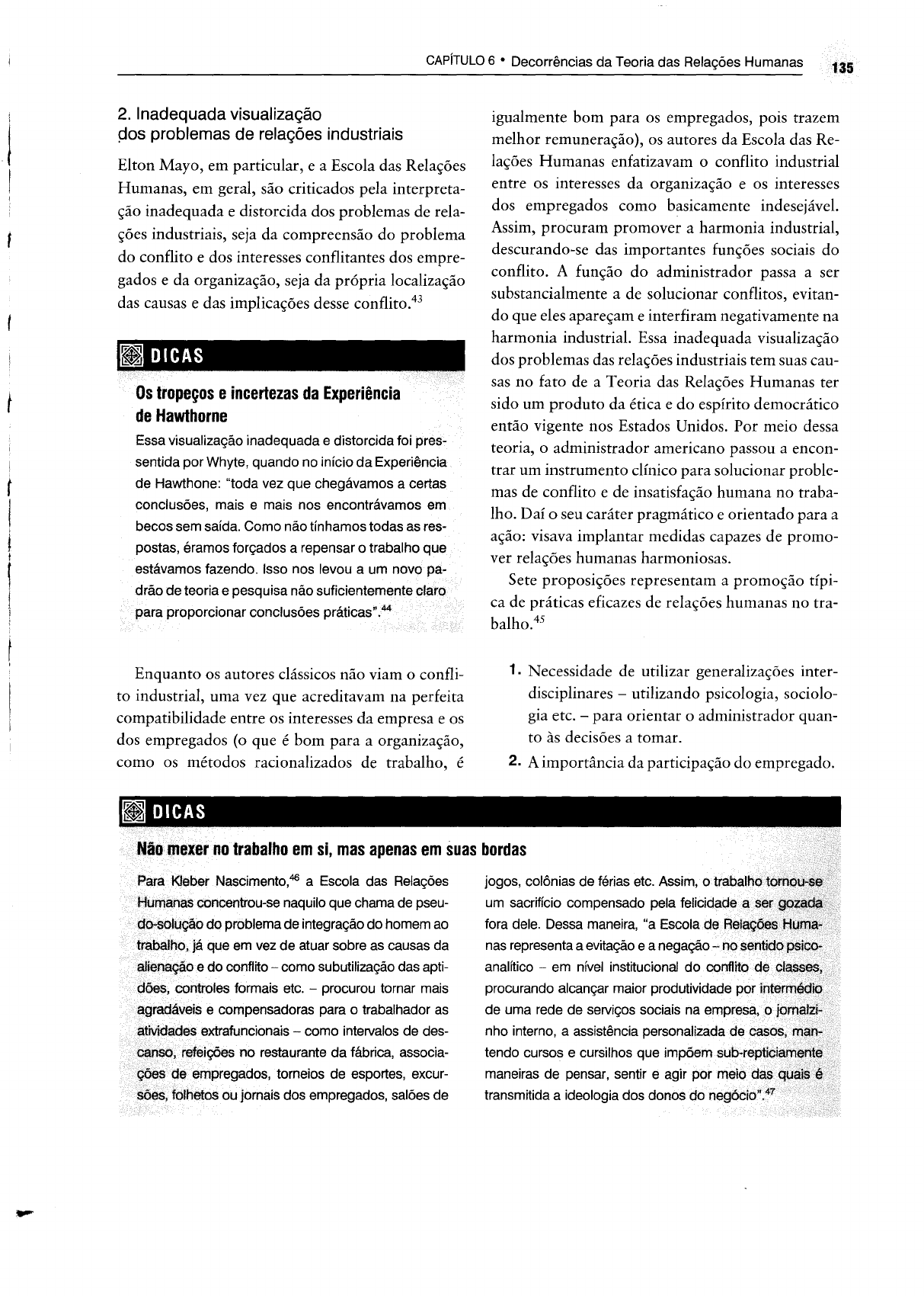 CAPíTULO 6 • Decorrências da Teoria das Relações Humanas 135 2. Inadequada visualização 90S problemas de relações industriais Elton Mayo, em particular, e a Escola das Relações Humanas, em geral, são criticados pela interpreta ção inadequada e distorcida dos problemas de rela ções industriais, seja da compreensão do problema do conflito e dos interesses conflitantes dos empre gados e da organização, seja da própria localização das causas e das implicações desse conflito.43 ~ DICAS Os tropeços eincertezas da Experiência de Hawthorne Essa visualização inadequada e distorcida foi pres sentida por Whyte, quando no início da Experiência de Hawthone: "toda vez que chegávamos a certas conclusões, mais e mais nos encontrávamos em becos sem saída. Como não tínhamos todas as res postas, éramos forçados a repensar o trabalho que estávamos fazendo. Isso nos levou a um novo pa drão de teoria e pesquisa não suficientemente para proporcionar conclusões práticas· igualmente bom para os empregados, pois trazem melhor remuneração), os autores da Escola das Re lações Humanas enfatizavam o conflito industrial entre os interesses da organização e os interesses dos empregados como basicamente indesejável. Assim, procuram promover a harmonia industrial, descurando-se das importantes funções sociais do conflito. A função do administrador passa a ser substancialmente a de solucionar conflitos, evitan do que eles apareçam e interfiram negativamente na harmonia industrial. Essa inadequada visualização dos problemas das relações industriais tem suas cau sas no fato de a Teoria das Relações Humanas ter sido um produto da ética e do espírito democrático então vigente nos Estados Unidos. Por meio dessa teoria, o administrador americano passou a encon trar um instrumento clínico para solucionar proble mas de conflito e de insatisfação humana no traba lho. Daí o seu caráter pragmático e orientado para a ação: visava implantar medidas capazes de promo ver relações humanas harmoniosas. Sete proposições representam a promoção típi ca de práticas eficazes de relações humanas no tra balho.45 Enquanto os autores clássicos não viam o confli to industrial, uma vez que acreditavam na perfeita compatibilidade entre os interesses da empresa e os dos empregados (o que é bom para a organização, como os métodos racionalizados de trabalho, é 1. Necessidade de utilizar generalizações inter disciplinares - utilizando psicologia, sociolo gia etc. - para orientar o administrador quan to às decisões a tomar. 2. A importância da participação do empregado. tral~altlo em si, mas apenas em suas bordas jogos, colônias de férias etc. Assim, um sacrifício compensado pela felil::idéldé fora dele. Dessa maneira, "a nas representa a evitação e a ne!Jaç:ão analítico - em nível institucional do procurando alcançar maior produtividade de uma rede de serviços sociais na errme.Sa. nho interno, a assistência per'sollalizacla tendo cursos e cursilhos que im~)õeln1 maneiras de pensar, sentir e agir transmitida a ideologia dos Nascimento,46 a Escola das Relações HlJmal1êll; CtmcentroLI-se naquilo que chama de pseu problema de integração do homem ao que em vez de atuar sobre as causas da AIii~hí;I~Ã.,n A do conflito - como subutilização das apti co.1trcl/es formais etc. - procurou tornar mais tiJ,91'adáveris e compensadoras para o trabalhador as ati\4déilders extrafuncionais - como intervalos de des ~fl~iç<)es no restaurante da fábrica, associa- errfprE~gatdO:s, torneios de esportes, excur fôffletC)$ ou jornais dos empregados, salões de 136 Introdução à Teoria Geral da Administração· iDALBERTO CHIAVENATO 3. Estudo dos papéis sociais que o empregado desempenha na organização. 4. A função da comunicação, da liderança e da motivação. ') A necessidade de trabalho em equipe. s. A constatação de que a organização é um siste ma social. Desenvolvimento da habilidade do adminis trador em relaçôes humanas. 3. Concepção ingênua e romântica do operário Outro aspecto dessa inadequada visualização dos problemas das relações industriais é exatamente a concepção ingênua e romântica do operário desen volvida por essa teoria. Os autores das décadas de 1940 e 1950 imaginavam um trabalhador feliz, produtivo e integrado no ambiente de trabalho. Contudo, essa imagem nem sempre foi confirmada por pesquisas posteriores, que descobriram traba lhadores felizes e improdutivos, bem como infeli zes e produtivos, descaracterizando a correlação entre satisfação e produtividade. Verificou-se tam bém que o supervisor liberal e concentrado no tra balhador nem sempre era o responsável pelos gru pos mais produtivos e que a consulta participativa criava mais problemas do que aqueles que resolvia. Os trabalhos de dinâmica de grupo, inicialmente otimistas, visionários e calcados em princípios éti cos preconcebidos, foram paulatinamente seguin do uma linha analítica e experimental.48 4. Limitação do campo experimental Os autores da escola de Relações Humanas - pelo menos os do grupo de Elton Mayo - limitaram-se ao mesmo ambiente restrito de pesquisa da Admi nistração Científica: a fábrica. Deixaram de verifi car outros tipos de organizações - como bancos, hospitais, universidades etc. - o que reduz a aplica bilidade das suas teorias e conclusões. Além disso, "a Escola das Relações Humanas só examina as relações entre pessoa x grupo na área da empresa mas não as ultrapassa".5o DICAS foco míope Convém não esquecer que a Experiência de Hawt horne baseou-se em uma amostra de cinco mo ças, inicialmente, dentro de uma específica situa ção industrial. As generalizações da pesquisa tor naram-se muito frágeis. Os experimentadores ten taram ampliar o grau de certeza por meio do pro grama de entrevista que envolveu mais de 20.000 empregados da fábrica. Mesmo assim, a limitação a uma situação industr