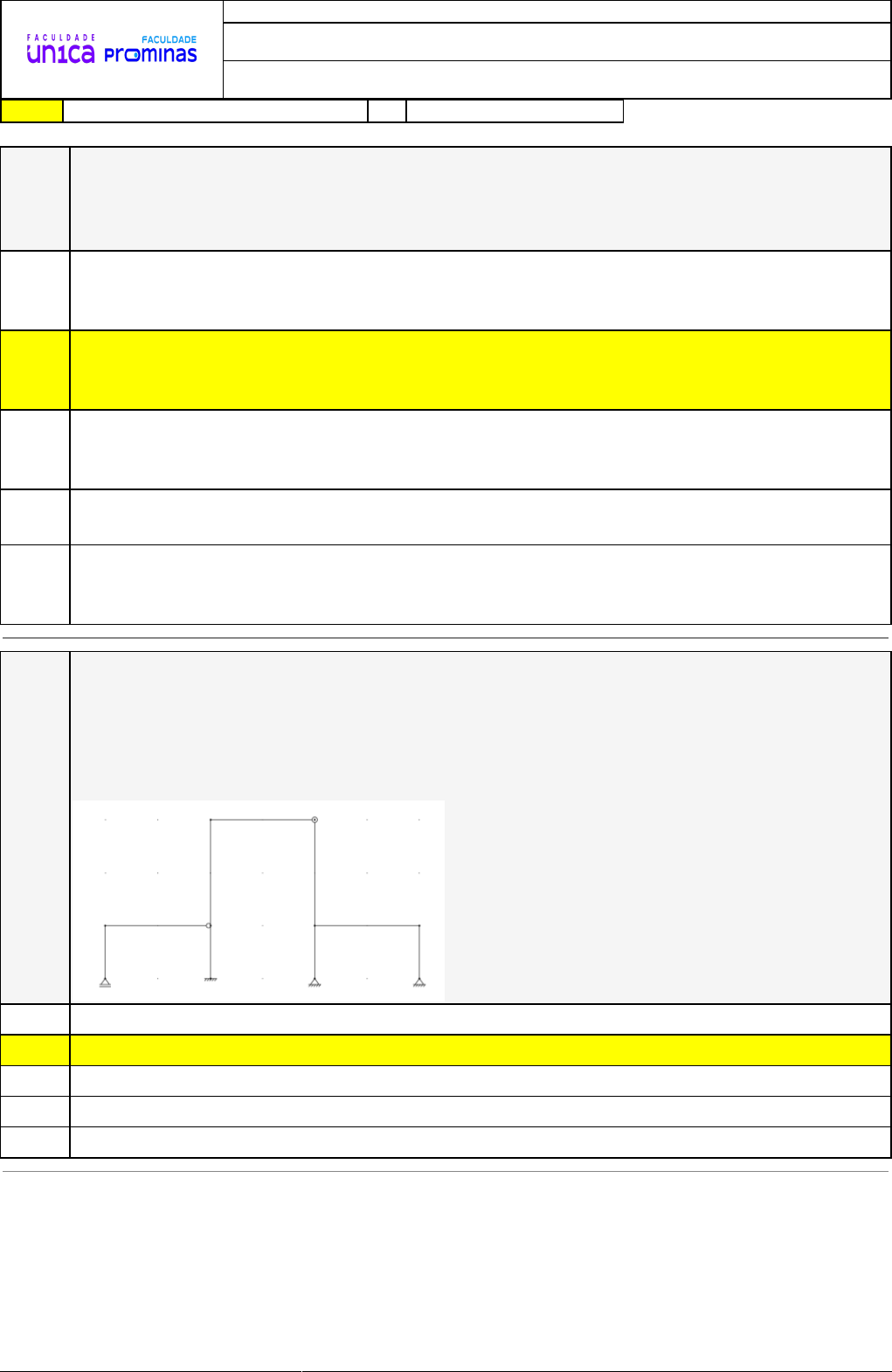 21/05/2024 11:55:27 1/4 REVISÃO DE SIMULADO Nome: KALITA FERREIRA SANTOS Disciplina: Sistemas Estruturais I Respostas corretas são marcadas em amarelo X Respostas marcardas por você. Questão 001 (Adaptado de ADORNA – 2017) O conceito de estruturas hipostáticas, isostáticas e hiperestáticas é fundamental na engenharia estrutural e está relacionado à capacidade de uma estrutura resistir a cargas e se manter estável. São estruturas hipostáticas, isostáticas e hiperestáticas, respectivamente: A) Estruturas estáveis e estaticamente determinadas; estruturas que não possuem vínculos suficientes para garantir o equilíbrio estático; e estruturas estáveis e estaticamente indeterminadas. B) Estruturas que não possuem vínculos suficientes para garantir o equilíbrio estático; estruturas estáveis e estaticamente determinadas; e estruturas estáveis estaticamente indeterminadas. C) Estruturas que não possuem vínculos suficientes para garantir o equilíbrio estático; estruturas estáveis e estaticamente indeterminadas; e estruturas estáveis e estaticamente determinadas. X D) Estruturas que não possuem vínculos suficientes para garantir o equilíbrio estático; estruturas estáveis e estaticamente determinadas; e estruturas com muitos apoios. E) Estruturas estáveis e estaticamente indeterminadas; estruturas estáveis e estaticamente determinadas; e estruturas que não possuem vínculos suficientes para garantir o equilíbrio estático. Questão 002 (Adaptada de CEBRASPE – 2018) Os termos hipostática, isostática e hiperestática descrevem a relação entre o número de reações de apoio e o número de equações de equilíbrio que devem ser satisfeitas para garantir a estabilidade da estrutura. Compreender esses conceitos é essencial para o projeto de estruturas seguras e eficientes. Visto isso, com relação à estaticidade global, a estrutura mostrada na figura precedente classifica-se como: A) hiperestática com 1 grau de redundância. B) hiperestática com 3 graus de redundância. C) isostática. D) hipostática com 1 grau de liberdade. X E) hipostática com 3 graus de liberdade. 21/05/2024 11:55:27 2/4 Questão 003 (Aeronáutica - 2021 - CIAAR - Primeiro Tenente - Engenharia Civil) As treliças são classificadas quanto à estaticidade em isostática, hipostática e hiperestática. Abaixo têm-se algumas treliças representadas. Fonte: Arquivo da Banca Elaboradora. Observando as configurações acima, estas são: A) I – Isostática; II – Hiperestática; III – Hipostática. X B) I – Hiperestática; II – Hipostática; III – Isostática. C) I – Hiperestática; II – Hipostática; III – Hiperestática. D) I – Isostática; II – Hipostática; III – Hiperestática. E) I – Hipostática; II – Hiperestática; III – Isostática. Questão 004 (Adaptada de Kassimali, 2016) A compreensão abrangente das reações de apoio é crucial para garantir a estabilidade e o equilíbrio das estruturas, bem como para determinar a segurança e a eficiência de uma variedade de projetos de engenharia, desde pontes e edifícios até máquinas industriais e componentes mecânicos. Determine as reaçoÌ�es do apoio para a estrutura mostrada na Figura. A) Ax = 30 kN; Ay = 31,5 kN; Ma = 387 kN.m X B) Ax = 30 kN; Ay = 31,5 kN; Ma = 388 kN.m C) Ax = 30 kN; Ay = 30 kN; Ma = 388 kN.m Ax = 30 kN; Ay = 30 kN; Ma = 387 kN.m D) Ax = 0 kN; Ay = 30 kN; Ma = 388 kN.m Questão 005 Segundo o método sequencial qual o primeiro passo para calcular as respostas de estruturas planas estáticas? 21/05/2024 11:55:27 3/4 A) Utilizar uma solução de equilíbrio alternativo. X B) Determinar as reações desconhecidas. C) Verificar a estaticidade da estrutura. D) Desenhar o Diagrama de Corpo Livre (DCL). E) Construir diagramas de corpo livre para partes individuais. Questão 006 (FUNIVERSA – 2012) Estruturas isostáticas são aquelas cujo número de reações é o estritamente necessário para que nenhum movimento seja permitido, ou seja, o equilíbrio estático da estrutura é estável. Além disso, as reações devem ser dispostas de maneira a restringir quaisquer possíveis movimentos da estrutura. Para ser isostática, uma estrutura deve obedecer a essas duas condições. Estruturas hiperestáticas, por sua vez, são aquelas cujo número de reações é superior ao estritamente necessário para impedir qualquer movimento, de forma que é possível retirar algumas dessas reações de maneira criteriosa, sem que o equilíbrio deixe de ser estável. Define-se grau de hiperestaticidade como o número de ligações que podem ser suprimidas de uma estrutura hiperestática para transformá-la em uma estrutura isostática. Qual é o grau de hiperestaticidade da estrutura plana apresentada? A) 4 X B) 1 C) 0 D) 3 E) 2 Questão 007 (CETRO – 2013) Com relação à estaticidade e estabilidade de uma estrutura, marque V para verdadeiro ou F para falso e, em seguida, assinale a alternativa que apresenta a sequência correta. ( ) Uma estrutura isostática é uma estrutura restringida, e o número de incógnitas é igual ao número de equações de equilíbrio. ( ) Uma estrutura hiperestática é uma estrutura restringida, e o número de incógnitas é maior que o número de equações de equilíbrio. ( ) Uma estrutura hipostática não é uma estrutura restringida ou o número de incógnitas é menor que o número de equações de equilíbrio. ( ) Uma estrutura está restringida quando possui vínculos para restringir todos os movimentos possíveis dela (translação e rotação), como um corpo rígido. Alternativas A) V/ F/ V/ F X B) V/ V/ V/ V C) F/ F/ F/ F D) F/ F/ V/ V E) V/ V/ F/ F 21/05/2024 11:55:27 4/4 Questão 008 (CEBRASPE – 2006) Segundo uma análise de estaticidade e estabilidade, uma estrutura pode ser classificada em uma das três categorias seguintes: isostática, hiperestática e hipostática. Com base na representação esquemática de diferentes tipos de estruturas, most