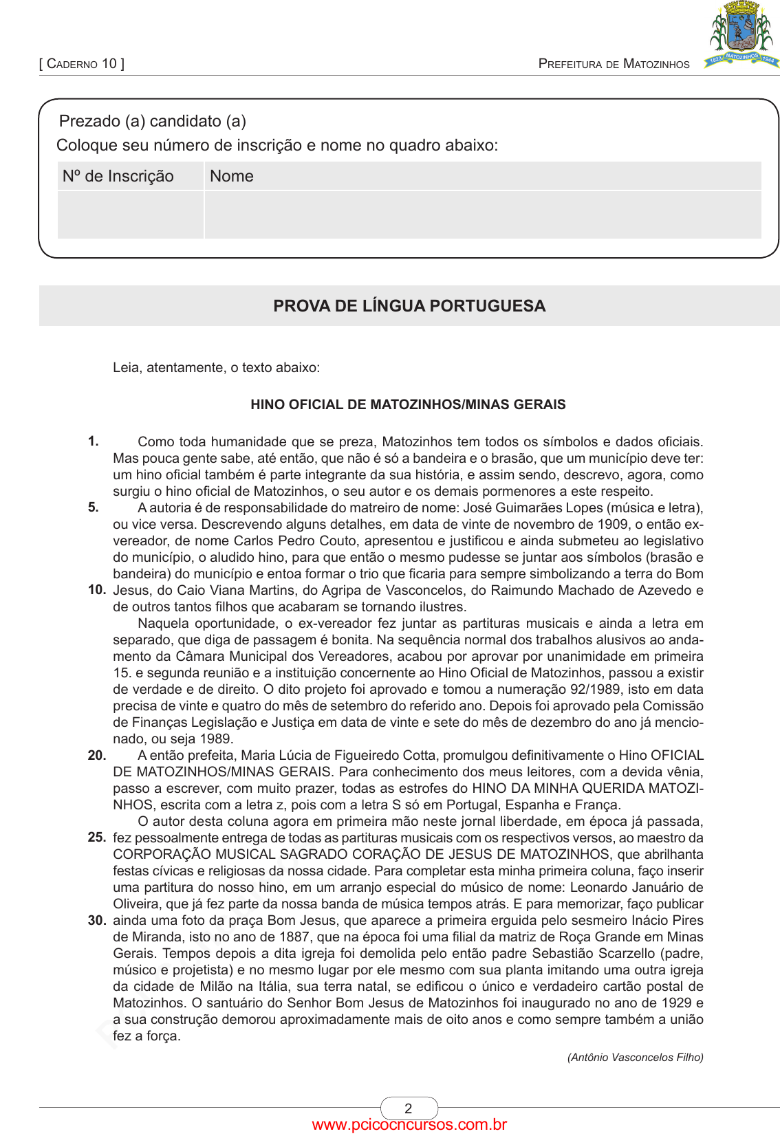 pcimarkpci MjgwNDowZDQxOmU2NDM6YjQwMDowNGY5OjY4YzY6OTkzNDo0NzIy:TW9uLCAyNyBNYXkgMjAyNCAxMTowNjoxNSAtMDMwMA== www.pciconcursos.com.br [ CADERNO 10 ] PREFEITURA DE MATOZINHOS 2 PROVA DE LÍNGUA PORTUGUESA Prezado (a) candidato (a) Coloque seu número de inscrição e nome no quadro abaixo: Nº de Inscrição Nome Leia, atentamente, o texto abaixo: HINO OFICIAL DE MATOZINHOS/MINAS GERAIS Como toda humanidade que se preza, Matozinhos tem todos os símbolos e dados ofi ciais. Mas pouca gente sabe, até então, que não é só a bandeira e o brasão, que um município deve ter: um hino ofi cial também é parte integrante da sua história, e assim sendo, descrevo, agora, como surgiu o hino ofi cial de Matozinhos, o seu autor e os demais pormenores a este respeito. A autoria é de responsabilidade do matreiro de nome: José Guimarães Lopes (música e letra), ou vice versa. Descrevendo alguns detalhes, em data de vinte de novembro de 1909, o então ex- vereador, de nome Carlos Pedro Couto, apresentou e justifi cou e ainda submeteu ao legislativo do município, o aludido hino, para que então o mesmo pudesse se juntar aos símbolos (brasão e bandeira) do município e entoa formar o trio que fi caria para sempre simbolizando a terra do Bom Jesus, do Caio Viana Martins, do Agripa de Vasconcelos, do Raimundo Machado de Azevedo e de outros tantos fi lhos que acabaram se tornando ilustres. Naquela oportunidade, o ex-vereador fez juntar as partituras musicais e ainda a letra em separado, que diga de passagem é bonita. Na sequência normal dos trabalhos alusivos ao anda- mento da Câmara Municipal dos Vereadores, acabou por aprovar por unanimidade em primeira 15. e segunda reunião e a instituição concernente ao Hino Ofi cial de Matozinhos, passou a existir de verdade e de direito. O dito projeto foi aprovado e tomou a numeração 92/1989, isto em data precisa de vinte e quatro do mês de setembro do referido ano. Depois foi aprovado pela Comissão de Finanças Legislação e Justiça em data de vinte e sete do mês de dezembro do ano já mencio- nado, ou seja 1989. A então prefeita, Maria Lúcia de Figueiredo Cotta, promulgou defi nitivamente o Hino OFICIAL DE MATOZINHOS/MINAS GERAIS. Para conhecimento dos meus leitores, com a devida vênia, passo a escrever, com muito prazer, todas as estrofes do HINO DA MINHA QUERIDA MATOZI- NHOS, escrita com a letra z, pois com a letra S só em Portugal, Espanha e França. O autor desta coluna agora em primeira mão neste jornal liberdade, em época já passada, fez pessoalmente entrega de todas as partituras musicais com os respectivos versos, ao maestro da CORPORAÇÃO MUSICAL SAGRADO CORAÇÃO DE JESUS DE MATOZINHOS, que abrilhanta festas cívicas e religiosas da nossa cidade. Para completar esta minha primeira coluna, faço inserir uma partitura do nosso hino, em um arranjo especial do músico de nome: Leonardo Januário de Oliveira, que já fez parte da nossa banda de música tempos atrás. E para memorizar, faço publicar ainda uma foto da praça Bom Jesus, que aparece a primeira erguida pelo sesmeiro Inácio Pires de Miranda, isto no ano de 1887, que na época foi uma fi lial da matriz de Roça Grande em Minas Gerais. Tempos depois a dita igreja foi demolida pelo então padre Sebastião Scarzello (padre, músico e projetista) e no mesmo lugar por ele mesmo com sua planta imitando uma outra igreja da cidade de Milão na Itália, sua terra natal, se edifi cou o único e verdadeiro cartão postal de Matozinhos. O santuário do Senhor Bom Jesus de Matozinhos foi inaugurado no ano de 1929 e a sua construção demorou aproximadamente mais de oito anos e como sempre também a união fez a força. (Antônio Vasconcelos Filho) 30. 25. 20. 10. 1. 5. www.pcicocncursos.com.br pcimarkpci MjgwNDowZDQxOmU2NDM6YjQwMDowNGY5OjY4YzY6OTkzNDo0NzIy:TW9uLCAyNyBNYXkgMjAyNCAxMTowNjoxNSAtMDMwMA== www.pciconcursos.com.br 3 PREFEITURA DE MATOZINHOS[ CADERNO 10 ] HINO OFICIAL DE MATOZINHOS/MG Oh como é bom viver em Matozinhos cidade de nosso amanhã que virá Matozinhos, sempre hospitaleira igual a ela não há. Em cada casa, rua, praça e avenida Matozinhos, sempre é tão querida é a própria natureza em tudo Não poupou beleza enfi m para fazê-la assim Matozinhos, Matozinhos cidade que aprendi amar Matozinhos, Matozinhos como é bom aqui morar Matozinhos, Matozinhos cidade que aprendi amar Matozinhos, Matozinhos como é bom aqui morar Ouvir a banda tocar o nosso povo cantar uma criança que diz que uma cidade que tem como padroeiro Bom Jesus só tem que ser feliz. Queremos Matozinhos, sempre bela quanto mais falamos dela mais gostamos dela. Queremos Matozinhos, sempre bela quanto mais falamos dela mais gostamos dela. QUESTÃO 01 O propósito comunicativo do texto “Hino Ofi cial de Matozi- nhos” é sobretudo o de a) apresentar o contexto no qual o Hino ofi cial de Mato- zinhos fora produzido. b) informar sobre as melhores opções de escolha sobre a produção do hino de Matozinhos. c) explicar sobre os benefícios da letra do hino para a cidade de Matozinhos. d) esclarecer como as notas musicais do hino foram pro- duzidas. QUESTÃO 02 A ideia expressa pela palavra em destaque está correta- mente indicada entre parênteses, EXCETO: a) “A autoria é de responsabilidade do matreiro (l.5) de nome: José Guimarães Lopes...” (sábio) b) “(...) o aludido (l. 8) hino para que o mesmo pudesse se juntar aos símbolos...” (aplaudido) c) “(...) e de outros tantos fi lhos que acabaram se tornan- do ilustres. (l.11)” (nobres) d) “Na sequência normal dos trabalhos alusivos (l.13) ao andamento da Câmara Municipal dos Vereadores...” (referentes) QUESTÃO 03 Baseando-se no conceito de que “oração é uma constru- ção gramatical que se organiza ao redor de um verbo”, responda quantas orações há no fragmento do texto: “Como toda humanidade que se preza, Matozinhos tem todos os símbolos e dados ofi ciais. Mas pouca gente sabe até então...” a) uma . b) duas