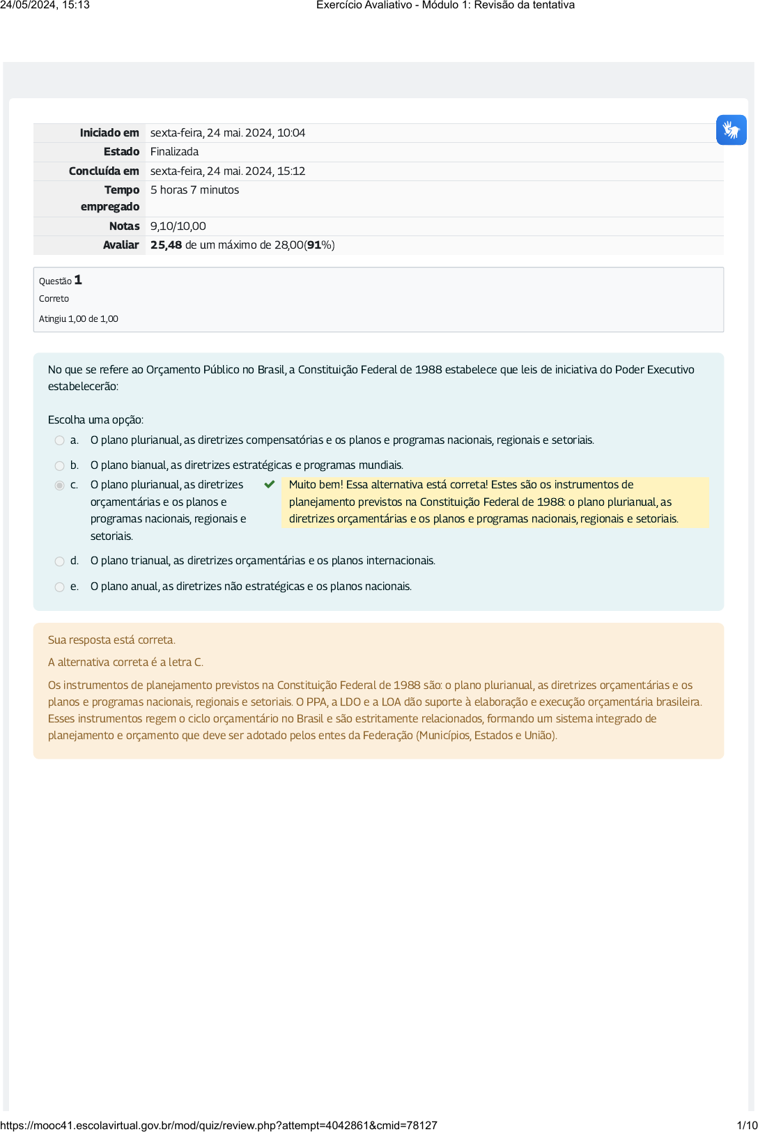 Iniciado em sexta-feira, 24 mai. 2024, 10:04 Estado Finalizada Concluída em sexta-feira, 24 mai. 2024, 15:12 Tempo empregado 5 horas 7 minutos Notas 9,10/10,00 Avaliar 25,48 de um máximo de 28,00(91%) Questão 1 Correto Atingiu 1,00 de 1,00 No que se refere ao Orçamento Público no Brasil, a Constituição Federal de 1988 estabelece que leis de iniciativa do Poder Executivo estabelecerão: Escolha uma opção: a. O plano plurianual, as diretrizes compensatórias e os planos e programas nacionais, regionais e setoriais. b. O plano bianual, as diretrizes estratégicas e programas mundiais. c. O plano plurianual, as diretrizes orçamentárias e os planos e programas nacionais, regionais e setoriais. Muito bem! Essa alternativa está correta! Estes são os instrumentos de planejamento previstos na Constituição Federal de 1988: o plano plurianual, as diretrizes orçamentárias e os planos e programas nacionais, regionais e setoriais. d. O plano trianual, as diretrizes orçamentárias e os planos internacionais. e. O plano anual, as diretrizes não estratégicas e os planos nacionais. Sua resposta está correta. A alternativa correta é a letra C. Os instrumentos de planejamento previstos na Constituição Federal de 1988 são: o plano plurianual, as diretrizes orçamentárias e os planos e programas nacionais, regionais e setoriais. O PPA, a LDO e a LOA dão suporte à elaboração e execução orçamentária brasileira. Esses instrumentos regem o ciclo orçamentário no Brasil e são estritamente relacionados, formando um sistema integrado de planejamento e orçamento que deve ser adotado pelos entes da Federação (Municípios, Estados e União). 24/05/2024, 15:13 Exercício Avaliativo - Módulo 1: Revisão da tentativa https://mooc41.escolavirtual.gov.br/mod/quiz/review.php?attempt=4042861&cmid=78127 1/10 Questão 2 Correto Atingiu 1,00 de 1,00 A respeito do ciclo orçamentário e do processo de elaboração do orçamento, associe os itens a seguir como verdadeiro (V) ou falso (F). a) No processo de elaboração do orçamento anual da União, em determinado momento, a proposta é consolidada em nível setorial nos órgãos dos Poderes Judiciário, Legislativo e Executivo. Posteriormente, é encaminhada ao órgão central de planejamento e orçamento, para ser ajustada, consolidada e submetida ao presidente da República, que a encaminha, sob a forma de projeto de lei, ao Congresso Nacional. b) Cada ente da Federação deve aprovar, anualmente, uma lei orçamentária. c) Compete integralmente à Secretaria de Orçamento Federal (SOF) a elaboração dos orçamentos �scal, da seguridade social e dos investimentos das empresas estatais não dependentes. d) O ciclo orçamentário é o espaço de tempo compreendido entre o primeiro dia de janeiro e o dia 31 de dezembro de cada ano, no qual se promovem a execução orçamentária e os demais fatos relacionados com as variações qualitativas e quantitativas que afetam os elementos patrimoniais dos órgãos e entidades do setor público. Verdadeiro Verdadeiro Falso Falso Sua resposta está correta. O Ciclo Orçamentário compreende um conjunto de tarefas cujo grande objetivo é produzir, aprovar e executar a Lei Orçamentária Anual, a nossa peça orçamentária. Por sua vez, A fase da elaboração do orçamento para um exercício tem início assim que o orçamento exercício anterior é enviado (até 31 de agosto). O item A é verdadeiro, pois a proposta orçamentária é consolidada em nível setorial nos órgãos dos Poderes Judiciário, Legislativo e Executivo e, posteriormente, essas propostas são consolidadas na Secretaria de Orçamento Federal, do Ministério do Planejamento, Orçamento e Gestão, sendo encaminhado apenas um único projeto de lei ao Congresso Nacional. O item B é verdadeiro, pois cada ente da Federação (União, Estados, Distrito Federal e Municípios) possui seus instrumentos de planejamento (PPA, LDO e LOA). O item C é falso, pois compete ao Departamento de Coordenação e Governança das Empresas Estatais (DEST) a elaboração do Orçamento de Investimentos e do Programa de Dispêndios Globais (PDG) das empresas estatais independentes. O item D é falso, pois o ciclo orçamentário corresponde ao período de tempo em que se processam as atividades típicas do orçamento público, desde sua concepção até a apreciação �nal (prestação de contas e avaliação de desvios em relação ao planejado). O espaço de tempo a que se refere essa questão compreende um exercício �nanceiro, período de execução do orçamento. 24/05/2024, 15:13 Exercício Avaliativo - Módulo 1: Revisão da tentativa https://mooc41.escolavirtual.gov.br/mod/quiz/review.php?attempt=4042861&cmid=78127 2/10 Questão 3 Correto Atingiu 1,00 de 1,00 Sobre os atuais instrumentos de planejamento (Plano Plurianual - PPA, Lei de Diretrizes Orçamentárias - LDO e Lei Orçamentária Anual - LOA), marque a alternativa correta. Escolha uma opção: a. O plano decenal, o plano plurianual, as diretrizes orçamentárias e o orçamento anual constituem etapas de planejamento orçamentário. b. De acordo com o calendário vigente, o presidente da República, no primeiro ano de seu mandato, governa o país com o plano plurianual, a lei de diretrizes orçamentárias e a lei orçamentária anual aprovados pelo seu antecessor, embora não esteja impedido de propor alterações. Muito bem! Essa alternativa está correta! Quando o presidente da República assume seu primeiro ano de mandato presidencial ele irá cumprir um ano do PPA aprovado pelo seu antecessor. Também, a LDO e a LOA que ele irá cumprir no seu primeiro ano de mandato foram aprovadas no ano anterior, para viger no ano subsequente. c. A lei orçamentária anual compreende três orçamentos: o �scal, o da seguridade social e o de investimento das empresas. Os orçamentos �scal e da seguridade social englobam os poderes, órgãos e entidades da administração direta, autarquias, fund