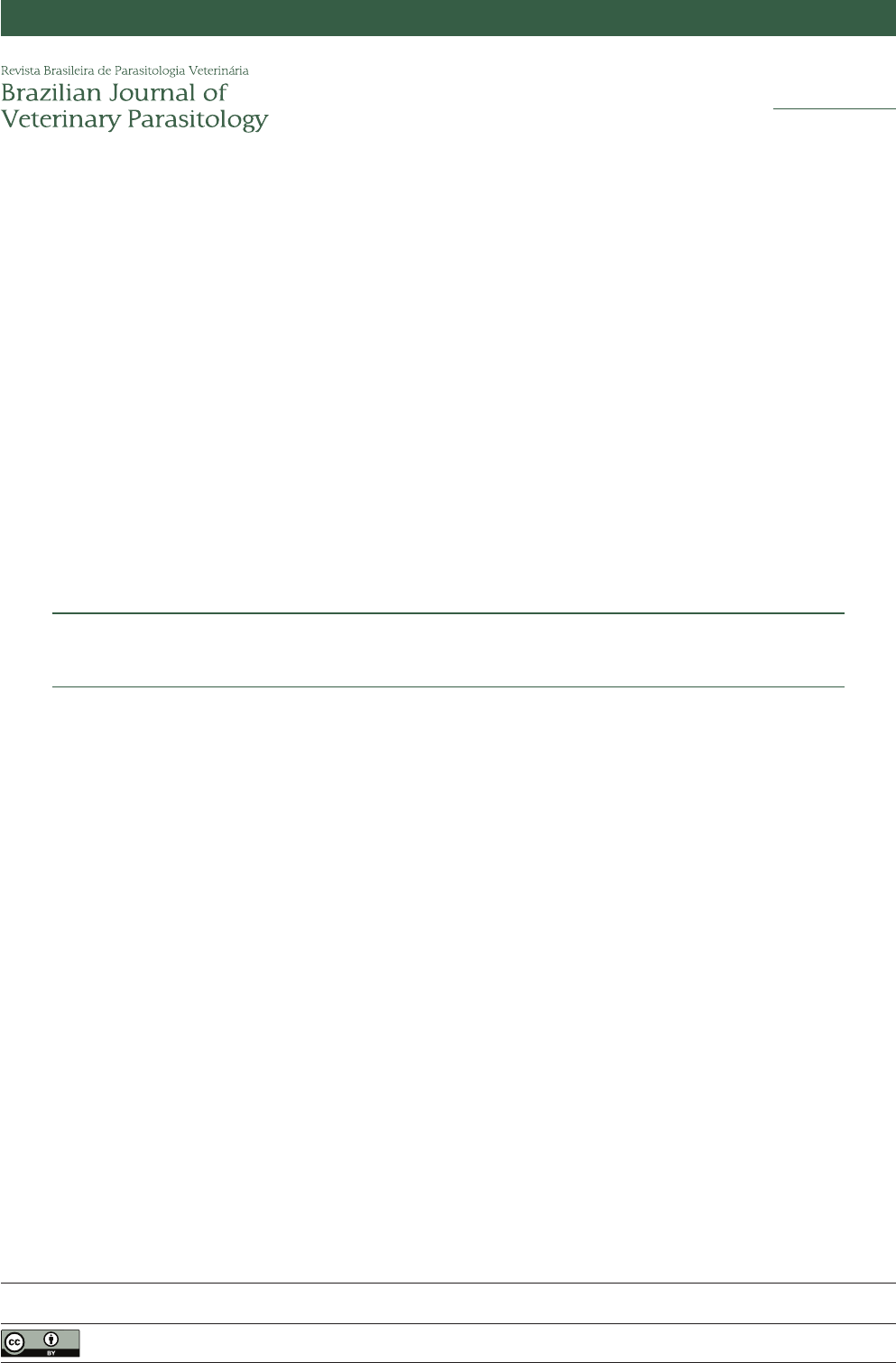 1/16 ISSN 1984-2961 (Electronic) www.cbpv.org.br/rbpv Original Article Braz J Vet Parasitol 2023; 32(1): e013522 | https://doi.org/10.1590/S1984-29612023011 This is an Open Access article distributed under the terms of the Creative Commons Attribution License, which permits unrestricted use, distribution, and reproduction in any medium, provided the original work is properly cited. Activity of essential oils from leaves, flower buds and stems of Tetradenia riparia on Rhipicephalus (Boophilus) microplus larvae Atividade dos óleos essenciais das folhas, botões florais e caules de Tetradenia riparia sobre as larvas de Rhipicephalus (Boophilus) microplus Wilsandrei Cella1,2* ; Isabelle Luiz Rahal3 ; Gabriela Catuzo Canônico Silva3 ; Ezilda Jacomassi4 ; Ranulfo Piau Junior1 ; José Eduardo Gonçalves5 ; Daniela Dib Gonçalves1,4 ; Zilda Cristiani Gazim1,3 1Laboratório de Medicina Veterinária Preventiva e Saúde Pública, Programa de Pós-graduação em Ciência Animal com Ênfase em Produtos Bioativos, Universidade Paranaense – Unipar, Umuarama, PR, Brasil 2Centro de Estudos Superiores de Tefé, Universidade do Estado do Amazonas – UEA, Tefé, AM, Brasil 3Laboratório de Química de Produtos Naturais, Programa de Pós-graduação em Biotecnologia Aplicada à Agricultura, Universidade Paranaense – Unipar, Umuarama, PR, Brasil 4Laboratório de Botânica e Horto de Plantas Medicinais, Programa de Pós-graduação em Plantas Medicinais e Fitoterápicos na Atenção Básica, Universidade Paranaense – Unipar, Umuarama, PR, Brasil 5Laboratório Interdisciplinar de Análises Biológicas e Químicas, Programa de Pós-graduação em Tecnologias Limpas, Centro Universitário Cesumar – UniCesumar, Maringá, PR, Brasil How to cite: Cella W, Rahal IL, Silva GCC, Jacomassi E, Piau Junior R, Gonçalves JE, et al. Activity of essential oils from leaves, flower buds and stems of Tetradenia riparia on Rhipicephalus (Boophilus) microplus larvae. Braz J Vet Parasitol 2023; 32(1): e013522. https://doi.org/10.1590/S1984-29612023011 Received October 7, 2022. Accepted January 25, 2023. *Corresponding author: Wilsandrei Cella. E-mail: wcella@uea.edu.br Abstract Around the world, the main problems of livestock are caused by ectoparasites, however, commercial acaracide are toxic to the environment and detrimental to One Health. Therefore, research has increasingly focused on development of natural products as alternatives for tick control. The purpose of this study was to evaluate the larvicidal effect on Rhipicephalus (Boophilus) microplus, through use of essential oils (EOs) extracted from the leaves, flower buds and stems of Tetradenia riparia. The chemical composition of these EOs was determined through gas chromatography coupled to mass spectrometry (GC-MS). They were tested on larvae at concentrations of 100.000 to 40 µg/mL, using the larval packet test and under semi-natural conditions. The main class of compounds in the chemical composition was sesquiterpenes (both oxygenates and hydrocarbons), whereas the predominant compounds in the leaves, flower buds and stems were 14-hydroxy-9-epi-caryophyllene, T-cadinol and 6-7-dehydroroyleanone, respectively. The leaves proved to be the most effective, with highest larvicidal activity (LC99.9 = 83.53 µg/mL). When tested under semi-natural conditions, the oils obtained efficiency above 98% in all compound tests. The results indicated that these EOs were effective against R. (B.) microplus larvae in vitro and ex-situ, proving that this plant has bioactive molecules with significant larvicidal activity. Keywords: Larvicide, essential oils, ticks, Tetradenia riparia, Rhipicephalus microplus. Resumo Os principais problemas para a pecuária estão relacionados às ectoparasitoses, e ao fato dos carrapaticidas apresentarem elevada toxicidade ao meio ambiente e à saúde única. Surgem, então, demandas na busca por inovações e desenvolvimento de produtos naturais, como alternativas para o controle dos carrapatos. O objetivo deste trabalho foi avaliar o potencial da atividade larvicida sobre Rhipicephalus (Boophilus) microplus a partir dos óleos essenciais de Tetradenia riparia (TrOEs) extraídos das folhas, botões florais e caules. A composição química foi determinada por cromatografia gasosa acoplada à espectrometria de massa (GC/MS). Os TrOEs foram testados sobre larvas nas concentrações de 100.000 a 40 µg/mL pelo teste de pacote de larvas e em condições seminaturais. Na composição química, a classe majoritária foi os sesquiterpenos (oxigenados e hidrocarbonetos); https://creativecommons.org/licenses/by/4.0/ https://orcid.org/0000-0002-8107-3062 https://orcid.org/0000-0002-8867-5138 https://orcid.org/0000-0002-4123-9507 https://orcid.org/0000-0003-0967-8427 https://orcid.org/0000-0003-4765-6544 https://orcid.org/0000-0002-9213-0421 https://orcid.org/0000-0001-8322-8905 https://orcid.org/0000-0003-0392-5976 Braz J Vet Parasitol 2023; 32(1): e013522 2/16 Larvicidal effect of Tetradenia riparia já os compostos em destaques foram 14-hidroxy-9-epi-caryophyllene, T-cadinol e 6-7-dehidroroyleanone para folhas, botões florais e caules, respectivamente. As folhas demonstraram ser mais eficientes e com maior poder larvicida (CL99.9 = 83.53 µg/mL). Quando testado em condições seminaturais os óleos obtiveram eficiência acima de 98% em todos os compostos testados. Os resultados indicaram que os TrOEs, foram eficazes sobre as larvas de R. (B.) microplus in vitro e ex-situ, evidenciando que esta planta possui moléculas bioativas com ação larvicidas significativas. Palavras-chave: Larvicida, óleo essencial, carrapatos, Tetradenia riparia, Rhipicephalus microplus. Introduction Brazil has the largest commercial herd of cattle in the world, with approximately 214.8 million head. It is currently the fourth largest producer of milk, producing about 25.4 billion liters/year. The livestock sector accounts for 8.5% of Brazil’s gross domestic product (GD