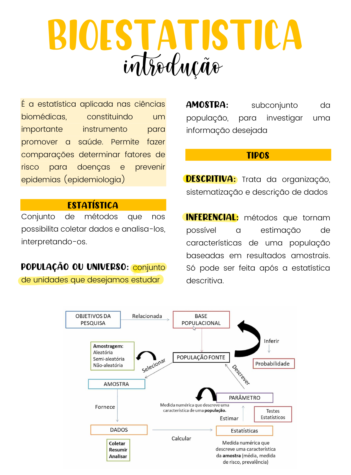 Bïøëståtïstïçå É a estatística aplicada nas ciências biomédicas, constituindo um importante instrumento para promover a saúde. Permite fazer comparações determinar fatores de risco para doenças e prevenir epidemias (epidemiologia) ESTATÍSTICA Conjunto de métodos que nos possibilita coletar dados e analisa-los, interpretando-os. POPULAÇÃO OU UNIVERSO: conjunto de unidades que desejamos estudar AMOSTRA: subconjunto da população, para investigar uma informação desejada TIPOS DESCRITIVA: Trata da organização, sistematização e descrição de dados INFERENCIAL: métodos que tornam possível a estimação de características de uma população baseadas em resultados amostrais. Só pode ser feita após a estatística descritiva. OBTEÇÃO DE AMOSTRAS Para selecionar as unidades que comporão a amostra, utiliza-se algumas técnicas: AMOSTRA ALEATORIA, CASUAL OU PROBABILISTICA • Mesmas probabilidades • Aleatória • Todos os indivíduos tem a mesma probabilidade de pertencer a amostra • Compostas por n unidades retiradas ao acaso da população. AMOSTRA SEMIPROBABILISTICA • Procedimentos parcialmente aleatório • Semialeatória AMOTRA NÃO PROBABILISTICA OU DE COVENIENCIA • Probabilidades diferentes • Não aleatória • Constituída por n unidades reunidas em uma amostra simplesmente porque o pesquisador tem fácil acesso a essas unidades AMOSTRAS PROBABILISTICAS SIMPLES Forma-se uma amostra aleatória homogênea 1. A população é constituída por unidades homogêneas para a variável que se quer estudar. Desconsidera-se as características subjetivas de cada um. 2. Cada unidade deve ser identificada por nome ou número. 3. É feito um sorteio de uma população conhecida ESTRATIFICADA Forma-se uma amostra aleatória estratificada 1. A população é constituída por unidades heterogêneas para a variável que se quer estudar 2. Os indivíduos devem ser identificados e, depois, as unidades similares devem ser reunidas em subgrupos denominados estratos 3. É feito um sorteio dentro de cada estrato. AMOSTRAS SEMIPROBABILISTICAS SISTEMÁTICA Constituída por n unidades retiradas aleatoriamente da população segundo um sistema preestabelecido CONGLOMERADOS Constituída por n unidades de alguns conglomerados, um conjunto de unidades que estão grupadas por qualquer que seja a razão, geralmente por terem características comuns. Exemplo: um asilo é um conglomerado de idosos QUOTAS Constituída por n unidades retiradas da população segundo quotas estabelecidas de acordo com a distribuição desses elementos na população. Usado mais no âmbito do marketing. Exemplo: entrevistar 50 homens, com mais de 18 anos, que recebam mais de 3 salários mínimos – eu vou analisar as pessoas na rua, julgá-las pela aparência de acordo com as quotas pre-estabelecidas, fazer a entrevista, ver se a pessoa se enquadra nas características das quotas, se não se encaixar eu vou para outra pessoa. AMOSTRAS NÃO PROBABILÍSTICAS CONVENIÊNCIA Não é aleatória O pesquisador seleciona elementos da amostra que julga representativo da população de interesse, ou apropriados por algum motivo, intencionalmente. Exemplo: fazer uma pesquisa eleitoral em um local onde há maior quantidade de pessoas que votam em certo candidato INFERÊNCIA x PROBABILIDADE INFERÊNCIA: coletar uma informação nova de outras já conhecidas PROBABILIDADE: por meio desta se generaliza os resultados de uma amostra para a população em estudo ERRO SISTEMÁTICO VIÉS: qualquer processo, em qualquer estágio da pesquisa, que tende a produzir resultados e conclusões, que diferem da verdade. Seu efeito é o de distorcer a estimativa de um resultado. Alguns são: • AFERIÇÃO: quando um dado de interesse do estudo não foram coletados corretamente • SELEÇÃO: quando a amostra não é representativa da população – problema na forma de seleção da amostra – usa-se técnica errada de amostragem • CONFUSÃO: ocorre quando não há comparabilidade entre os grupos estudados, o que gera uma inferência errônea ou precipitada.