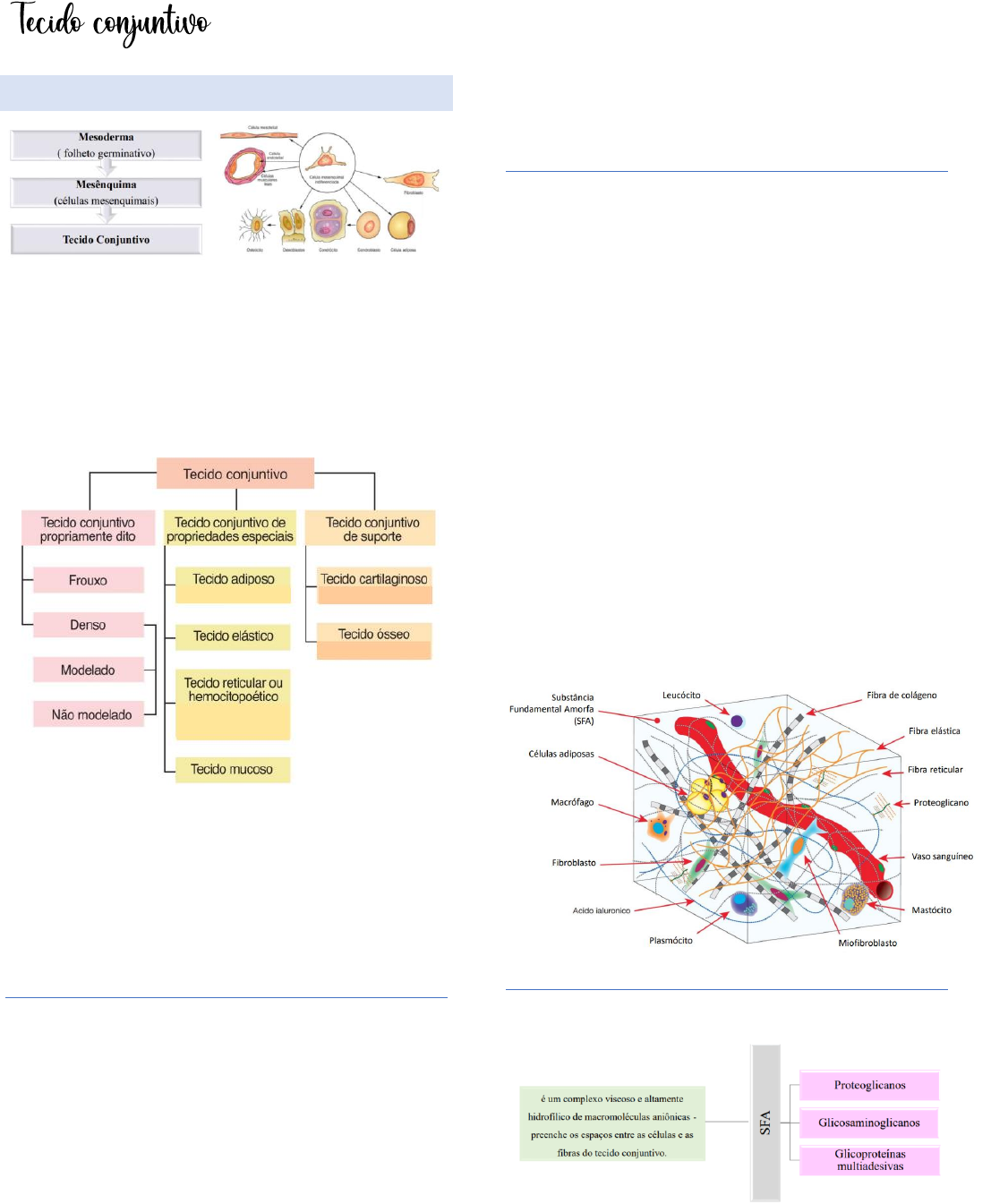 ORIGEM • O tecido conjuntivo tem origem a partir da mesoderma. Então, as células que sofrem diferenciação são as células mesenquimais, que a partir da diferenciação dessas células temos o tecido conjuntivo propriamente dito. *tecido hematopoiético: é o tecido sanguíneo -> especializado • A partir do mesoderma se geram células mesenquimais portanto, que sofrem diferenciação para formar o tecido conjuntivo específico. IMPORTANCIA • Ampla importância em nosso organismo: são responsáveis pelo estabelecimento e pela manutenção da forma do corpo (tecido adiposo ajuda no modelamento do nosso corpo e consequentemente nas características em relação a modelagem feminina e masculina) • Também é importante para a parte estrutural, que se relaciona com o tecido ósseo, esqueleto. Ou seja, dar a estrutura para o corpo. • Tecido cartilaginoso: quando pensamos em movimentação de articulações, ou seja, como articulamos um membro com o outro está tudo relacionado com o tecido conjuntivo. • Tecido hematopoiético: Defesa, sistema imunológico, células brancas; • Quando temos a união de osso (tecido conjuntivo) com tecido muscular conseguimos ter a movimentação. A partir dai conseguimos entender a importância desse tecido. COMPOSIÇÃO • Composto por matriz extracelular (formada por substância fundamental amorfa e fibras) e células • Nas células temos que ver qual tipo é pra determinar qual tecido conjuntivo estamos falando, depende muito da proporção e qual célula dominante naquele tecido, determinando qual tecido temos. • Analogia: piscina é substância amorfa (parte fluida), macarrão são fibras (colágeno, elástica e reticular e nós somos as células (fibroblastos, plasmócitos, mastócitos, células adiposas). • As fibras dependem do tecido em que são encontradas, muitas vezes podem estar em maior ou menor proporção. • É necessário ter células inseridas nesse tecido, as quais estão espalhadas na matriz extracelular (diferente do tecido epitelial que estão justapostas). O espaço entre uma célula e outra é encontrado substância amorfa, para que as células dispersas não fiquem livres. SUBSTANCIA FUNDAMENTAL AMORF A • Complexo viscoso altamente hidrofílico com moléculas aniônicas preenchendo o espaço entre os tecidos. • Formada por proteoglicanos, glicosaminoglicanos e glicoproteínas adesivas. • Os GLICOSAMINOGLICANOS: são responsáveis pela retenção de agua/líquido, porque são extremamente negativas (carga elétrica) ajudando na retenção de liquido dando característica viscosa. • PROTEOGLICANO: necessário ter uma proteína central e ligada a ela precisa de glicosaminoglicanos. Pode ser um de sulfato de paradama, de heparana, de condroitina, tudo depende do que está acoplado a ele. Existem vários tipos, sendo que todos eles estão conectados ao acido hialurônico (acido que sempre vai estar livre no tecido conjuntivo para que os proteoglicanos consigam se conectar a ele) • GLICOPROTEÍNAS ADESIVAS: importante para conectar as células com o tecido conjuntivo, aderindo tecido epitelial e conjuntivo para que ao ter ao atrito esses dois não se separem. Existem as fibronectinas, as lamininas, osteopontina. Dao maior resistência a atritos, para que não se separem. o *membrana basal: lâmina lucida, densa e reticular e fibras. As junções basais juntam células e matriz. o *basicamente está la para fazer as conexões. Ao ter uma matriz é necessário ter uma glicoproteína. FIBRAS Existem 3 tipos de fibras: • COLÁGENAS: sintetizada a partir do colágeno intracelularmente. A partir de RNA mensageiro ocorre o processo o transcrição no núcleo e a tradução ocorre no citoplasma, onde se lê a fita para fazer colágeno. No reticulo endoplasmático rugoso ocorre as quebras enzimáticas, deixando de ser um pre colágeno e saindo como pró-colageno. Algumas ações enzimáticas precisam de cofator a vitamina C (quem tem déficit de vitamina C tem deficiência de produção de colágeno, impactando em processo de cicatrização do paciente). Dependendo do tecido existe um responsável pela produção de colágeno: ou fibroblasto, ou osteoblasto, condroblasto e odontoblasto. Existem mais de 20 tipos de proteínas de colágeno. A que encontramos em maior concentração no tecido conjuntivo é o colágeno tipo 1. • RETICULARES: sintetizada a partir do colágeno tipo 3, são extremamente finas. Formam uma rede tridimensional para sustentação das nossas células. São encontradas principalmente (em maior quantidade) em órgãos hematopoiéticos como linfonodos e baço. o *em impregnação de prata conseguimos observar bem essas fibras em laminas. • Elásticas: sintetizada a partir da elastina. Formada por 3 moleculas -> fibulina 1, fibrilinas 1 e 2 e tropoelastina. As células responsáveis são fibroblastos, osteoblastos a depender de qual tecido conjuntivo esteja localizada. Responsável pela manutenção. A partir do momento em que se tensiona o tecido, se consegue voltar ao tamanho de origem • As fibras elásticas tem coloração especifica também e não se consegue ver tão evidentemente a espessura entre as fibras. • É importante uma substancia fluida para ter troca entre as moléculas, ou seja, para que tenha um fácil acesso ao tecido epitelial por exemplo. Tanto para circulação de nutrientes como moduladores químicos. Ao pensar em matriz extracelular não podemos pensar só como suporte de tecido epitelial, mas também importante para mediar sinalização, ou seja, fatores de crescimento e citocinas que estimulam tanto a diferenciação celular e a proliferação celular, que possuem grande importância em processo fisiológico assim como patológico. São mediadores químicos que influenciam diretamente de forma positiva ou negativo de acordo com o estímulo que se está recebendo. CÉLULAS • Temos células residentes, que é aquelas que encontramos independente do que está aco