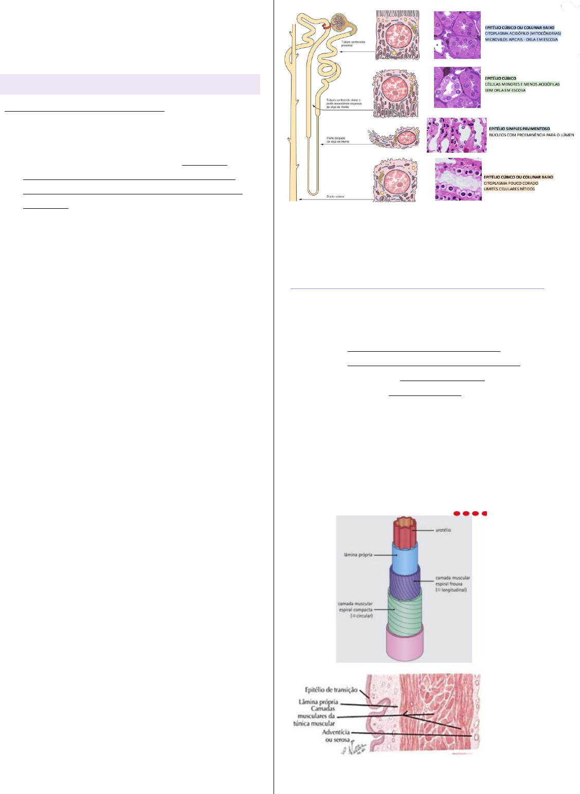 Histologia Vias Urinarias Inferiores VISÃO GERAL URETER, BEXIGA URINÁRIA E URETRA • Todas as vias excretoras para a urina, com exceção da uretra, apresentam a mesma organização geral: são revestidas por uma mucosa contendo epitélio de transição (urotélio) e apresentam uma camada de músculo liso e uma adventícia (ou serosa) de tecido conjuntivo • O epitélio de transição é um epitélio estratificado especializado com grandes células em formato de cúpula (em guarda-chuva), que fazem protuberância no lúmen • As células em formato de cúpula apresentam uma membrana apical modificada contendo placas e vesículas fusiformes, que acomodam o excesso invaginado da membrana plasmática, necessário para a extensão da superfície apical quando o órgão é distendido • O ureter conduz a urina da pelve renal até a bexiga. E revestido por epitélio de transição, músculo liso subjacente disposto em três camadas distintas e adventícia de tecido conjuntivo • A bexiga também é revestida por epitélio de transição e contém muitas pregas de mucosa, exceto na região do trígono da bexiga. Sua parede muscular é espessa e está bem desenvolvida e forma o músculo detrusor • A uretra conduz a urina da bexiga até o óstio externo da uretra • A uretra feminina é curta e revestida por epitélio de transição (metade superior), epitélio pseudoestratificado colunar (metade inferior) e epitélio estratificado pavimentoso (anterior à sua porção terminal) • A uretra masculina é muito mais longa que a feminina e é dividida em três regiões: a parte prostática da uretra (revestida por epitélio de transição), uma parte membranácea curta da uretra, que perfura o esfíncter externo da uretra (revestida por epitélio estratificado ou pseudoestratificado colunar) e a parte esponjosa longa da uretra (revestida por epitélio pseudoestratificado colunar). • Até os túbulos tinha um epitélio simples cúbico e então começa a mudar. Ocorre depois uma mudança gradual, sendo que após os cálices vão mudando a resistência e logo depois começam as camadas de células VIAS URINARIAS • Cálices menores e maiores, pélvis, ureter e bexiga armazenam e transportam a urina, sem modificá-la o Possuem a mesma estrutura básica, tornando-se gradualmente mais espesso • Mucosa formada por epitélio de transição • Lâmina própria de tecido conjuntivo • Camadas de músculo liso pouco definidas • Adventícia • A partir inferior do ureter tem 3 camadas: para contração o Longitudinal o Circular o Longitudinal EPITELIO DE TRANSIÇÃO- UROTÉLIO • Epitélio (pseudo)estratificado -> é um epitélio único, possui um potencial onde as camadas de células conseguem esticar, não é fixo. Quando estica as células ficam alinhadas. • Células com capacidade de acomodação à distensão • Células superficiais cúbicas em “formato de cúpula” com parte arredonda- impermeável aos sais e água • Tem esse epitélio nos cálices, no ureter e na bexiga e a quantidade de dobras vai aumentando • O EPITÉLIO DE TRANSIÇÃO É COMPOSTO DE PELO MENOS TRÊS CAMADAS CELULARES: • Quanto mais segura a urina mais camadas vão ficando • Camada superficial: onde fica a urina • Camada basal: capacidade proliferativa que vai repondo as células conforme necessário. • Na membrana citoplasmática de cada célula tem placas -> existem regiões que tem placa e outras que não, sendo que elas vão dobrando sobre si. São formadas de uroplaquinas para garantir maior resistência, é um rearranjo proteico rígido, mantendo impermeável. • Na bexiga tem até 7 camadas que mudam conforme o enchimento. URETERES • Tubos fibromusculares ocos • 4-5 mm diâmetro • 14 cm comprimento • Contrações peristálticas tecido muscular liso • Camada epitelial de transição + lamina própria + músculo + tecido conjuntivo formando adventícia (alguns locais pode ser serosa- depende do lugar que está) 3 CAMADAS: • Túnica mucosa = epitélio de transição + lâmina própria • Túnica muscular = músculo liso (longitudinal- circular - longitudinal) • Túnica adventícia = tecido conjuntivo e tecido adiposo BEXIGA 4 CAMADAS • TÚNICA MUCOSA: 5-6 camadas de células do EPITÉLIO DE TRANSIÇÃO + lâmina própria TECIDO CONJUNTIVO • TÚNICA SUBMUCOSA: altamente vascular e rico em FIBRAS ELÁSTICAS • TÚNICA MUSCULAR: o MÚSCULO LISO: longitudinal interna e circular externa o MÚSCULO DETRUSOR – esfíncter interno da uretra • TÚNICA ADVENTÍCIA OU SEROSA: TECIDO CONJUNTIVO rico em TECIDO ADIPOSO • Bexiga vazia: camada mucosa contraída com células sobrepostas e bexiga cheia o musculo se expande e as células não ficam sobrepostas. URETRA URETRA MASCULINA: canal que vai conduzir até fora do corpo • Precisa de mais resistência- epitélio estratificado (deixa de ser de transição) • PROSTÁTICA – 3 a 4 cm o EPITÉLIO DE TRANSIÇÃO- passa pela próstata • MEMBRANOSA – 1 cm- passa na regiao de pênis o EPITÉLIO ESTRATIFICADO CILÍNDRICO • PENIANA / CAVERNOSOS / ESPONJOSA – 15 cm o EPITÉLIO ESTRATIFICADO CILÍNDRICO é gradualmente substituído por EPITÉLIO ESTRATIFICADO PAVIMENTOSO (pensando em glande que é a porção final da uretra) URETRA FEMININA • Uretra muito mais curta: (3 – 5 cm) • Epitélio de transição próximo a bexiga- ocorre de maneira mais abrupta, vai modificando para epitélio estratificado cilíndrico e quando chega na abertura no vestíbulo da vagina vira Epitélio estratificado pavimentoso