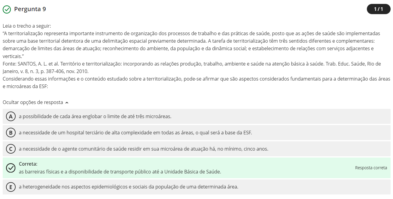 Leia o trecho a seguir: "A territorialização representa importante instrumento de organização dos processos de trabalho e das práticas de saúde, posto que as ações de saúde são implementadas sobre uma base territorial detentora de uma delimitação espacial previamente determinada. A tarefa de territorialização têm três sentidos diferentes e complementares: demarcação de limites das áreas de atuação; reconhecimento do ambiente, da população e da dinâmica social; e estabelecimento de relações com serviços adjacentes e verticais." Fonte: SANTOS, A. L. et al. Território e territorialização: incorporando as relações produção, trabalho, ambiente e saúde na atenção básica à saúde. Trab. Educ. Saúde, Rio de Janeiro, V. 8, n. 3, p. 387-406, nov. 2010. Considerando essas informações e conteúdo estudado sobre a territorialização, pode-se afirmar que são aspectos considerados fundamentais para a determinação das áreas e microáreas da ESF: A a possibilidade de cada área englobar limite de até três microáreas. B a necessidade de um hospital terciário de alta complexidade em todas as áreas, o qual será a base da ESF. C a necessidade de o agente comunitário de saúde residir em sua microárea de atuação há, no mínimo, cinco anos. D as barreiras físicas e a disponibilidade de transporte público até a Unidade Básica de Saúde. E a heterogeneidade nos aspectos epidemiológicos e sociais da população de uma determinada área.