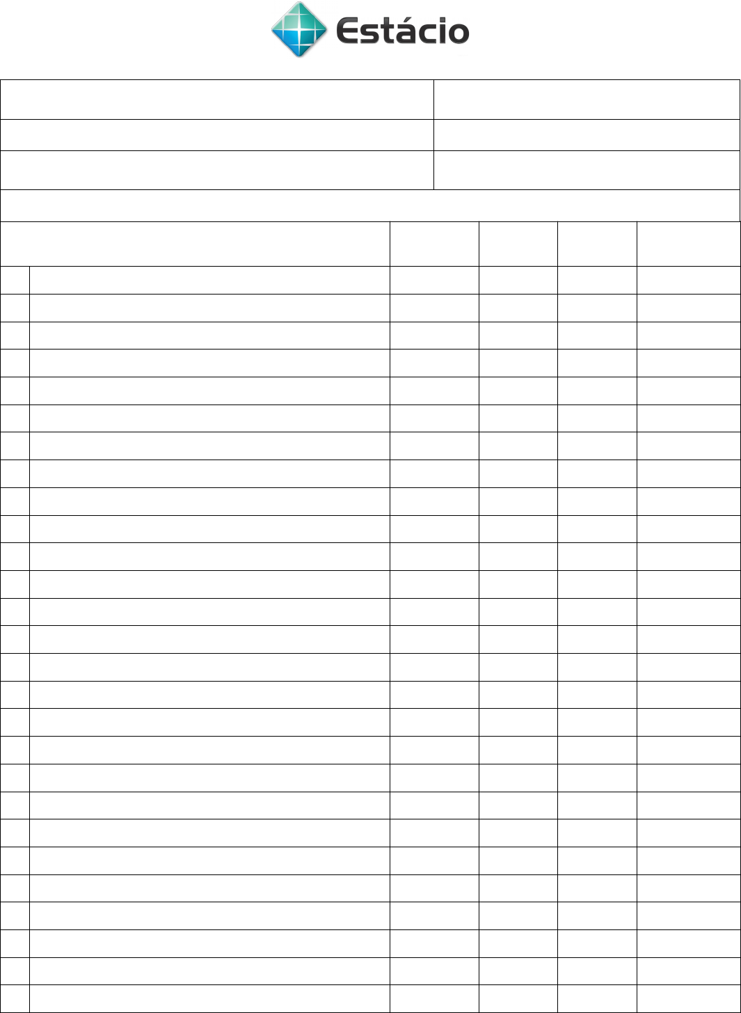 ANEXO 2 – FICHA DE ACOMPANHAMENTO DE ATIVIDADES Nome do(a) Estagiário(a): Curso: FARMÁCIA IES: FACULDADE ESTÁCIO DE BELÉM Polo: Nome da disciplina de Estágio: ESTÁGIO SUP. EM ANÁLISES CLÍNICAS Código da disciplina de Estágio: ARA0640 Empresa concedente do estágio: ATIVIDADES REALIZADAS DATA HORA INÍCIO HORA FINAL Visto do Supervisor 1 / / : : 2 / / : : 3 / / : : 4 / / : : 5 / / : : 6 / / : : 7 / / : : 8 / / : : 9 / / : : 10 / / : : 11 / / : : 12 / / : : 13 / / : : 14 / / : : 15 / / : : 16 / / : : 17 / / : : 18 / / : : 19 / / : : 20 / / : : 21 / / : : 22 / / : : 23 / / : : 24 / / : : 25 / / : : 26 / / : : 27 / / : : 28 / / : : 29 / / : : 30 / / : : 31 / / : : 32 / / : : 33 / / : : 34 / / : : 35 / / : : 36 / / : : 37 / / : : 38 / / : : 39 / / : : 40 / / : : 41 / / : : 42 / / : : 43 / / : : 44 / / : : 45 / / : : 46 / / : : 47 / / : : 48 / / : : 49 / / : : 50 / / : : 51 / / : : 52 / / : : 53 / / : : 54 / / : : Total de horas ASSINATURA E CARIMBO DO SUPERVISOR(A) DA ORGANIZAÇÃO CONCEDENTE ASSINATURA DO ALUNO image1.jpeg image2.png