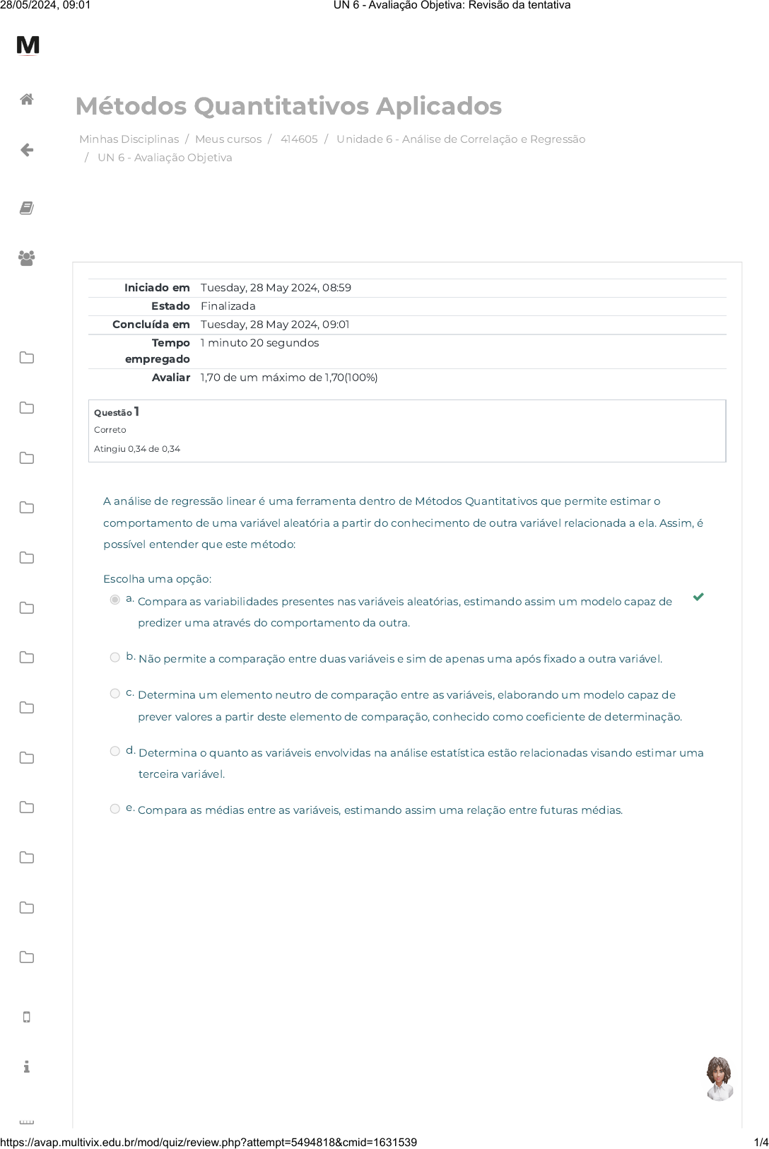 Minhas Disciplinas / Meus cursos / 414605 / Unidade 6 - Análise de Correlação e Regressão / UN 6 - Avaliação Objetiva Métodos Quantitativos Aplicados Iniciado em Tuesday, 28 May 2024, 08:59 Estado Finalizada Concluída em Tuesday, 28 May 2024, 09:01 Tempo empregado 1 minuto 20 segundos Avaliar 1,70 de um máximo de 1,70(100%) Questão 1 Correto Atingiu 0,34 de 0,34 A análise de regressão linear é uma ferramenta dentro de Métodos Quantitativos que permite estimar o comportamento de uma variável aleatória a partir do conhecimento de outra variável relacionada a ela. Assim, é possível entender que este método: Escolha uma opção: a. Compara as variabilidades presentes nas variáveis aleatórias, estimando assim um modelo capaz de predizer uma através do comportamento da outra. b. Não permite a comparação entre duas variáveis e sim de apenas uma após �xado a outra variável. c. Determina um elemento neutro de comparação entre as variáveis, elaborando um modelo capaz de prever valores a partir deste elemento de comparação, conhecido como coe�ciente de determinação. d. Determina o quanto as variáveis envolvidas na análise estatística estão relacionadas visando estimar uma terceira variável. e. Compara as médias entre as variáveis, estimando assim uma relação entre futuras médias. 28/05/2024, 09:01 UN 6 - Avaliação Objetiva: Revisão da tentativa https://avap.multivix.edu.br/mod/quiz/review.php?attempt=5494818&cmid=1631539 1/4 https://avap.multivix.edu.br/my/ https://avap.multivix.edu.br/course/view.php?id=26164 https://avap.multivix.edu.br/course/view.php?id=26164§ion=7 https://avap.multivix.edu.br/mod/quiz/view.php?id=1631539 https://avap.multivix.edu.br/my/ https://avap.multivix.edu.br/course/view.php?id=26164 https://avap.multivix.edu.br/user/index.php?id=26164 https://avap.multivix.edu.br/course/view.php?id=26164§ion=1 https://avap.multivix.edu.br/course/view.php?id=26164§ion=2 https://avap.multivix.edu.br/course/view.php?id=26164§ion=3 https://avap.multivix.edu.br/course/view.php?id=26164§ion=4 https://avap.multivix.edu.br/course/view.php?id=26164§ion=5 https://avap.multivix.edu.br/course/view.php?id=26164§ion=6 https://avap.multivix.edu.br/course/view.php?id=26164§ion=7 https://avap.multivix.edu.br/course/view.php?id=26164§ion=8 https://avap.multivix.edu.br/course/view.php?id=26164§ion=9 https://avap.multivix.edu.br/course/view.php?id=26164§ion=10 https://avap.multivix.edu.br/course/view.php?id=26164§ion=11 https://avap.multivix.edu.br/course/view.php?id=26164§ion=12 https://avap.multivix.edu.br/course/view.php?id=26164§ion=13 https://avap.multivix.edu.br/hooks/portal/ https://avap.multivix.edu.br/mod/page/view.php?id=1252%2F%22%20target%3D%22_blank https://avap.multivix.edu.br/calendar/view.php/ https://avap.multivix.edu.br/ https://avap.multivix.edu.br/ https://avap.multivix.edu.br/ https://avap.multivix.edu.br/ https://avap.multivix.edu.br/ Questão 2 Correto Atingiu 0,34 de 0,34 Questão 3 Correto Atingiu 0,34 de 0,34 Ao realizar um estudo estatístico para veri�car o comportamento entre duas variáveis aleatórias, Henrique encontrou que o coe�ciente de determinação entre elas é 0,92. Assim, é possível inferir que: Escolha uma opção: a. A relação entre as variáveis envolvidas nesta análise é inversamente proporcional. b. A relação entre as variáveis envolvidas nesta análise é diretamente proporcional. c. Não existe relação entre as variáveis envolvidas nesta análise. d. Não é possível a�rmar nada apenas com esta estatística. e. 92% da varibilidade presente na variável aleatória Y é explicada pela variabilidade presente na variável aleatória X. Célia estava fazendo uma atividade e a�rmou que “o coe�ciente de determinação é uma ferramenta estatística que permite estimar a relação existente entre duas variáveis correlacionadas, além de permitir predizer valores futuros para uma das variáveis multiplicando-o pela outra variável abordada no estudo”. Ao analisar a a�rmação de Célia, é possível concluir que ela está: Escolha uma opção: a. Totalmente correta. b. Parcialmente correta, errando ao a�rmar que o coe�ciente de determinação permite estimar a relação existente entre duas variáveis correlacionadas. c. Totalmente enganada. d. Parcialmente correta, errando ao a�rmar que o coe�ciente de determinação permite estimar valores futuros, pois quem é responsável por esta parte é a reta de regressão linear. e. Parcialmente correta, errando ao a�rmar que o coe�ciente de determinação permite estimar a relação existente entre duas variáveis correlacionadas, pois quem é responsável por esta parte é o coe�ciente de correlação. 28/05/2024, 09:01 UN 6 - Avaliação Objetiva: Revisão da tentativa https://avap.multivix.edu.br/mod/quiz/review.php?attempt=5494818&cmid=1631539 2/4 https://avap.multivix.edu.br/my/ https://avap.multivix.edu.br/course/view.php?id=26164 https://avap.multivix.edu.br/user/index.php?id=26164 https://avap.multivix.edu.br/course/view.php?id=26164§ion=1 https://avap.multivix.edu.br/course/view.php?id=26164§ion=2 https://avap.multivix.edu.br/course/view.php?id=26164§ion=3 https://avap.multivix.edu.br/course/view.php?id=26164§ion=4 https://avap.multivix.edu.br/course/view.php?id=26164§ion=5 https://avap.multivix.edu.br/course/view.php?id=26164§ion=6 https://avap.multivix.edu.br/course/view.php?id=26164§ion=7 https://avap.multivix.edu.br/course/view.php?id=26164§ion=8 https://avap.multivix.edu.br/course/view.php?id=26164§ion=9 https://avap.multivix.edu.br/course/view.php?id=26164§ion=10 https://avap.multivix.edu.br/course/view.php?id=26164§ion=11 https://avap.multivix.edu.br/course/view.php?id=26164§ion=12 https://avap.multivix.edu.br/course/view.php?id=26164§ion=13 https://avap.multivix.edu.br/hooks/portal/ https://avap.multivix.edu.br/mod/page/view.php?id=1252%2F%22%20target%3D%22_blank https://avap.multivix.e