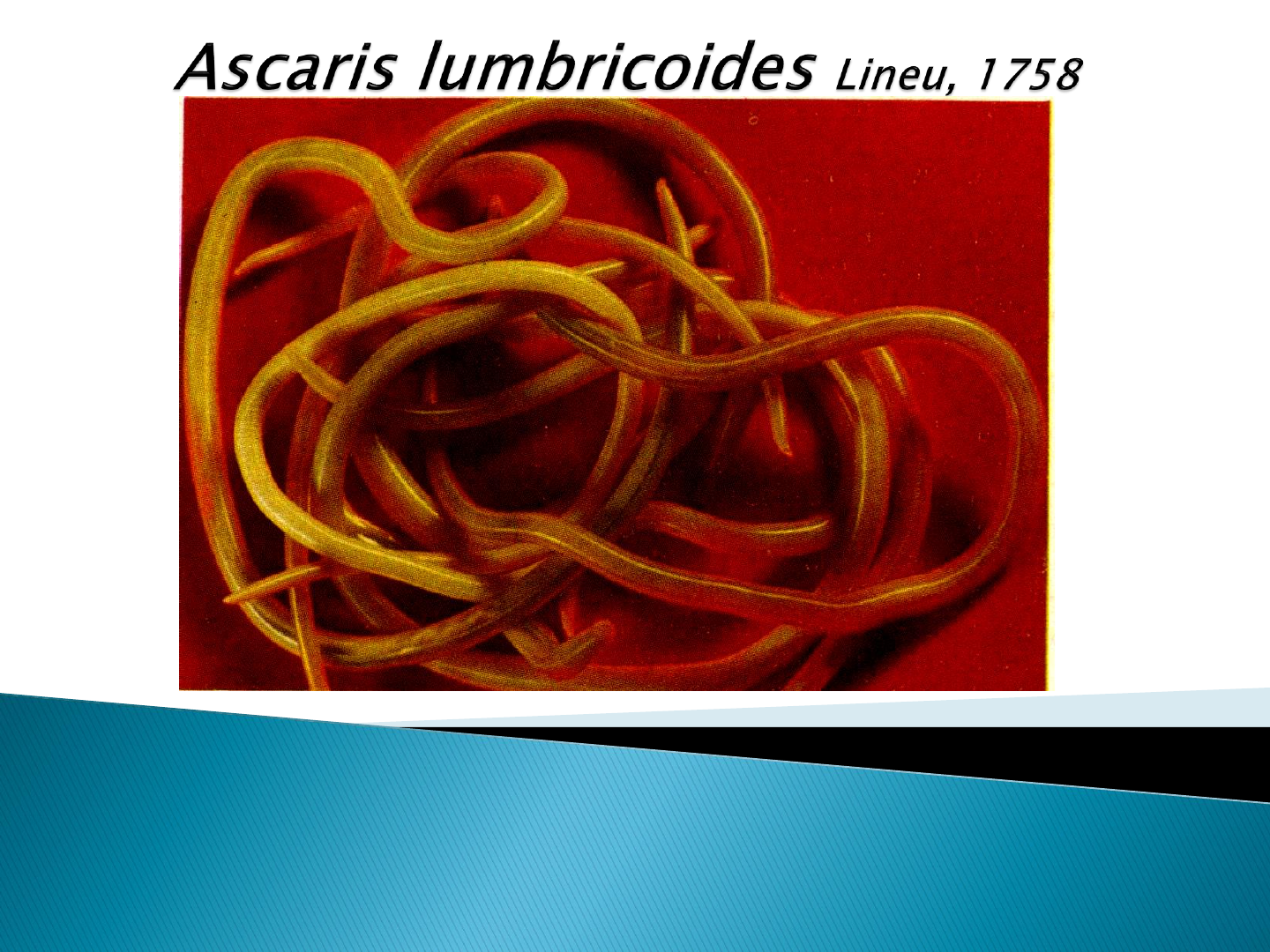 ➢É um helminto nematóide da família Ascarididae e o maior parasito habitual do homem. ➢Os Ascaris são conhecidos, popularmente, como lombrigas ou bichas. ➢Localizam-se de preferência no duodeno e no jejuno, onde produzem um quadro clínico variado denominado ascaridíase. ➢São vermes longos, cilíndricos e com extremos afilados, sobretudo anteriormente. ➢A extremidade posterior das fêmeas é quase reta, enquanto a dos machos é enrolada ventralmente em espiral. Introdução Ascaris lumbricoides A - fêmea B - macho Ovos ➢Os ovos férteis são ovais ou quase esféricos e medem em torno de 60 x 45 µm (A). ➢No solo, embrionam em 2 semanas (entre 20 e 30ºC) e se tornam infectantes dentro de outra semana (B), podendo permanecer infectantes durante um ou mais anos. ➢Os ovos de Ascaris são abundantes no chão do peridomicílio poluído com fezes humanas, e podem ser suspensos no ar, com a poeira, pela ação dos ventos. ➢Quando isoladas ou mais numerosas que os machos, as fêmeas podem por ovos inférteis, mais alongados (C), que não embrionam. Biologia a) Habitat • Intestino delgado • Localizações ectópicas ➢ Ocorre através da ingestão de água ou alimentos contaminados com os ovos de A. lumbricoides ➢ Os ovos de A. lumbricoides têm uma grande capacidade de aderência a superfície, o que representa um fator importante na transmissão da parasitose. ➢ Uma vez presente no ambiente ou em alimentos, estes ovos não são removidos com facilidade por lavagem. ➢ Os ovos também podem estar presentes na poeira e serem aspirados e depois deglutidos com o muco das vias aéreas. ➢É do tipo monoxênico. Cada fêmea deve ser fecundada várias vezes, acumulando os espermatozóides amebóides (sem flagelos) no útero ou começo do oviduto, onde são fertilizados os óvulos ao passarem. ➢Cada fêmea fecundada é capaz de colocar, por dia, cerca de 200.000 ovos não embrionados, que chegam ao ambiente juntamente com as fezes. ➢Os ovos férteis em presença de temperatura entre 25°C e 30°C, umidade mínima de 70% e oxigênio em abundância tornam-se embrionados em 15 dias. ➢O verme pode viver por mais de dois anos ➢Apresenta fase pulmonar – “Ciclo de Looss” ➢Após 60 dias alcançam maturidade sexual e são encontrados ovos nas fezes Ascaris lumbricoides Trichuris trichiura Enterobius vermiculares Necator americanus Ancylostoma duodenale Strongyloides stercoralis Necator americanus Ancylostoma duodenale Strongyloides stercoralis Ascaris lumbricoides A T E N A S N A S A Larva: ➢ infecções pequenas – sem alteração ➢ Infecções maciças ✓ lesões hepáticas: focos hemorrágicos e necrose ✓ lesões pulmonares: • pontos hemorrágicos • quadro pneumônico • edemaciação dos alvéolos • manifestações alérgicas • febre, bronquite, pneumonia • tosse produtiva( muco sangüinolento e larvas) Síndrome de Löeffler Vermes adultos: ➢ Infecções pequenas(3 a 4 vermes) – sem alteração ➢ Infecções Médias (30 a 40) e maciças(acima de 100) alterações graves • ação espoliativa – consomem proteínas, carboidratos, lipídeos e vitaminas A e C; • ação tóxica – edema, urticária, convulsões • ação mecânica – irritação da parede intestinal ação obstrutiva e compressiva ➢localizações ectópicas • Apêndice fecal • Canal colédoco • Canal de Wirsung • Estômago • Eliminação pela boca e narinas (Áscaris Errádico) ➢em crianças pode aparecer alterações cutâneas: • manchas claras, • circulares no rosto, tronco e braços • causadas pelo alto consumo de Vitaminas A e C ?????????? ➢ Os vermes localizam-se, em geral, nas alças jejunais (90%); o resto no íleo. ➢ Raramente migram para o duodeno, estômago ou outros lugares. Mas, crianças muito parasitadas podem eliminar alguns pela boca ou pelas narinas. ➢ Os áscaris mantêm-se em atividade constante, movendo-se quase sempre contra a corrente peristáltica. ➢ Aí, se nutrem de materiais semi-digeridos ou outros, dispondo para isso de todas as enzimas necessárias. Parasitose do cólon ➢CLINICO: Usualmente a ascaridíase humana é pouco sintomática, por isso mesmo, difícil de ser diagnosticada em exames clínicos. ➢LABORATORIAL: • É feito pela pesquisa de ovos nas fezes. • Como as fêmeas eliminam diariamente milhares de ovos por dia, não há necessidade, nos exames de rotina, de metodologia específica ou métodos de enriquecimentos bastando a técnica de sedimentação espontânea (HPJ). ➢ Casos graves - Cirurgia Intestino delgado distendido obstruído por Ascaris lumbricoides Extração de Ascaris lumbricoides após enterotomia Ascaris lumbricoides extraídos durante laparotomia exploradora Obstrução Intestinal Maciça ➢Mais freqüente nas áreas tropicais atingindo 70 a 90% das crianças; ➢Fatores importantes pela alta prevalência: • temperatura anual elevada • umidade ambiente elevada • viabilidade do ovo infectante por muitos meses (até anos) • grande produção de ovos pela fêmea • dispersão dos ovos através de chuva, vento e moscas • grande concentração de ovos no peridomicílio ➢ Considerada uma geo-helmintose , cuja maturação de ovos ou larvas se faz no solo; ➢ Faz parte do círculo vicioso pobreza-doença ➢ Resultante da má qualidade de vida e o determinante sócio-econômico interfere e define o quadro biológico e patológico. ➢ Educação sanitária; ➢ Construção de fossas sépticas ➢ Tratamento em massa periodicamente (após exames coproscópicos) ➢ Proteção de alimentos contra poeira e insetos ➢ Descentralização e preparação de equipes de trabalho ao nível municipal e da comunidade num trabalho típico: quebrar o ciclo pobreza x doença x apatia política • Desfolhar as verduras de folhar e fazer a triagem dos legumes e frutas, um a um, retirando as partes estragadas antes de começar a usar a água. • Lavar as folhas, legumes e fruta
