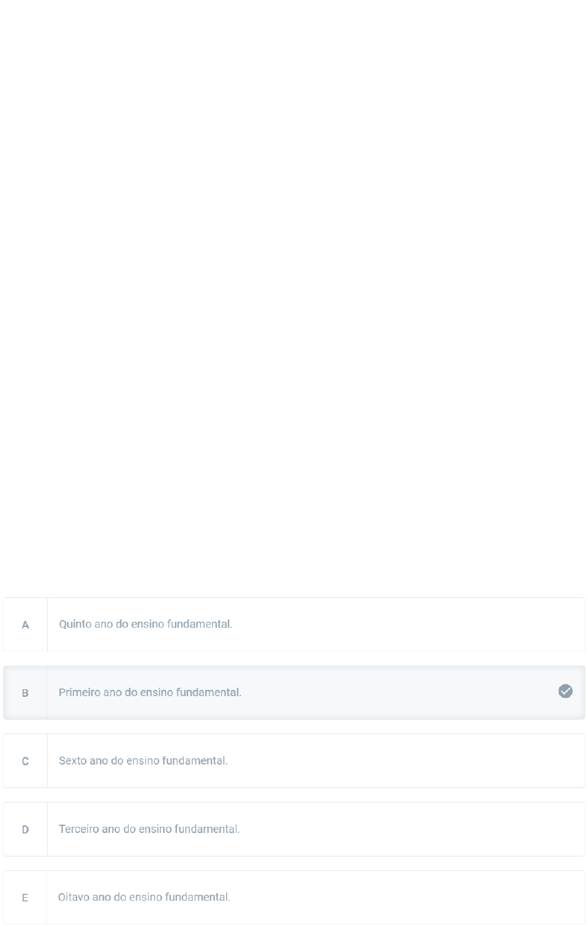 Questão 1 “Classificar eventos envolvendo o acaso, tais como ‘acontecerá com certeza’, ‘talvez aconteça’ e ‘é impossível acontecer’, em situações do cotidiano. Ler dados expressos em tabelas e em gráficos de colunas simples. Realizar pesquisa, envolvendo até duas variáveis categóricas de seu interesse e universo de até 30 elementos, e organizar dados por meio de representações pessoais” (MINISTÉRIO DA EDUCAÇÃO. Base Nacional Comum Curricular. Brasília: MEC, 2018, p. 281). O professor de matemática preparou uma atividade para que seus alunos trabalhem com dados de probabilidades estatísticos que envolvam classificação de eventos que contem com o acaso. Ele pretende que seus alunos desenvolvam uma das habilidades e, para tal, eles deverão ter como apoio os três pontos: “acontecerá com certeza”, “talvez aconteça” e “é impossível acontecer”. Essa habilidade se refere ao: A alternativa B está correta. Indicadores como colunas simples, duas variáveis, até 30 elementos já nos apontam que se trata do início do ensino fundamental. No caso específico, do primeiro ano do ensino fundamental, pois a Estatística apresenta-se de forma simples e sem necessidade específica de nomeação. Está previsto no ensino da Probabilidade e Estatística na BNCC o desenvolvimento de “Noção de acaso”, habilidade prevista para o primeiro ano do ensino fundamental. image1.png