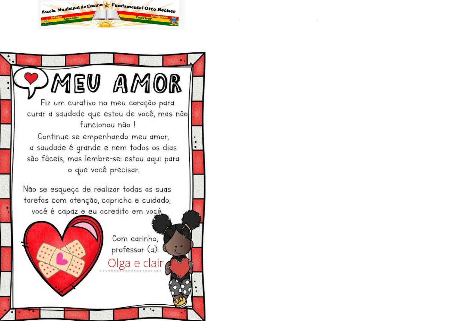 3ª Semana de atividades. 4º ano. Profª Olga e Profª Clair LÍNGUA PORTUGUESA: LEITURA E INTERPRETAÇÃO Dia Mundial da Água É hora de aprender que esse é um bem finito! Em 1992, em um importante evento que antecedeu a ECO-92, aconteceu na Irlanda a conferência internacional de água que, dentre outras medidas, estabeleceu o dia 22 de março como sendo o dia mundial da água. Muito mais que uma data comemorativa, esse é o dia para que o mundo todo, todos os seus habitantes, reflitam sobre o uso e a importância do mais precioso líquido para o ser humano, que é a água. Afinal sem ela não há vida. 1- O objetivo principal do texto DIA MUNDIAL DA ÁGUA é: (A) contar uma história sobre a água (B) alertar sobre a preservação da água (C) dar notícia sobre o dia internacional da água (D) comemorar o dia da água 2- É precioso saber que a água é um bem finito. A expressão significa: (A) que sempre existirá água (B) a água é um líquido que terá fim (C) economizar é importante (D) a água nunca acaba 3- Se a água é um líquido precioso para o ser humano, podemos dizer que ela: (A) pode ser utilizada à vontade (B) pode ser utilizada apenas por quem paga a conta de água (C) devemos utiliza-la com sabedoria e economia (D) devemos vendê-la, pois ela é preciosa e podemos ganhar dinheiro com ela 4- Comemora-se o Dia Mundial da Água: (A) no dia 22 de maio (B) no dia 12 de março (C) no dia 19 de maio (D) no dia 22 de março VAMOS REFLETIR: Usando uma torneira aberta durante 5 minutos, para escovar os dentes ou fazer a barba, se gasta em média 12 litros de água. Algumas maneiras de economizar até 2 litros de água são: escovar os dentes utilizando um copo de água, fazer a barba colocando um tampão na pia. Uma torneira que fique gotejando um dia inteiro gasta cerca de 45 litros de água. Outra atitude que desperdiça muita água é um banho demorado. Uma descarga chega a gastar 19 litros de água. Por isso recomenda-se que sejam trocadas as válvulas de descarga antigas por válvulas novas que tem duas opções de descarga, e para quem não pode trocar a descarga deve-se evitar descargas desnecessárias e prolongadas. Devemos ter consciência que a água é um bem essencial para a vida de todos, pois nós podemos passar até 28 dias sem comer, mas apenas três dias sem água. Atividade de Ciências Escolhe 6 palavras sobre o Dia da Água e forma frases: ______________________________________________ ______________________________________________ ______________________________________________ ______________________________________________ ______________________________________________ ______________________________________________ ______________________________________________ Ensino Religioso Completa com (V) onde for verdadeiro e (F) onde for falso: ( ) poupar água; ( ) escovar os dentes com a torneira aberta; ( ) Preservar os rios; ( ) Jogar esgoto nos rios; -Assista ao vídeo: “ Economize a água do planeta” que será colocado no grupo e faça um desenho que mostre como você está ajudando a preservar a água. Atividades de Matemática 1-Troque as letras pelos algarismos na tabela abaixo e veja quais números podem ser formados: L A R T O C S E 2 3 5 1 4 7 6 8 As palavras são: a) Lar = b) Rato = c) Casa = d) Escola = 2- Leia a escrita por extenso dos numerais: 3-Escreva por extenso: a) 743__________________________________________ b) 124__________________________________________ c) 1431_________________________________________ d) 3831_________________________________________ e) 875__________________________________________ f) 296__________________________________________ g) 4539_________________________________________ 4- Complete com os números a seguir: a) Dois mil cento e trinta e quatro__________ b) Oitocentos e vinte e nove______________ c) Três mil e quarenta e oito_____________ d) Um mil novecentos e oitenta e três____________ e) Trezentos e doze________ f) Quatro mil setecentos e setenta e oito___________ 5- Completa de 10 em 10: 310- _______________________________________________ 465-_______________________________________________ 500-_________________________________________________ 6- Completa com o dobro de: 20-___________ 45-____________ 60-__________ 15-__________ 100-__________ 250-__________ GEOGRAFIA: RESPEITO A DIVERSIDADE CULTURAL: A diversidade cultural refere-se aos diferentes costumes de uma sociedade, entre os quais podemos citar: vestimenta, culinária, manifestações religiosas, tradições, entre outros aspectos. O Brasil, por conter um extenso território, apresenta diferenças climáticas, econômicas, sociais e culturais entre as suas regiões. Você já reparou nos seus colegas, nas pessoas que estão à sua volta, nas ruas? A cor da pele, o formato dos olhos, os cabelos, o nariz e o modo de falar? Todos somos brasileiros, falamos a mesma língua, porém, todos somos diferentes. O povo brasileiro foi se formando, através de séculos, por pessoas de diferentes origens: descendentes de índios, africanos, europeus, asiáticos. E aos poucos, os brasileiros foram descobrindo seu próprio país e criando sua cultura. Antes de nós, nossos pais, avós, bisavós, tataravós fizeram e viveram sua história nas diferentes regiões do Brasil. Cada família contribuiu com suas ideias, costumes e tradições, deixando o Brasil com a cara que tem hoje. MINHA IDENTIDADE: AGORA,É A SUA VEZ DE RESPONDER AO QUESTIONÁRIO: *Nome completo:___________________________________________ *Idade:____________________________________________________ *Cor do cabelo:_____________________________________________ *Cor dos olhos:_____________________________________________ *Cor da pele:_______________________________________________ *Cidade onde mora:__________________________________________ *Comida preferida:__________________________________________ *Brincadeira preferida:_______________________________________ Agora faça um desenho bem bonito 