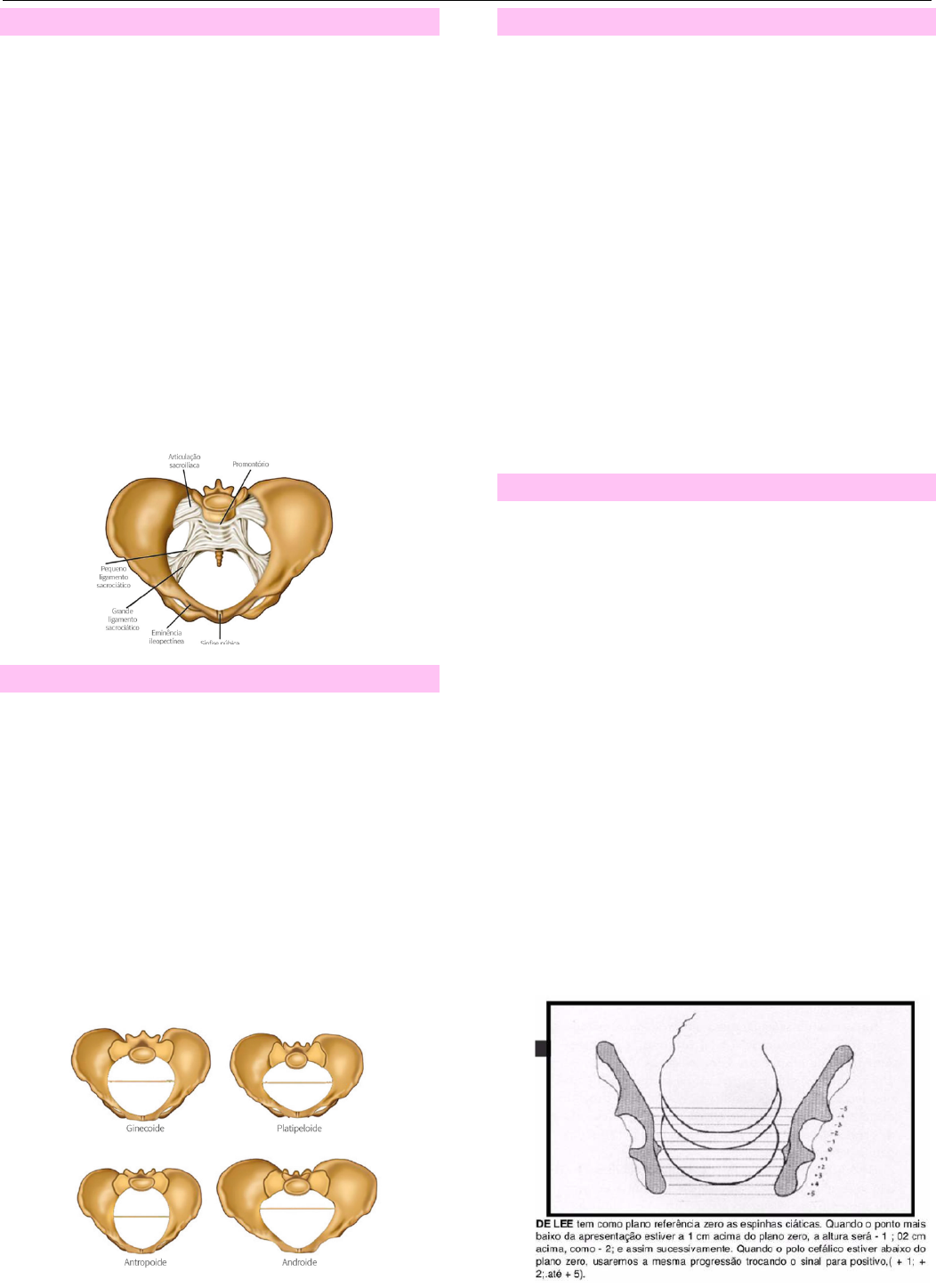 GINECOLOGIA E OBSTETRÍCIA – MARIANA MARQUES .INTRODUÇÃO • A bacia obstétrica consiste na região pélvica com grande importância clínica na evolução do parto, assim, sua conformidade pode dificultar ou facilitar a passagem do feto pela bacia durante o parto. • A causa mais frequente de trabalho de parto obstruído é a desproporção cefalopélvica – incompatibilidade entre a cabeça fetal e a pélvis da mãe. • É constituída por 4 ossos: 2 ilíacos, o sacro e o cóccix, sendo que os ossos ilíacos, são constituídos pelo ílio, ísquio e pube fundidos. • Entre os ossos do osso ilíaco, existem três articulações: sínfise púbica, sacroilíacas e sacrococcígeas (ficam mais frouxas na gestação pela ação da progesterona). • Esse conjunto ósseo articulado entre si constitui na mulher a parte óssea do canal do parto. • A pélvis feminina atinge a morfologia obstetricamente mais adequada em torno do tempo de fertilidade máxima (25 a 30 anos). ANATOMIA DA PELVE ÓSSEA GRANDE BACIA OU PELVE FALSA: • Localiza-se acima do estreito superior da bacia. PEQUENA BACIA OU PELVE VERDADEIRA/OBSTÉTRICA: • Localiza-se abaixo do estreito superior da bacia (estende-se do estreito superior até o estreito inferior). • Possui importância obstétrica. • Os estreitos são as regiões mais afuniladas da bacia, podendo dificultar o parto. • O formato do estreito superior varia com o tipo de bacia, podendo ser: ginecoide (elipse transversa - oval), antropóide (ginecoide rodada em 90º), andróide (triangular- parto complicado) e platipelóide (achatada, difícil do feto insinuar). DIÂMETROS DA BACIA ESTREITO SUPERIOR: • Anteroposterior ou conjugado verdadeiro: 11cm. • Oblíquos (da eminência ileopectínea até a sinostose sacroilíaca): 12cm. • Transverso máximo (maior diâmetro): 13-13,5 cm. • Transverso médio: 12cm. ESTREITO MÉDIO: • Sacro médio púbico (anteroposterior): 12cm. • Bi isquiático ou transverso (consiste no ponto de maior estreitamento do canal de parto): 10,5cm. ESTREITO INFERIOR: • Transverso ou bi-tuberoso ou bi-isquiático: 11cm. • Diâmetro cóccix-subpúbico (antetoposterior): 9,5cm (11cm após retropulsão do cóccix). PLANOS OBSTÉTRICOS • São planos imaginários, traçados na entrada, na saída e em variadas alturas da pelve para facilitar a avaliação da descida do feto no canal de parto. PLANOS DE LEE: • Ferramenta importante na construção de partogramas, sendo analisados juntamente com a dilatação do canal cervical e a variedade de posição. • Os planos relacionam o posicionamento do ponto mais baixo do polo cefálico fetal em relação às espinhas isquiáticas maternas, configurando a altura da apresentação do feto. • O ponto zero consiste na linha que liga as espinhas isquiáticas maternas, com os pontos máximos variando geralmente entre -3 cm e +3 cm. • Acima das espinhas, utiliza-se numerações negativas com a distância em centímetros e abaixo das espinhas, utiliza-se numerações positivas, ou seja, quanto mais próximo da vagina mais positivo. Bacia Obstetrica e Estatica Fetal GINECOLOGIA E OBSTETRÍCIA – MARIANA MARQUES CARACTERÍSTICAS GERAIS DO FETO • O feto atinge seu desenvolvimento completo quando chega na 40ª semana e nessa IG, mede cerca de 50 cm de comprimento e pesa entre 3.000g e 3.500g. • Dependendo do peso, podem ser: pequenos para a IG (PIG), adequados à IG (AIG) ou grandes para a IG (GIG). Þ RN GIG quando nascem com >4kg são chamados de macrossômicos. CABEÇA DO FETO: • A cabeça fetal é o principal ponto de dificuldade a passar pelos estreitos da pelve. • O crânio é formado por 7 ossos: 2 frontais, 2 temporais, 2 parietais, 1 occipital, 1 esfenoide e 1 etmoide. • No feto esses ossos estão justapostos e separados por espaços membranosos (suturas), cuja união limita as fontanelas. SUTURAS: • 4 suturas importantes na cabeça do feto. Þ Sutura sagital: entre as bordas internas dos dois ossos parietais, estende-se do bregma ao lambda; Þ Sutura mediofrontal: entre os dois ossos frontais; Þ Sutura frontoparietal: entre os dois ossos frontais e as bordas anteriores dos ossos parietais; Þ Sutura occipitoparietal ou lambdoide: composta pelo osso occipital e as bordas posteriores dos ossos parietais. FONTANELAS: • 8 espaços membranosos, sendo as duas principais a bregma e a lambda. Þ Bregma ou fontanela anterior: tem forma de losango e é o maior espaço membranoso do crânio. Þ Lambda ou fontanela posterior: fica localizada na região occipital e pode estar ausente em alguns RN ESTÁTICA FETAL • Consiste nas relações espaciais entre o feto e o organismo materno; ATITUDE: • A atitude ou hábito fetal diz respeito às relações das diversas partes do feto entre si. • Em geral, o feto se aloja na cavidade uterina em atitude de flexão, c/ encurvamento da coluna e cabeça fletida. • Em situações anômalas, pode haver extensão da coluna com deflexão do polo cefálico, levando às apresentações defletidas. SITUAÇÃO: • Relação entre o maior eixo uterino e maior eixo fetal. • Há três possibilidades de situação fetal: Þ Longitudinal: maior eixo uterino e fetal coincidem. Þ Transversa: o feto se dispõe perpendicularmente ao maior eixo uterino; Þ Oblíqua: fase de transição da situação fetal, no parto se definirá em longitudinal ou transversa. APRESENTAÇÃO: • Região fetal que ocupa o estreito superior. • Pode ser bem definida após o sexto mês; • Na situação longitudinal, a apresentação pode ser cefálica ou pélvica, de acordo com a região que ocupa a área do estreito superior. • Na situação transversa, a apresentação é córmica. • Denomina-se procidência ou prolapso a presença de uma parte fetal menor (membros) que se antepõe à apresentação durante o trabalho de parto, ocupando a vagina ou se exteriorizando pela vulva. • Apresentação cefálica: Þ Fletida: o mento fetal encosta no est