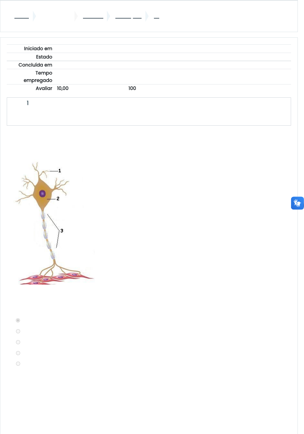 Painel Meus cursos N0344D1 Avaliações T2 Iniciado em domingo, 26 mai 2024, 11:10 Estado Finalizada Concluída em domingo, 26 mai 2024, 11:43 Tempo empregado 33 minutos 23 segundos Avaliar 10,00 de um máximo de 10,00(100%) Questão 1 Correto Atingiu 1,00 de 1,00 Observe a estrutura do neurônio abaixo e marque a alternativa correta: Escolha uma opção: a. A estrutura indicada por 2 é o corpo celular, local de onde partem os dendritos e axônios. b. A estrutura 3 é o dendrito, local especializado em receber os estímulos nervosos. c. A transmissão do impulso nervoso sempre ocorre no sentido 3-2-1. d. O axônio, estrutura 2, é envolto por uma camada denominada bainha de mielina. e. A estrutura indicada pelo número 1 é o axônio. Sua resposta está correta. A resposta correta é: A estrutura indicada por 2 é o corpo celular, local de onde partem os dendritos e axônios. 28/05/2024, 15:46 T2: Revisão da tentativa https://ead.universo.edu.br/mod/quiz/review.php?attempt=2066007&cmid=642922 1/6 https://ead.universo.edu.br/my/ https://ead.universo.edu.br/course/view.php?id=3341 https://ead.universo.edu.br/course/view.php?id=3341#section-7 https://ead.universo.edu.br/mod/quiz/view.php?id=642922 Questão 2 Correto Atingiu 1,00 de 1,00 Questão 3 Correto Atingiu 1,00 de 1,00 Porção do trato gastrointestinal em que ocorre a absorção dos nutrientes: Escolha uma opção: a. Laringe b. Pâncreas c. Fígado d. Intestino delgado e. Estômago Sua resposta está correta. A resposta correta é: Intestino delgado Enzimas responsáveis pela digestão de lipídios no trato gastrointestinal: Escolha uma opção: a. Exopeptidases b. Dissacaridases c. Lipases d. Amilases e. Proteases Sua resposta está correta. A resposta correta é: Lipases 28/05/2024, 15:46 T2: Revisão da tentativa https://ead.universo.edu.br/mod/quiz/review.php?attempt=2066007&cmid=642922 2/6 Questão 4 Correto Atingiu 1,00 de 1,00 Questão 5 Correto Atingiu 1,00 de 1,00 O sistema respiratório apresenta a função básica de realizar trocas gasosas com o objetivo de: Escolha uma opção: a. Adquirir o O fazendo com que as anastomoses sejam ativadas b. Suprir o organismo com O e dele remover CO c. Gerar diferentes enzimas d. Gerar energia pela hidrólise e. Gerar energia pela mobilização do CO para os vasos 2 2 2 2 Sua resposta está correta. A resposta correta é: Suprir o organismo com O e dele remover CO2 2 Sistema que propicia os processos de obtenção de nutrientes, água e eletrólitos a partir da alimentação, substratos necessários para manter o metabolismo celular: Escolha uma opção: a. Sistema Digestório b. Sistema Nervoso c. Sistema Renal d. Sistema Respiratório e. Sistema reprodutor Sua resposta está correta. A resposta correta é: Sistema Digestório 28/05/2024, 15:46 T2: Revisão da tentativa https://ead.universo.edu.br/mod/quiz/review.php?attempt=2066007&cmid=642922 3/6 Questão 6 Correto Atingiu 1,00 de 1,00 Questão 7 Correto Atingiu 1,00 de 1,00 A função principal do sangue é transportar oxigênio para os tecidos periféricos, impedindo o metabolismo anaeróbio da glicose. O sangue transporta esse gás principalmente ligado à hemoglobina, constituinte primário das células sanguíneas denominadas: Escolha uma opção: a. Plaquetas. b. Leucócitos. c. Eritrócitos ou hemácias. d. Linfócitos. e. Monócitos. Sua resposta está correta. A resposta correta é: Eritrócitos ou hemácias. Leia atentamente os itens I, II e III: I – Durante o processo de controle do movimento humano, os neurônios são as células responsáveis pela recepção e transmissão dos estímulos nervosos, possibilitando ao organismo a execução de respostas adequadas para a manutenção da homeostase. II – As sinapses são zonas ativas de contato entre uma terminação nervosa e outros neurônios, ou células de outros tecidos. III – Do ponto de vista anatômico e funcional, uma sinapse é composta por três grandes compartimentos: membrana da célula pré-sináptica, fenda sináptica e membrana pós-sináptica. Sobre os itens I, II e III é correto afirmar: Escolha uma opção: a. Itens I e II estão corretos e item III incorreto. b. Itens I e III estão corretos e item II incorreto. c. Itens II e III estão corretos e item I incorreto. d. Itens I, II e III estão incorretos. e. Itens I, II e III estão corretos. Sua resposta está correta. A resposta correta é: Itens I, II e III estão corretos. 28/05/2024, 15:46 T2: Revisão da tentativa https://ead.universo.edu.br/mod/quiz/review.php?attempt=2066007&cmid=642922 4/6 Questão 8 Correto Atingiu 1,00 de 1,00 Questão 9 Correto Atingiu 1,00 de 1,00 O sistema nervoso coordena as diversas funções do organismo, contribuindo para seu equilíbrio. Assinale a alternativa INCORRETA referente ao sistema nervoso. Escolha uma opção: a. O sistema nervoso periférico é constituído de nervos, gânglios e terminações nervosas. b. O sistema nervoso não permite que nosso corpo reaja de modo rápido a estímulos do meio ambiente, evitando assim que o organismo gere um quadro de estresse, perdendo assim a homeostasia. c. O sistema nervoso central é responsável por processar informações. d. O sistema nervoso central é constituído pelo encéfalo e pela medula espinhal. e. O sistema nervoso está dividido em duas partes fundamentais: sistema nervoso central e sistema nervoso periférico. Sua resposta está correta. A resposta correta é: O sistema nervoso não permite que nosso corpo reaja de modo rápido a estímulos do meio ambiente, evitando assim que o organismo gere um quadro de estresse, perdendo assim a homeostasia. Na boca irá começar a digestão química de ................................... pela ação da saliva e a digestão mecânica pelo processo de ...................................: Escolha uma opção: a. proteínas – deglutição b. proteínas – mastigação c. carboidratos – deglutição d. carboidratos – mastigação e. lipídeos – mastigaç