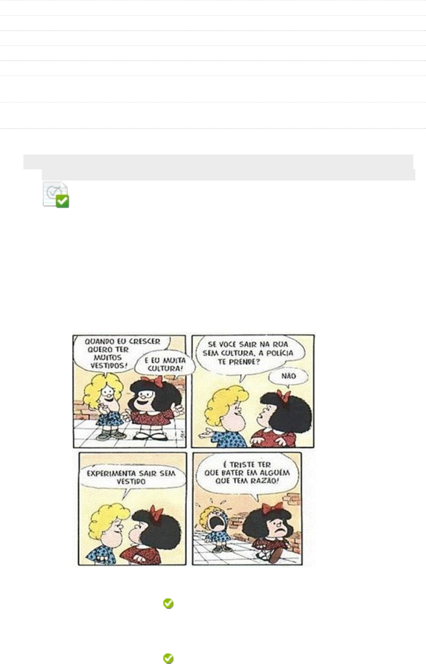 Usuário clayton.silva7 @aluno.unip.br Curso ESTUDOS DISCIPLINARES VII Teste QUESTIONÁRIO UNIDADE II Iniciado 17/03/23 13:04 Enviado 17/03/23 13:07 Status Completada Resultado da tentativa 5 em 5 pontos Tempo decorrido 3 minutos Resultados exibidos Todas as respostas, Respostas enviadas, Respostas corretas, Comentários, Perguntas respondidas incorretamente · Pergunta 1 0,5 em 0,5 pontos Para Bauman (2006), a individualização se tornou o destino de todo habitante de uma grande cidade contemporânea, não uma opção. A sociedade estimula os indivíduos a agirem em função dos problemas e dos medos que surgem diariamente. E, ao tentar fazer com que as vidas tenham sentido, os homens tendem a culpar suas próprias falhas e fraquezas pelos desconfortos e derrotas que enfrentam. Segundo Bauman, a reação só leva a mais isolamento. Desse modo, considerando a tirinha e a visão de Bauman, podemos afirmar que a noção de comunidade ideal: http://mafalda-portugues.blogspot.com.br/2010/03/analise-da-charge-no-tocante-ao.html Resposta Selecionada: a. Significa entendimento compartilhado de modo natural e implícito. Respostas: a. Significa entendimento compartilhado de modo natural e implícito. b. Significa desentendimento decorrente do não compartilhamento. c. Significa entendimento dos valores hierarquizados socialmente. d. Significa desentendimento entre grupos sociais. e. Significa desentendimento entre indivíduos. Feedback da resposta: Alternativa: A Comentário: para Bauman, a noção de comunidade é construída pelas ideias em comum. Assim, na tirinha temos dois posicionamentos que refletem ideias diferentes. Cada personagem pertence a uma comunidade e dentro do grupo suas ideias são compartilhadas de modo natural. A tirinha apresenta um conflito entre grupos sociais. · Pergunta 2 0,5 em 0,5 pontos De modo geral, todos os textos revelam os valores e as crenças de um grupo social e algumas vezes ocorrem conflitos intergrupais. A argumentação é a arte de convencer e persuadir. E decorre do posicionamento do enunciador. Sendo assim, é correto afirmar que: Resposta Selecionada: b. A argumentação pode ser compreendida como uma estratégia utilizada pelo autor do texto com o objetivo de levar o leitor a dar adesão às ideias defendidas pelo texto. Respostas: a. A argumentação não está presente em qualquer texto. b. A argumentação pode ser compreendida como uma estratégia utilizada pelo autor do texto com o objetivo de levar o leitor a dar adesão às ideias defendidas pelo texto. c. Para convencer, é necessário que o texto apresente opiniões contrárias as do seu leitor. d. Usar ideias racionais é indispensável para estabelecer uma relação lógica entre os segmentos do texto. e. A noção de sentido do texto é verificada pelas repetições e/ou redundâncias. Feedback da resposta: Alternativa: B Comentário: a argumentação ocorre a partir das informações baseadas nos conhecimentos prévios do leitor. · Pergunta 3 0,5 em 0,5 pontos De acordo com a charge, fica implícito que: http://www.blogdajoice.com/2012/06/charge-182/ Resposta Selecionada: e. Os partidos políticos são formados por pessoas que defendem ideais que representam o grupo social. Respostas: a. Os partidos políticos são formados por pessoas que não têm dinheiro, mas têm ideais. b. Os partidos políticos são formados por pessoas que têm boas condições financeiras e grandes ideais. c. A formação de um partido político pode ser a solução para os problemas financeiros. d. Os partidos políticos são sempre formados por pessoas que têm apenas boas intenções. e. Os partidos políticos são formados por pessoas que defendem ideais que representam o grupo social. Feedback da resposta: Alternativa: E Comentário: de modo geral, de acordo com a realidade brasileira, os políticos defendem os interesses de seu grupo, seu partido. · Pergunta 4 0,5 em 0,5 pontos O discurso de eficiência da empresa Chevron não se comprovou e teve repercussão na mídia mundial. Considerando a charge, podemos afirmar que a “violência” nos mares do Rio de Janeiro ao se referir às UPPs: http://blogdotarso.com/2011/11/page/2/ Resposta Selecionada: d. Precisa ser controlada pelas autoridades policiais. Respostas: a. Precisa ser controlada pelas organizações não governamentais. b. Precisa ser controlada pelos meios de comunicação de imprensa. c. Precisa ser controlada pelas empresas responsáveis. d. Precisa ser controlada pelas autoridades policiais. e. Precisa ser controlada pelo próprio ecossistema. Feedback da resposta: Alternativa: D Comentário: o escândalo provocado pela empresa Chevron e as ações de pacificação nas favelas do Rio são considerados casos a serem resolvidos pela polícia. · Pergunta 5 0,5 em 0,5 pontos De modo geral, o saber científico decorre do saber popular, assim, discutir o papel da ciência na sua articulação com o senso comum é fundamental para compreender as necessidades de cada comunidade e as intervenções que contribuem para o seu desenvolvimento. A partir do texto “O problema é do sistema”, indique a alternativa que reflete as novas tecnologias e a divulgação de conhecimento: COPYLEFT – Publicado originalmente no caderno Cultura de ZH 19 de março de 2011 POLÊMICA MARIA BETHÂNIA O PROBLEMA É DO SISTEMA POR LEANDRO VALIATI | PROFESSOR, PESQUISADOR E CONSULTOR EM ECONOMIA DA CULTURA “Com uma velocidade típica de nossa era, imprensa, tuiteiros de plantão, classe cultural e sociedade civil ocuparam-se, nos últimos dias, de um assunto: o blog ‘O Mundo Precisa de Poesia’, projeto de Maria Bethânia. A pauta, porém, não foi a poesia, tampouco a música, mas sim o valor do orçamento do blog. Foi aprovada para captação, no sistema da Lei Rouanet, a quantia de R$ 1,3 milhão. Certo? Errado? Desperdício? Caro? Barato diante da carreira da artista e de seu valor cultural? Peço a paciência de vocês, leitores, para, ao invés de clicar