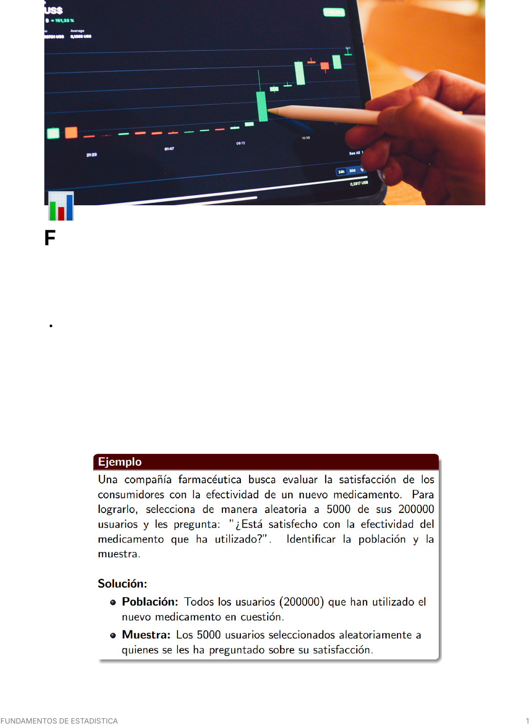 FUNDAMENTOS DE ESTADISTICA 1 📊 FUNDAMENTOS DE ESTADISTICA Febrero 2 | 2024 ¿Qué es la Estadística? Es la ciencia de recolectar, organizar, analizar e interpretar información. Las estadísticas son números obtenidos de un conjunto o colección de informaciones. Términos: � Población: Es el total de la información o de los objetos de interés para un estadístico en una investigación particular. � Muestra: es cualquier subconjunto de una población. � Dato: Es un numero o denominaciones que podemos asignar a un individuo o elemento de la población. FUNDAMENTOS DE ESTADISTICA 2 Otro término: PARAMETRO ESTADISTICO PROMEDIO μ X VARIANZA σ² S² DESVIACION ESTANDAR σ S PROPORCION π P Una variable aleatoria puede salir de una pregunta. FUNDAMENTOS DE ESTADISTICA 3 Estadística Descriptiva La estadística descriptiva está formada por los mátodos gráficos y numéricos que se utilizan para resumir y procesar los datos y transformarlos en información. Clasificación de Datos FUNDAMENTOS DE ESTADISTICA 4 Febrero 8 | 2024 FUNDAMENTOS DE ESTADISTICA 5 Ejemplo: Frecuencia: Frecuencia Relativa: Frecuencia Acumulada: Frecuencia Relativa Acumulada: FUNDAMENTOS DE ESTADISTICA 6 Tablero en Clase: Febrero 9 | 2024 Ejemplo FUNDAMENTOS DE ESTADISTICA 7 FUNDAMENTOS DE ESTADISTICA 8 Ejemplo: FUNDAMENTOS DE ESTADISTICA 9 Recorrido: Numero de Cargas 20.5 23.1 1 23.1 25.7 1 25.7 28.3 14 28,3 30,9 27 30,9 33,5 6 33,5 36,1 0 36,1 38,7 1 Fr Fa Fra F% F%Acum. 1/500.02 1 0.02 2% 2% 1/500.02 2 0.04 2% 4% 14/500.28 16 0.32 28% 32% 27/500.54 43 0.86 54% 86% 6/500.12 49 0.98 12% 98% 0/500 49 0.98 0% 98% 1/500.02 50 1 2% 100% 50/501 100% Febrero 16 | 2024 Investigar: ¿Qué tipo de tabla o grafica hago si… � Comparo dos variables categoricas? � Comparo una variable categorica vs numérica? � Variable numérica vs variable numerica? FUNDAMENTOS DE ESTADISTICA 10 FUNDAMENTOS DE ESTADISTICA 11 Ejercicio para Mandar: FUNDAMENTOS DE ESTADISTICA 12 Febrero 22 | 2024 FUNDAMENTOS DE ESTADISTICA 13 Marzo 1 | 2024 FUNDAMENTOS DE ESTADISTICA 14 FUNDAMENTOS DE ESTADISTICA 15 Solución más explicada: FUNDAMENTOS DE ESTADISTICA 16 Edad fi mi mi fi mi - μ (mi - μ2 fi (mi - μ2 02 7 1 7 3 9 63 24 8 3 24 1 1 8 46 8 5 40 1 1 8 68 7 7 49 3 9 63 30 120 142 μ≈120/304 La edad promedio es aproximadamente 4, con una desviación estándar de 2,18 FUNDAMENTOS DE ESTADISTICA 17 Percentil y Cuartiles: ¿Cómo se calculan los Cuartiles? FUNDAMENTOS DE ESTADISTICA 18 FUNDAMENTOS DE ESTADISTICA 19 Marzo 8 | 2024 FUNDAMENTOS DE ESTADISTICA 20 Marzo 15 | 2024 CORRELACIÓN FUNDAMENTOS DE ESTADISTICA 21 FUNDAMENTOS DE ESTADISTICA 22 FUNDAMENTOS DE ESTADISTICA 23 =0.92 FUNDAMENTOS DE ESTADISTICA 24 Abril 5 | 2024 Probabilidad: Teoría de Conjuntos. FUNDAMENTOS DE ESTADISTICA 25 FUNDAMENTOS DE ESTADISTICA 26 FUNDAMENTOS DE ESTADISTICA 27 FUNDAMENTOS DE ESTADISTICA 28 SOLUCIÓN B∩C 4, 6 A∪D 0, 1, 2, 3, 8, 9 S∩B 4, 5, 6, 7 SOLUCION a� Abril 11 | 2024 FUNDAMENTOS DE ESTADISTICA 29 FUNDAMENTOS DE ESTADISTICA 30 FUNDAMENTOS DE ESTADISTICA 31 Abril 12 | 2024 FUNDAMENTOS DE ESTADISTICA 32 FUNDAMENTOS DE ESTADISTICA 33 Abril 18 | 2024 FUNDAMENTOS DE ESTADISTICA 34 Para Hacer: FUNDAMENTOS DE ESTADISTICA 35 FUNDAMENTOS DE ESTADISTICA 36 Abril 19 | 2024 FUNDAMENTOS DE ESTADISTICA 37 FUNDAMENTOS DE ESTADISTICA 38 FUNDAMENTOS DE ESTADISTICA 39 FUNDAMENTOS DE ESTADISTICA 40 Mayo 3 | 2024 Mayo 9 | 2024 FUNDAMENTOS DE ESTADISTICA 41