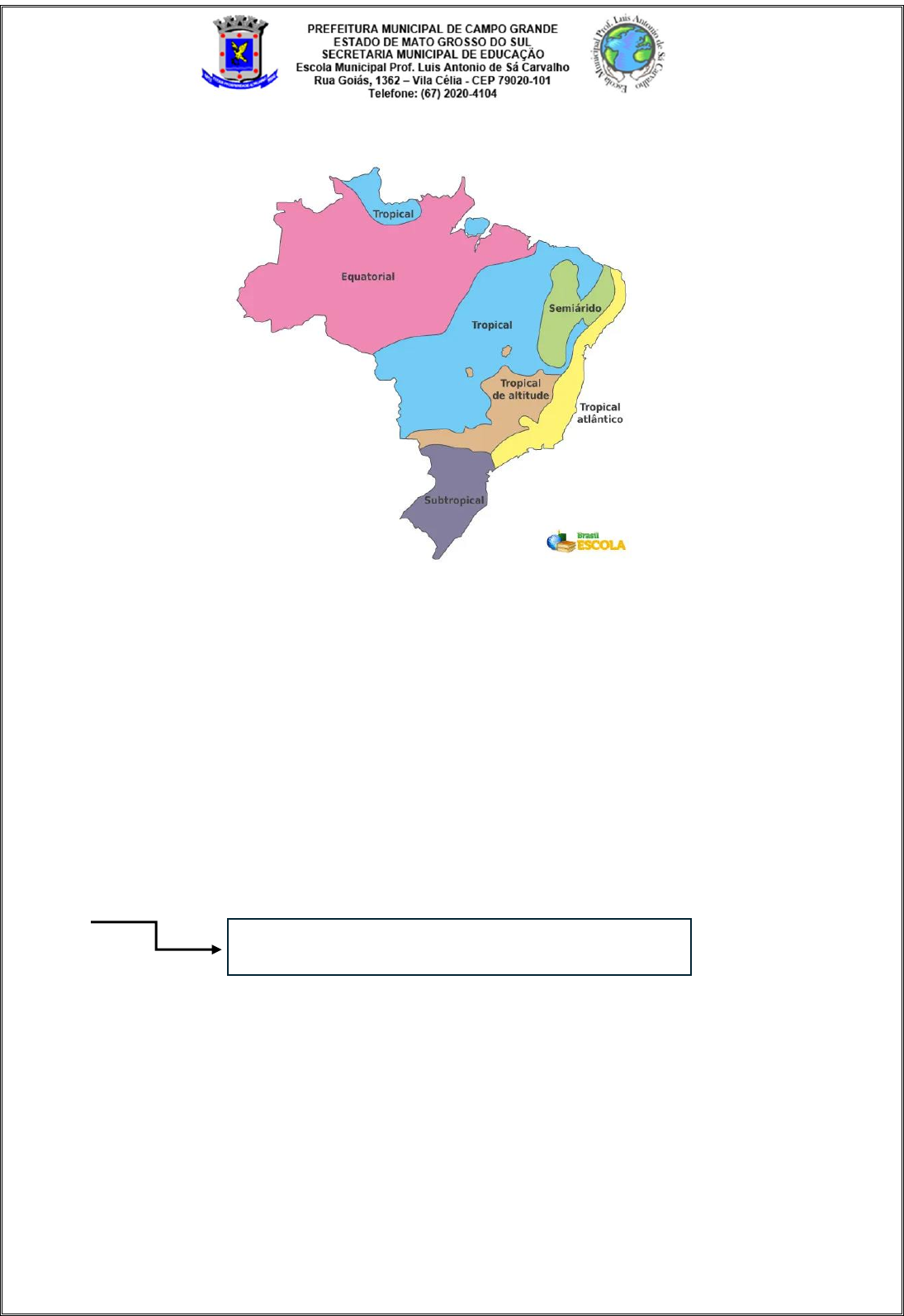 ATIVIDADE DE GEOGRAFIA - TIPOS DE CLIMA NO BRASIL Clima é o conjunto de variações do tempo de uma determinada localidade. Quanto mais próximo a Linha do Equador onde os raios solares têm maior incidência mais quente será o clima do lugar. A maior parte do Brasil está localizada entre a Linha do Equador e o Trópico de Capricórnio, por isso podemos dizer que o clima predominante é o tropical – quente e úmido. O brasil apresenta uma grande extensão territorial, ao longo de todo este território podemos perceber uma grande diversidade climática. O clima equatorial está presente na Amazônia, ao norte de Mato Grosso e ao oeste do Maranhão. Podemos dizer que as estações do ano nessa região são praticamente inexistentes, pois a temperatura se mantém estável ao longo do ano, as temperaturas médias são elevadas, tem chuvas durante o ano todo, e a amplitude térmica é baixa. A floresta Amazônica contribui ativamente para a produção de umidade da região, através do processo de evaporação da água da vegetação para o meio ambiente. O clima tropical uma das principais características desse clima é apresentar duas estações do ano bem definidas: uma seca e outra chuvosa, sendo que a chuvosa ocorre no verão e a seca no inverno. Este clima predomina na região mais central do Brasil, caracteriza-se também pela temperatura elevada e amplitude térmica entre 5º e 7º graus. O clima tropical semiárido este clima atinge parte do nordeste, sertão e norte de Minas Gerais. Ele pode ser caracterizado por temperaturas muito altas e por períodos de estiagem, ou seja, longos períodos sem chuva com a umidade do ar extremamente baixa. O clima desta região é tão seco devido a influência do Planalto Borborema, este planalto não permite que as massas de ar úmidas vindas do oceano cheguem ao interior, funcionando como um bloqueio de grande altitude, impedindo que chova no sertão nordestino. O que é amplitude térmica? Diferença entre valores máximos e mínimos de temperatura. O clima tropical litorâneo abrange o litoral do nosso país mais precisamente a faixa litorânea entre Rio Grande do Norte e São Paulo. Essa região sofre ação direta da massa tropical atlântica que provoca chuvas intensas e um clima bem quente. O clima tropical de altitude esse clima ocorre em locais com altitude superior a 500 metros, é comum em áreas serranas, especialmente na região Sudeste. Devido a essa altitude elevada as temperaturas são mais baixas, atingindo a média inferior a 18º, é comum nessa região termos um verão quente e inverno com geadas. O clima subtropical característico da região sul do Brasil. Esse clima apresenta sazonalidade, isso significa que as quatro estações do ano são bem demarcadas, destacando o verão quente e úmido e o inverno rigoroso com baixas temperaturas, sendo possível a ocorrência de geadas e até neve. Nessa região as chuvas costumam ser bem distribuídas ao longo do ano. Por ser um país muito extenso de norte a sul, o Brasil possui vários tipos de clima. Além de estar inserido em duas zonas térmicas, a proximidade do mar, as diferentes altitudes as massas de ar, a passagem das correntes marítimas e a vegetação também influenciam no clima brasileiro. 1. Qual é o clima que predomina no estado em que você vive? ________________________________________________________________ 2. O segundo mais extenso domínio natural brasileiro caracteriza-se por estar associado ao clima tropical, que possui estações bem definidas, com verões chuvosos e longas estiagens no inverno; quanto à vegetação, predominam formações arbustivas que cobrem solos ácidos. O texto apresenta características do seguinte domínio natural; a) Mata de Araucária. d) Mares de Morro. b) Caatinga. e) Amazônico. c) Cerrado. 3. O principal tipo climático brasileiro é conhecido pela ocorrência de duas estações bem definidas: uma quente e úmida e outra mais amena e seca. Esse é o clima a) equatorial. d) mediterrâneo. b) subtropical. e) desértico. c) tropical. 4. O clima equatorial ocorre predominantemente na porção norte do território brasileiro. Esse tipo climático tem como característica a a) ocorrência de poucas chuvas. c) precipitação pontual de chuvas. b) elevada presença de umidade. d) existência de plantas xerófilas. e) diminuta temperatura regional. 5. Qual tipo climático está localizado abaixo da porção do território brasileiro cortada pelo Trópico de Capricórnio? a) Semiárido. c) Tropical. b) Mediterrâneo. d) Subtropical. e) Equatorial. 6. A subdivisão do clima tropical que ocorre nos planaltos mais elevados da porção sudestina brasileira, com destaque para a formação de serras, é chamado de a) Subtropical. c) Tropical Atlântico. b) Tropical de Altitude. d) Tropical Semiárido. e) Temperado. 7. Um elemento que descreve um aspecto do clima subtropical é a(o): a) presença de índices pluviométricos constantes ao longo do ano. b) registro de temperaturas baixas somente durante o inverno. c) medição de baixos volumes de umidade em todo o ano. d) prevalência de grandes volumes de chuva apenas no outono. e) predominância de baixa ocorrência de chuvas durante o verão. 8. Em relação aos tipos de clima no Brasil, relacione corretamente o clima (coluna 1) com a região onde é encontrado (coluna 2). CLIMA REGIÃO BRASILEIRA 1. Equatorial a. Típico da Região Nordeste 2. Tropical b. Predominante na Região Norte e em parte da Região Centro-Oeste 3. Tropical de Altitude c. Predominante em grande parte do litoral brasileiro 4. Tropical Atlântico d. Encontrado na região central do Brasil e predominante na Região Centro-Oeste 5. Subtropical e. Predominante nas áreas serranas da Região Sudeste 6. Tropical Semiárido f. Predominante na Região Sul A sequência correta é: _________________________________________________________ 9. Identifique qual clima da coluna 1 apresenta as características descritas na c