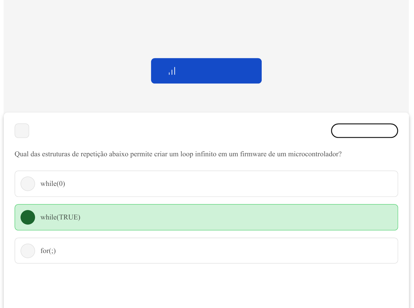 Você acertou 0 de 5 questões Verifique o seu desempenho e continue treinando! Você pode refazer o exercício quantas vezes quiser. Verificar Desempenho A B C 1 Marcar para revisão Qual das estruturas de repetição abaixo permite criar um loop infinito em um firmware de um microcontrolador? while(0) while(TRUE) for(;) 27/05/2024, 21:22 estacio.saladeavaliacoes.com.br/exercicio/665523c5689ede0840c19114/gabarito/ https://estacio.saladeavaliacoes.com.br/exercicio/665523c5689ede0840c19114/gabarito/ 1/7 D E while(NULL) for(1); Questão não respondida Opa! A alternativa correta é a letra B. Confira o gabarito comentado! Gabarito Comentado A alternativa correta é a opção B: "while(TRUE)". Na linguagem de programação, a estrutura de repetição "while(TRUE)" cria um loop infinito, pois a condição para a repetição (TRUE) é sempre atendida. Isso significa que o loop continuará a ser executado indefinidamente, a menos que seja interrompido por algum comando de interrupção. As outras opções não criam um loop infinito, pois suas condições não são sempre atendidas. 2 Marcar para revisão Podemos incorporar diferentes dispositivos a um microcontrolador para se alcançar um objetivo preestabelecido. Sobre as ferramentas para desenvolvimento de um projeto, podemos dizer que um dispositivo LED em um projeto com microcontroladores atua como um simples: 27/05/2024, 21:22 estacio.saladeavaliacoes.com.br/exercicio/665523c5689ede0840c19114/gabarito/ https://estacio.saladeavaliacoes.com.br/exercicio/665523c5689ede0840c19114/gabarito/ 2/7 A B C D E sensor atuador simulador emulador mostrador Questão não respondida Opa! A alternativa correta é a letra E. Confira o gabarito comentado! Gabarito Comentado O dispositivo LED em um projeto com microcontroladores atua como um simples mostrador. Isso significa que o LED, ou Diodo Emissor de Luz, é utilizado para fornecer indicações visuais ao usuário. Por exemplo, ele pode acender para indicar que o dispositivo está recebendo ou transmitindo dados, ou para sinalizar o status de operação de um sistema. Portanto, a alternativa correta é a letra E: "mostrador". 27/05/2024, 21:22 estacio.saladeavaliacoes.com.br/exercicio/665523c5689ede0840c19114/gabarito/ https://estacio.saladeavaliacoes.com.br/exercicio/665523c5689ede0840c19114/gabarito/ 3/7 A B C D E 3 Marcar para revisão Um vinculador (linker) em um processo de compilação_________________. Vincula arquivos-fonte em um único arquivo-fonte. Vincula arquivos executáveis em um único arquivo executável. Vincula código assembly com código em C. Vincula arquivos-objeto em um único arquivo-objeto. Vincula dois ou mais arquivos em linguagem C. Questão não respondida Opa! A alternativa correta é a letra D. Confira o gabarito comentado! Gabarito Comentado 27/05/2024, 21:22 estacio.saladeavaliacoes.com.br/exercicio/665523c5689ede0840c19114/gabarito/ https://estacio.saladeavaliacoes.com.br/exercicio/665523c5689ede0840c19114/gabarito/ 4/7 A B C D E O papel de um vinculador (linker) em um processo de compilação é unir diferentes arquivos-objeto para formar um único arquivo-objeto. Esses arquivos-objeto são gerados pelo compilador a partir dos arquivos de código-fonte. Portanto, a alternativa correta é a D: "Vincula arquivos-objeto em um único arquivo-objeto". 4 Marcar para revisão Que fator de vantagem a linguagem C acrescentou ao desenvolvimento com microcontroladores com relação à linguagem de montagem? Portabilidade de código Tamanho menor de código Manipulação de bits Melhor desempenho Tamanho de executável menor 27/05/2024, 21:22 estacio.saladeavaliacoes.com.br/exercicio/665523c5689ede0840c19114/gabarito/ https://estacio.saladeavaliacoes.com.br/exercicio/665523c5689ede0840c19114/gabarito/ 5/7 A B C Questão não respondida Opa! A alternativa correta é a letra A. Confira o gabarito comentado! Gabarito Comentado A alternativa correta é a "Portabilidade de código". A linguagem C, quando comparada à linguagem de montagem, oferece a vantagem de portabilidade de código. Isso significa que o código escrito em linguagem C pode ser facilmente transferido e utilizado em diferentes plataformas de hardware, sem a necessidade de grandes modificações. Isso é especialmente útil no desenvolvimento com microcontroladores, onde a flexibilidade e a capacidade de reutilização de código são fatores importantes. Portanto, a portabilidade de código é um fator de vantagem significativo que a linguagem C acrescentou ao desenvolvimento com microcontroladores. 5 Marcar para revisão Como instruir o processo de compilação de um programa em C com as definições do microcontrolador usado? Com #define Com declaração de variáveis Com #include 27/05/2024, 21:22 estacio.saladeavaliacoes.com.br/exercicio/665523c5689ede0840c19114/gabarito/ https://estacio.saladeavaliacoes.com.br/exercicio/665523c5689ede0840c19114/gabarito/ 6/7 D E Com funções Com estruturas de repetição Questão não respondida Opa! A alternativa correta é a letra C. Confira o gabarito comentado! Gabarito Comentado A alternativa correta é a letra C, que indica o uso do #include. No contexto de um programa em C, o #include é uma diretiva de pré-processamento que é usada para inserir o conteúdo de um arquivo específico no ponto onde a diretiva é encontrada. Isso é especialmente útil quando se trabalha com microcontroladores, pois permite que as definições específicas do microcontrolador sejam incluídas no programa, facilitando assim o processo de compilação. 27/05/2024, 21:22 estacio.saladeavaliacoes.com.br/exercicio/665523c5689ede0840c19114/gabarito/ https://estacio.saladeavaliacoes.com.br/exercicio/665523c5689ede0840c19114/gabarito/ 7/7