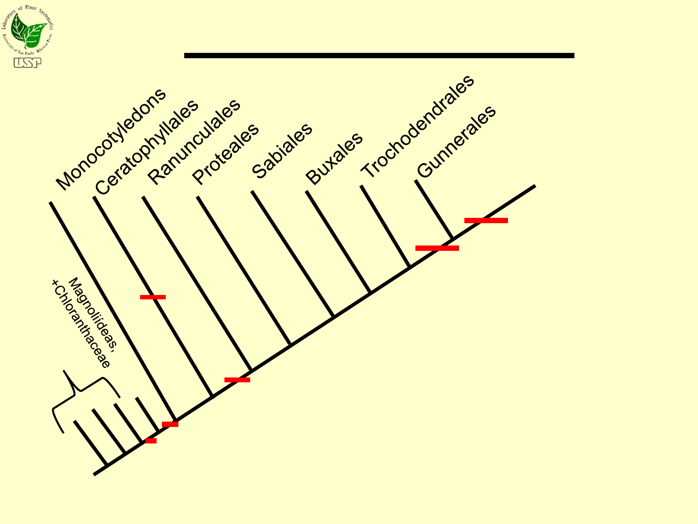Rosids, Asterids, Caryophyllales, other groups 3-colpate pollen grains (Eudicotyledoneae, Tricolpatae) Dichlamydeous-heterochlamydeous flowers (Gunneridae) Pentapetalae (4- 5-merous flowers) Based on APG IV (2016) ANA Grade Consistently cyclic flowers (dominating syncarpy) * * Inaperturate pollen grains Eudycotiledons Carpel closed by union of tissues (Mesangiospermae) Grado ANA Magnoliids Magnolia – flower tepals stamens carpels Magnolia – laminar stamens Open anthers Magnolia – gynoecium in longitudinal secction carpel stigma ovules Rosids, Asterids, Caryophyllales, other groups 3-colpate pollen grains (Eudicotyledoneae, Tricolpatae) Dichlamydeous-heterochlamydeous flowers (Gunneridae) Pentapetalae (4- 5-merous flowers) Based on APG IV (2016) ANA Grade Consistently cyclic flowers (dominating syncarpy) * * Inaperturate pollen grains Eudycotiledons Carpel closed by union of tissues (Mesangiospermae) Aciclic or hemiciclic flowers (some elements in whorls) Cyclic flowers (all elements in whorls) Paeonia californica (Ranunculaceae) Narcissus (Amaryllidaceae) Apocarpic gynoecium Sincarpic gynoecium Rosids, Asterids, Caryophyllales, other groups 3-colpate pollen grains (Eudicotyledoneae, Tricolpatae) Dichlamydeous-heterochlamydeous flowers (Gunneridae) Pentapetalae (4- 5-merous flowers) Based on APG IV (2016) ANA Grade Consistently cyclic flowers (dominating syncarpy) * * Inaperturate pollen grains Eudycotiledons Carpel closed by union of tissues (Mesangiospermae) Rosids, Asterids, Caryophyllales, other groups 3-colpate pollen grains (Eudicotyledoneae, Tricolpatae) Dichlamydeous-heterochlamydeous flowers (Gunneridae) Pentapetalae (4- 5-merous flowers) Based on APG IV (2016) ANA Grade Consistently cyclic flowers (dominating syncarpy) * * Inaperturate pollen grains Eudycotiledons Carpel closed by union of tissues (Mesangiospermae) Monocotyledons: 3-merous flowers, homochlamidious diclamideous (calyx and corolla distinguishable, but similar to each other) – LILIOD PERIANTH Gunneridae Gunneridae: 2 or 4-5-merous diclamyddeous- heteroclamydeous- Rosids, Asterids, Caryophyllales, other groups 3-colpate pollen grains (Eudicotyledoneae, Tricolpatae) Dichlamydeous-heterochlamydeous flowers (Gunneridae) Pentapetalae (4- 5-merous flowers) Based on APG IV (2016) ANA Grade Consistently cyclic flowers (dominating syncarpy) * * Inaperturate pollen grains Eudycotiledons Carpel closed by union of tissues (Mesangiospermae) Monocotiledôneas O que são monocotiledôneas? Plantas com 1 cotilédone na semente Fósseis: 120-110 m.a. (grãos de pólen – começo do Cretáceo), ca.10 milhões de anos mais recentes que pólens atribuídos a angiospermas) Pólen de Aponogeton (Alismatales) do Cretáceo (Grimsson et al. 2014) Ca. 22% das angiospermas (+-52.000 espécies) Grupo monofilético inserido entre as dicotiledôneas (que é um grupo parafilético) Sistema de Bessey (1915) Sistema de Cronquist (1981) Monocotiledôneas: grupo estável nas classificações Rosídeas, Asterídeas, Caryophyllales, e outros grupos Pólen 3-colpado (Eudicotiledôneas, Eudicotyledoneae, Tricolpatae) Core eudicots (ou core tricolpates)- Gunneridae – flores consistentemente diclamídeas-heteroclamídeas Pentapetalae (flores 4-5-meras) Baseado em APG III (2009) Carpelo fechado por união de tecidos (Mesangiospermae) Grado ANITA Flores consistentemente cíclicas (sincarpia dominante) * * Pólen inaperturado (sem aberturas) Eudicotiledôneas APG IV (2016) – main groups Eudicots: Early divergence lineages Superrosids (and Rosids) Superasteridae (and Asterids) Caryophyllales Eudicotyledoneae (or Tricolpatae) Pentapetalae Gunneridae (Core Eudicots) Mesangiospermae ANA Grade Magnoliids Monocotyledons Ceratophyllum Sistema APGIV (2016) Monocotiledôneas: classificação atual____________________________________________________________________ 11 ordens (APG IV 2016) Sinapomorfias prováveis: 1. Presença de um cotilédone (única não homoplástica) 2. Corpos protéicos triangulares nos plastídeos dos elementos de tubo crivado 3. Sistema vascular atactostélico 4. Raízes fasciculadas, adventícias, sem crescimento secundário 5. Folhas com nervação paralelinérvea 6. Endosperma geralmente helobial Sinapomorfias prováveis: 1. Presença de um cotilédone (única não homoplástica) Sinapomorfias prováveis: 2. Corpos protéicos triangulares nos plastídeos dos elementos de tubo crivado Sinapomorfias prováveis: 3. Sistema vascular caulinar atactostélico xilema floema feixe Atactostele (apomorfia) Eustele (plesiomorfia) Sinapomorfias prováveis: 4. Raízes fasciculadas, adventícias (que ADVÉM do caule) sem crescimento secundário Formação do sistema fasciculado por aborto da raiz primária (presente no embrião) com quebra da dominância hormonal no milho (Zea – Poaceae, acima) X manutenção da raiz primária na soja (Glycine – Leguminosae) - plesiomorfia Sinapomorfias prováveis: 5. Folhas com nervação paralelinérvea (paralelódroma) Sinapomorfias prováveis: 6. Endosperma geralmente helobial copra – noz do coco Outras duas características que ocorrem em grupos próximos ou são plesiomorfias: 1. Pólen 1-aperturado (plesiomorfia) 2. Flores 3-meras (homoplasia ou simplesiomorfia?) 3-aperturate pollen grain: apomorphic to the EudicotyledonsAPG IV (2016) – main groups Eudicots: Early divergence lineages Superrosids (and Rosids) Superasteridae (and Asterids) Caryophyllales Eudicotyledoneae (or Tricolpatae) Pentapetalae Gunneridae (Core Eudicots) Mesangiospermae ANA Grade Magnoliids Monocotyledons Ceratophyllum Rosídeas, Asterídeas, Caryophyllales, e outros grupos Pólen 3-colpado (Eudicotiledôneas, Eudicotyledoneae, Tricolpatae) Core eudicots (ou core tricolpates)- Gunneridae – flores consistentemente diclamídeas-heteroclamídeas Pentapetalae (flores 4-5-meras) Baseado em APG IV (2016) Carpelo fechado por união de tecidos (Mesangiospermae) Grado ANA Flores consistentemente cíclicas (sincarpia dominante) * *