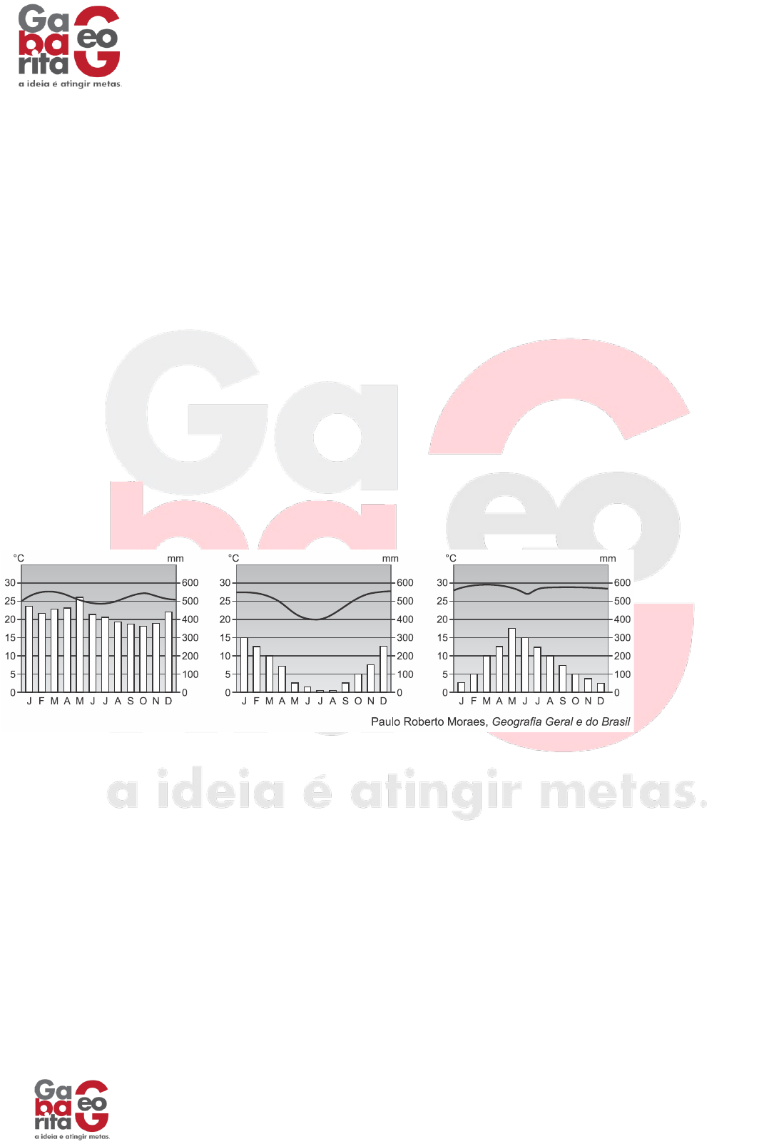 LISTAS DE EXERCÍCIOS WWW.GABARITAGEO.COM.BR Geografia – Climas do Brasil 1. A região sul do Brasil difere das demais regiões brasileiras no que diz respeito ao clima. Nesta região o clima é controlado por massas de ar tropicais e polares, e nas demais regiões do país os climas são controlados por massas de ar equatoriais e tropicais. Analise as proposições sobre o clima da região sul: I. Predomina a Massa Tropical Atlântica, que provoca chuvas abundantes, principalmente no verão. II. No inverno é frequente a penetração da frente polar, que dá origem a chuvas frontais – precipitações devidas ao encontro da massa quente com a fria, ocorrendo a condensação do vapor de água atmosférico. III. O índice médio anual de pluviosidade é alto, e as chuvas são bem distribuídas durante o ano, inexistindo uma estação seca. IV. É um clima que pode ser classificado como mesotérmico, isto é, de médias temperaturas. V. A amplitude térmica anual é elevada, a maior dos climas brasileiros. Assinale a alternativa correta. a) Somente as afirmativas III, IV e V são verdadeiras. b) Somente as afirmativas I e II são verdadeiras. c) Somente as afirmativas I e III são verdadeiras. d) Somente as afirmativas II, IV e V são verdadeiras. e) Todas as afirmativas são verdadeiras. 2. Os climogramas anteriores se referem, respectivamente, aos climas brasileiros: a) Tropical de altitude, Tropical e Tropical úmido. b) Equatorial Semiúmido, Tropical de altitude e Tropical Semiárido. c) Tropical Úmido, Equatorial Semiúmido e Equatorial úmido. d) Equatorial úmido, Tropical e Tropical úmido. e) Tropical, Subtropical e Tropical de altitude. LISTAS DE EXERCÍCIOS WWW.GABARITAGEO.COM.BR 3. Os climogramas 1, 2 e 3 referem-se a climas brasileiros, representando chuvas e temperaturas. É possível relacionar as variações desses parâmetros com determinadas práticas agrícolas que ocorrem em períodos específicos do ano. No caso das queimadas, certas condições ambientais relacionadas aos índices pluviométricos e às temperaturas favorecem essa prática. A partir dessa afirmativa e dos climogramas apresentados acima, são feitas as seguintes afirmações. I - O climograma 1 representa graficamente a zona de clima equatorial, sendo que a prática da queimada ocorre, principalmente, nos meses de agosto a outubro. II - O climograma 2 representa graficamente a zona de clima tropical, sendo que a prática da queimada ocorre, principalmente, nos meses se junho a agosto. III - O climograma 3 representa graficamente a zona de clima semiárido, sendo que a prática da queimada ocorre nos meses de março e abril. Quais estão corretas? a) Apenas I. b) Apenas II. c) Apenas I e II. d) Apenas II e III. e) I, II e III. 4. Observe o quadro que se refere a tipos de climas brasileiros, segundo W. Koppen. Assinale a alternativa que preencha corretamente os espaços I, II e III, respectivamente: a) a maior parte da Amazônia; chuvas no inverno e outono; Bsh b) litoral e interior da Região Sul; chuvas de verão e outono; Cfb c) sudeste de São Paulo e parte da Região Sul; chuvas de verão e seca de inverno; Cfa d) Amazônia Oriental; chuvas no verão e seca no inverno; Bsh LISTAS DE EXERCÍCIOS WWW.GABARITAGEO.COM.BR e) Região Sudeste e Mato Grosso do Sul; chuvas de verão e seca no inverno; Cwb 5. Leia o texto abaixo que apresenta as condições climáticas ideais para o cultivo do mirtilo. O mirtilo necessita de acúmulo de frio hibernal, para as espécies do tipo highbush que varia de 650 a 850 horas de temperatura inferior a 7,2 C e até 250 horas para o tipo Southern highbush. Para um bom teor de açúcar na fruta, o mirtilo requer até 50 mm de água, semanalmente, durante o período de desenvolvimento das frutas. O tipo rabbiteye, entretanto, apesar das raízes superficiais, é capaz de sobreviver a períodos de seca, devido a características adaptativas, como resistência estomatal, e ao consequente uso eficiente de água. O crescimento e a produção do mirtilo são consideradas diretamente proporcionais ao teor de matéria orgânica do solo. Adaptado de: <https://ainfo.cnptia.embrapa.br/digital/bitstream/item/32395/1/documento-96.pdf>. Acesso em: 27 ago. 2018. Observe o mapa dos tipos climáticos do Brasil. A partir da leitura do texto e da observação do mapa, assinale a alternativa que apresenta o lugar com as condições mais próximas do ideal para o cultivo do mirtilo do tipo highbush. a) Pelotas (RS) LISTAS DE EXERCÍCIOS WWW.GABARITAGEO.COM.BR b) Manaus (AM) c) Barretos (SP) d) Palmas (TO) e) Juazeiro (BA) LISTAS DE EXERCÍCIOS WWW.GABARITAGEO.COM.BR Gabarito: Resposta da questão 1: [E] Em razão da forte influência da maritimidade no clima da Região Sul, a mTa (Massa Tropical Atlântica), quente e úmida, é responsável pela boa distribuição de chuvas ao longo de todo o ano na região, com maior incidência nos meses de verão. As temperaturas anuais ficam em torno dos 20 graus Celsius e, nos meses de outono e inverno caem de forma acentuada em razão da chegada de massas polares do Atlântico (mPa) vindas do extremo sul do continente o que provoca grande variação térmica anual, a maior do Brasil, em toda a região, além da ocorrência das chuvas frontais, áreas de instabilidade atmosférica provocadas pelo encontro de massas de ar frio e quentes em curto período de tempo. Resposta da questão 2: [D] Resposta da questão 3: [C] Resposta da questão 4: [D] Resposta da questão 5: [A] Conforme o texto, o cultivo do mirtilo do tipo highbush precisa de temperaturas baixas, inferiores a 10 C e bons índices pluviométricos. Portanto, o clima subtropical, a exemplo do município de Pelotas na porção setentrional do Rio Grande do Sul, seria o que mais se aproxima das condições para o desenvolvimento da cultura do mirtilo.