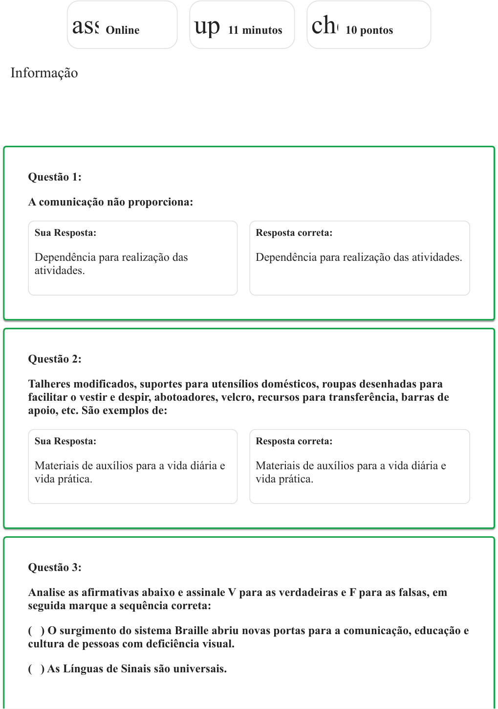 Rever Avaliação Comunicação Alternativa Tipo de avaliação Online Tempo utilizado 11 minutos Sua nota de avaliação 10 pontos Informação A contestação da questão poderá ser feita em até 7 dias após a realização da avaliação, clicando em "contestar questão", após este prazo não será mais permitido realizar a contestação. Descreva o porquê não concorda com o gabarito de cada questão baseando-se no material didático fornecido. ass up che Questão 1: A comunicação não proporciona: Sua Resposta: Dependência para realização das atividades. Resposta correta: Dependência para realização das atividades. Questão 2: Talheres modificados, suportes para utensílios domésticos, roupas desenhadas para facilitar o vestir e despir, abotoadores, velcro, recursos para transferência, barras de apoio, etc. São exemplos de: Sua Resposta: Materiais de auxílios para a vida diária e vida prática. Resposta correta: Materiais de auxílios para a vida diária e vida prática. Questão 3: Analise as afirmativas abaixo e assinale V para as verdadeiras e F para as falsas, em seguida marque a sequência correta: ( ) O surgimento do sistema Braille abriu novas portas para a comunicação, educação e cultura de pessoas com deficiência visual. ( ) As Línguas de Sinais são universais. 29/05/2024, 07:27 Rever Avaliação https://ava.institutoprominas.com.br/notas/rever-avaliacao 1/2 ( ) O Atendimento Educacional Especializado (AEE) é um atendimento que se assemelha ao da educação em escolas comuns. Sua Resposta: V-F-F Resposta correta: V-F-F Questão 4: Qual das opções completa o enunciado abaixo: “No sistema de _________________ e, principalmente, de leitura ________________, através de um método lógico de pontos em relevo, distribuídos em duas colunas de três pontos para cada símbolo ou letra, uma pessoa ____________ pode, através do tato das pontas de seus dedos, ler o que, com um aparelho especial denominado reglete e uma pulsão, “desenhou” anteriormente”. Sua Resposta: escrita – Braille – cega Resposta correta: escrita – Braille – cega Questão 5: A Comunicação Alternativa tem como objetivos auxiliar em: Sua Resposta: Todas as alternativas estão corretas Resposta correta: Todas as alternativas estão corretas 29/05/2024, 07:27 Rever Avaliação https://ava.institutoprominas.com.br/notas/rever-avaliacao 2/2