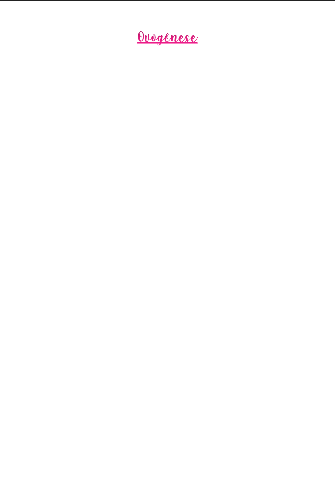 No ovário embrionário, as células germinativas são chamadas de ovogônias. A ovogônia completa a mitose e o estágio de duplicação do DNA da meiose no quinto mês de desenvolvimento fetal, dando origem aos ovócitos primários (4n – 92 cromossomos). Ao nascimento, cada ovário contém cerca de meio milhão de ovócitos primários. As melhores evidências indicam que, neste momento, a mitose das células germinativas cessa e nenhum ovócito adicional pode ser formado. No ovário, a meiose não é retomada até a puberdade. Se um ovócito primário se desenvolve, ele divide-se em duas células, um grande ovo (ovócito secundário) e um pequeno primeiro corpúsculo polar. Apesar da diferença de tamanho, tanto o ovócito secundário como o corpúsculo polar contêm 23 cromossomos duplicados (2n – 46 cromossomos). O primeiro corpúsculo polar degenera. Se o ovócito secundário é selecionado para a ovulação, a segunda divisão meiótica ocorre imediatamente antes de o ovócito ser liberado do ovário. As cromátides-irmãs separam-se, mas a meiose é interrompida mais uma vez. A etapa final da meiose, na qual cada cromátide-irmã vai para células separadas, não ocorre se o ovócito não for fertilizado. O ovário libera o ovócito maduro durante um processo chamado de ovulação. Se o ovócito não for fertilizado, a meiose nunca será completada, e o ovócito degenera. Se houver a fertilização por um espermatozoide, o passo final da meiose ocorre. Metade das cromátides- irmãs permanece no ovo fertilizado (zigoto), ao passo que a outra metade é liberada no segundo corpúsculo polar (1n). O segundo corpúsculo polar, assim como o primeiro, degenera. Como resultado da meiose, cada ovócito primário dá origem a somente um ovo.